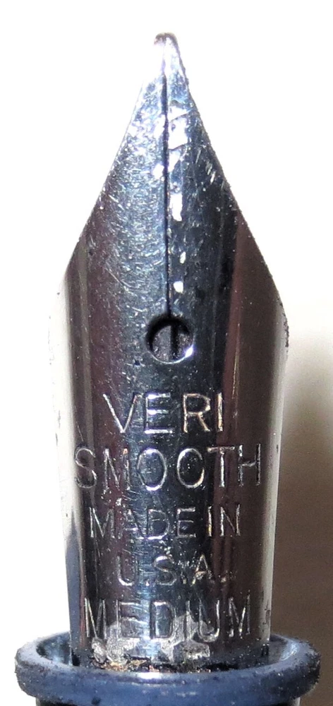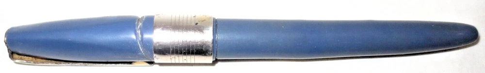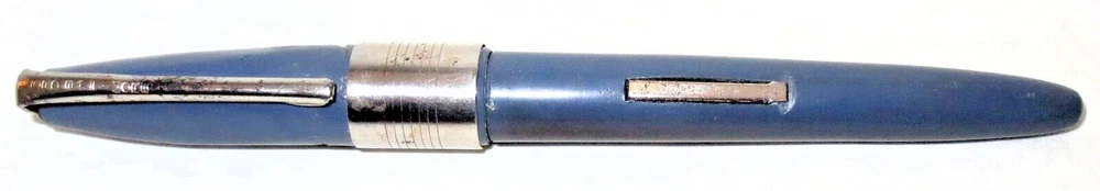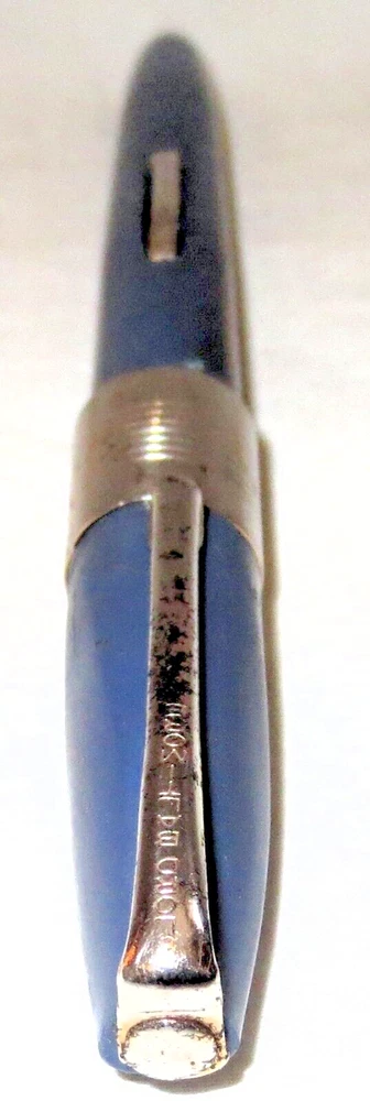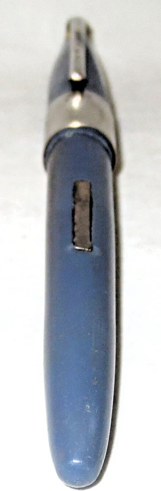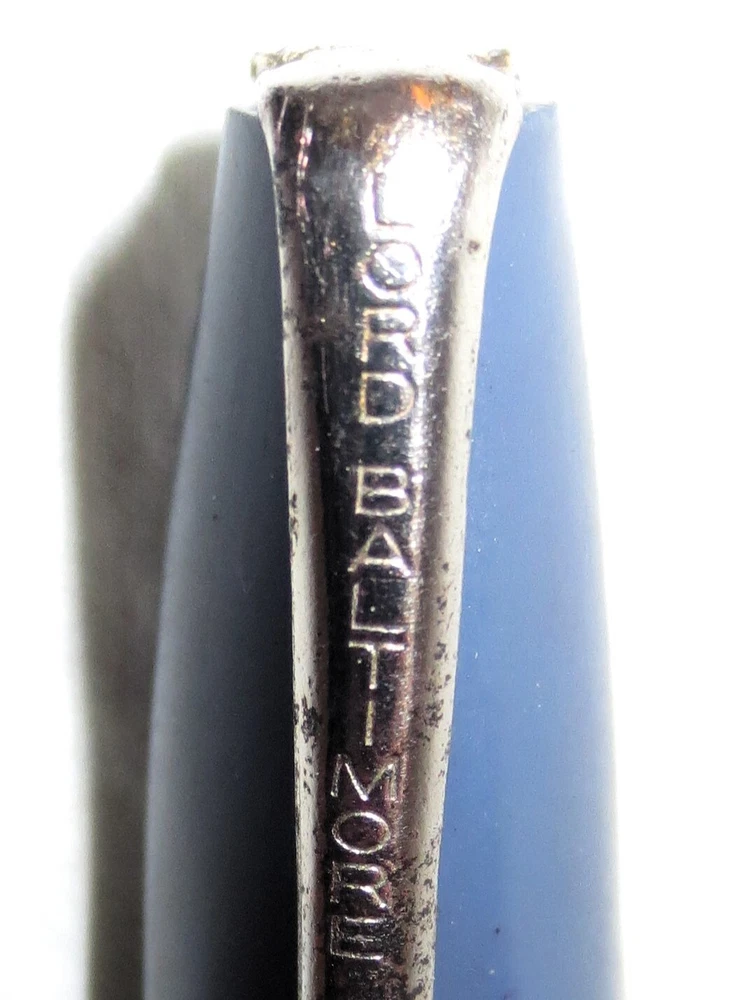 Vintage blue plastic Lord Baltimore lever fill fountain pen with chrome trim. 5-1/4" capped, 5" uncapped. Chrome pocket clip stamped "LORD BALTIMORE". The clip has some rust pitting. Cap has a unique triangular shape at the top that goes to round at the trim ring. A deep groove is in the cap above the ring. Stainless steel nib stamped "VERI---SMOOTH---MADE IN---U.S.A.---MEDIUM". There is some pitting along the ink flow groove, but the tip is okay. The pen's body has some fading, is warped a little, and the fill lever has rust pitting. If it has a bladder, it's probably unusable. Some believe this pen was sold through Rexall Drug Stores. Other vintage pens listed.