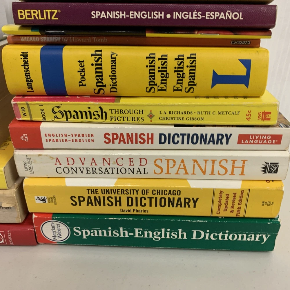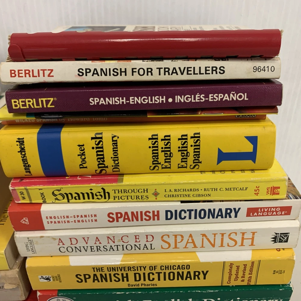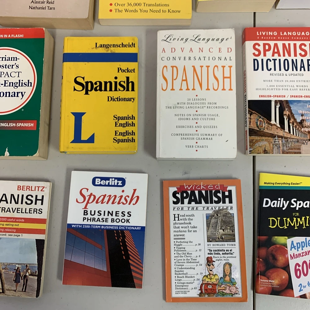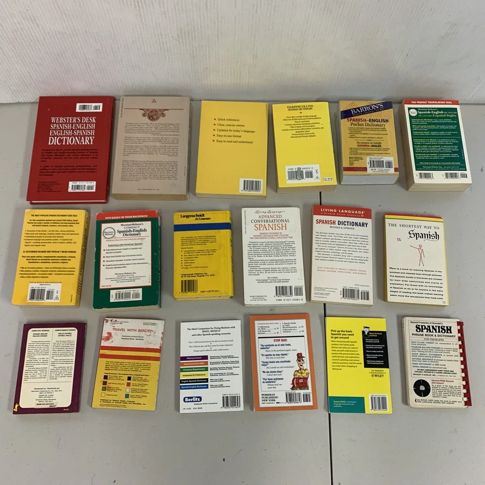 This lot includes 18 Spanish study books, dictionaries, and phrasebooks, perfect for anyone looking to improve their language skills. With a variety of formats, including paperback, these books cover a range of topics from travel to reference materials. May contain duplicates.