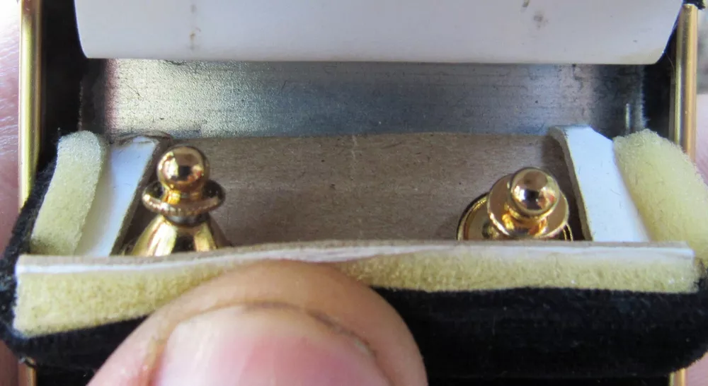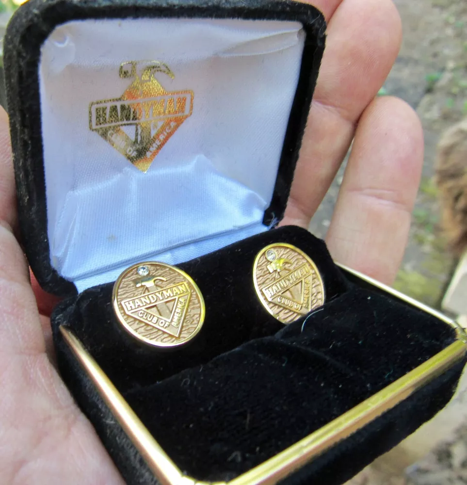 Submitted for your approval—and highest bid: Lot of two (2) different metal lapel pins featuring an artistic rendering of the logo for the Handyman Club of America on a membership award, manufactured in the 1980s. Each item measure s 5/8 inch at its longest point. This rare piece is in Very Good or better condition, with visible signs of light wear from handling, well preserved for its age . Mounting post and removable connector cap on reverse of both are near-pristine; each item is fully wearable on fabric. The original black felt-covered hardshell jewel case is included, which has some light scuffing on top. On the front of each pin is an oblong image of the do-it-yourselfers' club logo in raised design, with titles in stylized lettering and a diamond-like setting, all on a gold tone metal surface. See accompanying photos for detail. Observe the US coinage in one image for size comparison purposes. This hard-to-find collectible would make a great gift for the collector on your special list or a fine way to complete your own collection of quality display pieces. DISCLAIMERS: Featured auction item(s) comes from a non-smoking, pet-free environment. NOTE: For belt buckles, single jewelry pieces and other similarly-sized items (small packets) weighing 8 ounces or less, we ship anywhere in the world for a flat charge of 17.77 USD . Please email for more information or with any questions. And we DO combine shipping, so feel free to browse our other listings for added savings.
