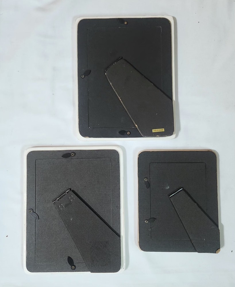 Very good condition. This lot consists of three vintage 1960s porcelain floral photo frames. The frames have a mid-century modernism style featuring floral patterns and an oval window design. They are suitable for 4x6 and 5x7 photos. Please see the photos for more details. Check out my other frames with combined shipping.