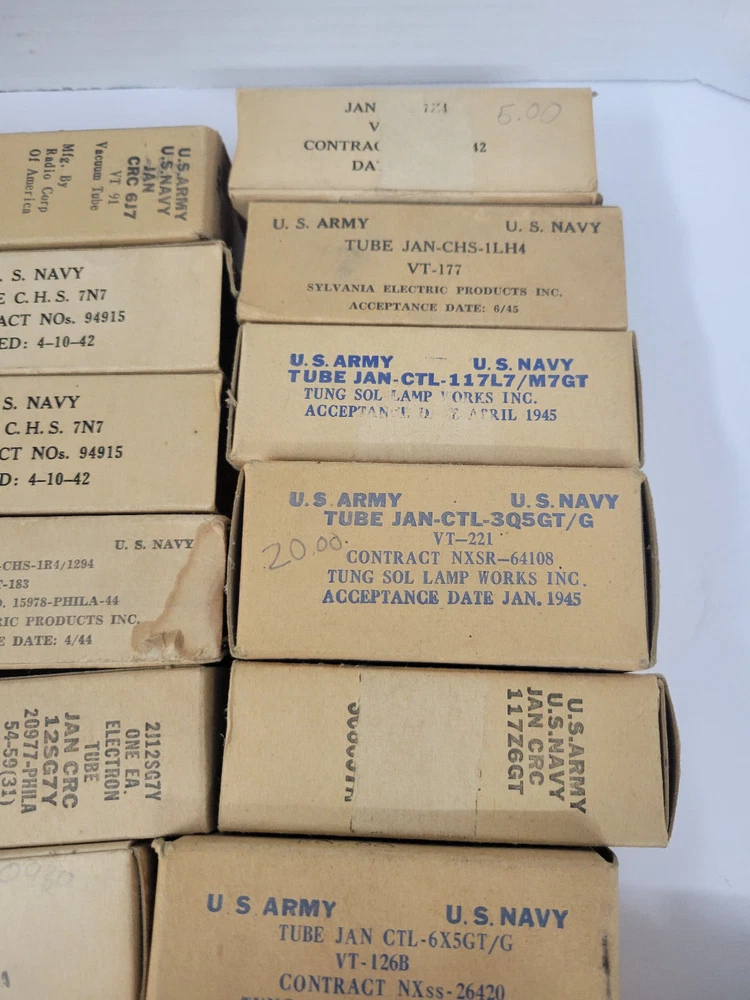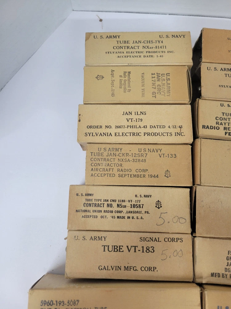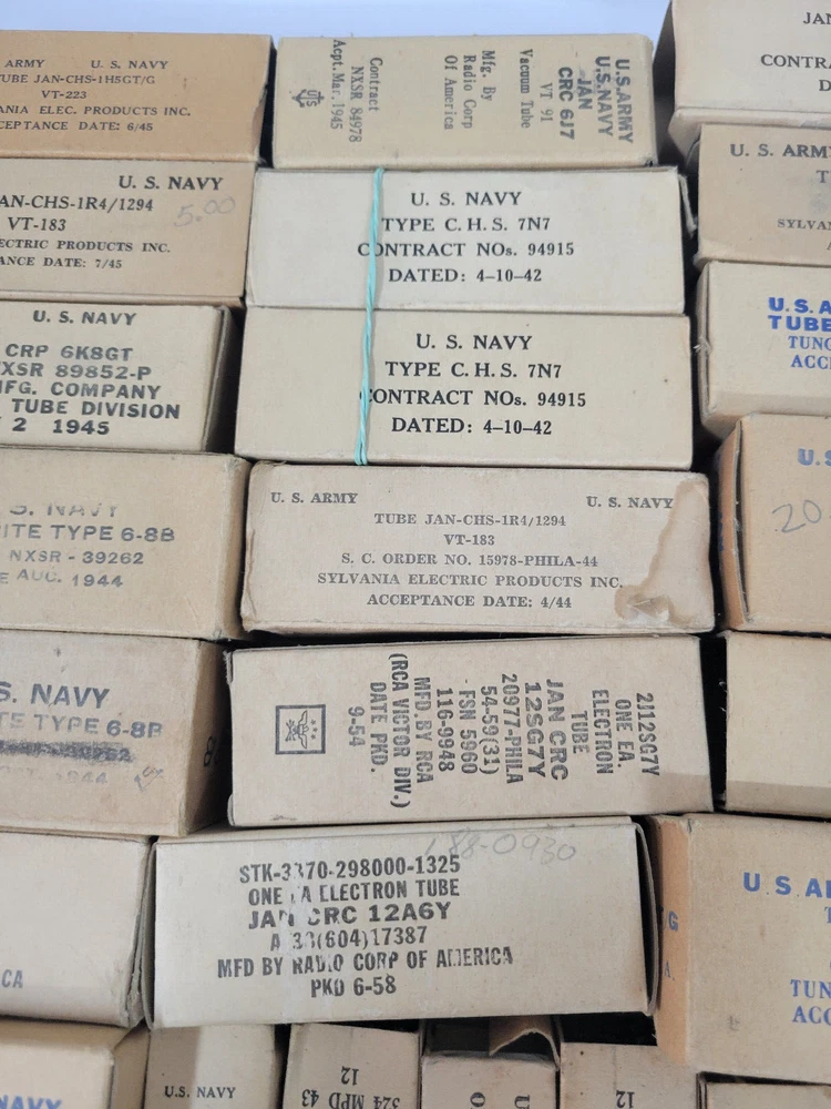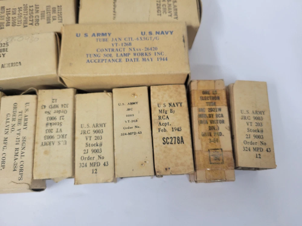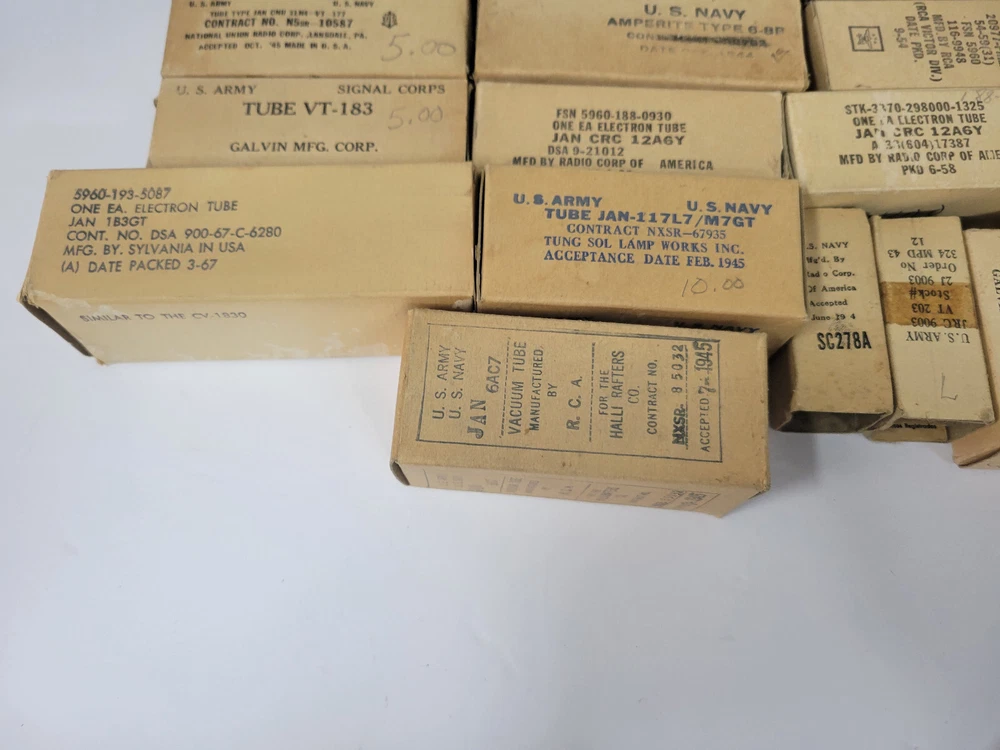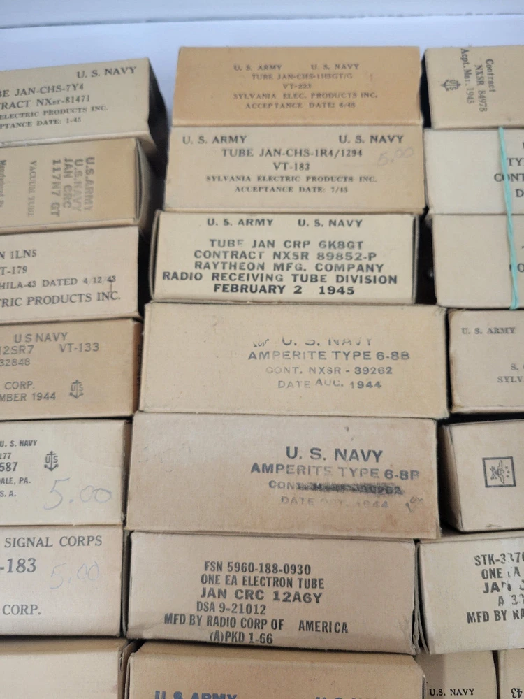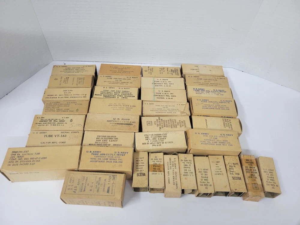 Vintage lot of 36 Army / Navy vacuum tubes. Acquired as new from the estate of a electronics repair shop. I haven't checked every one, but all that I have checked are good. I was told they were all new/unused. Item will ship within one business day of completed sale. I DO NOT ship media mail. All items will be securely packaged and will ship USPS Ground Advantage, Priority mail, UPS or Fedex depending on weight and size. I do offer a 30-day money back guarantee on almost every item I sell. If there are issues with your item, please return it for a refund. Refund will be issued upon return of item. Some restrictions may apply. It is always appreciated if you contact me before starting a return so that I can try and assist without the hassle of a return.