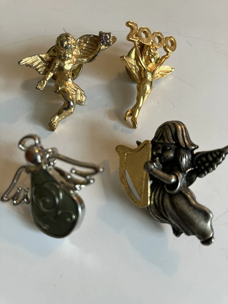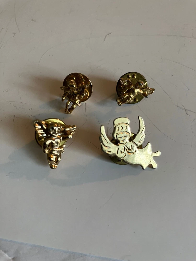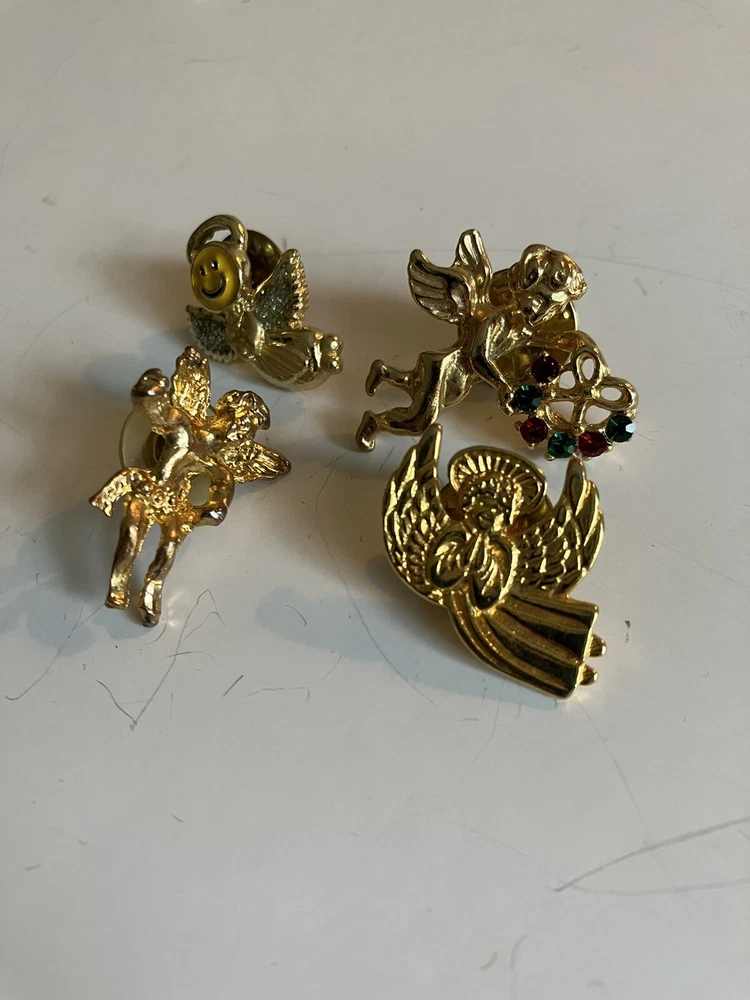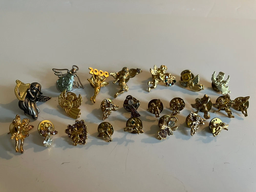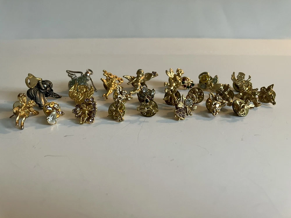 Lot of 23 mixed tiny religious guardians angel/cherub lapel or hat pins. Mostly gold tone but several silver tone and several with rhinestones, enamel, colored metal, or mixed look. All have their little pin covers/clutches. Assorted miniature sizes and poses. Minor wear. Thanks for looking. Now for the fine print…… I use the good old USPS for all shipping. Despite their recent increase in shipping rates, I try to charge fair shipping. On certain items I charge a $1.00 handling fee to offset the price of bubble wrap, boxes, Styrofoam peanuts, etc. I’m very happy to combine shipping on multiple items that you purchase. I ship every day; Monday through Friday (except for snow and ice events) but do not ship on Saturdays.
