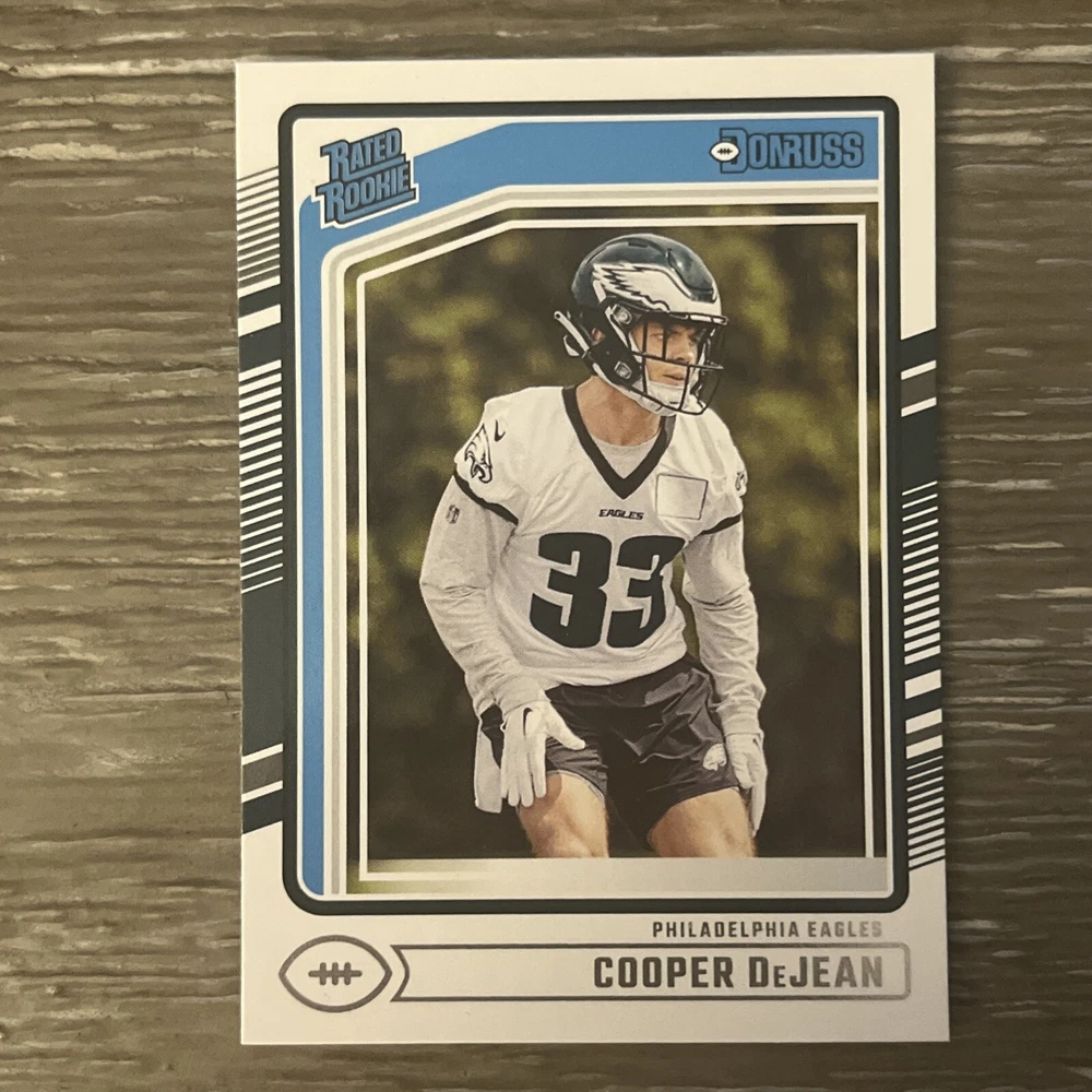 Year Manufactured:2024Sport:FootballLeague:National Football League (NFL)Autograph Authentication:DonrussManufacturer:PaniniCountry/Region of Manufacture:United StatesType:Sports Trading CardPlayer/Athlete:Quinyon Mitchell, Cooper DeJeanLanguage:EnglishCard Name:Cooper DeJean Rated Rookie, Quinyon Mitchell Rated RookieOriginal/Licensed Reprint:OriginalTeam:Philadelphia EaglesSet:2024 Panini DonrussFeatures:Rookie, Base SetMaterial:Card StockCard Size:StandardNumber of Cards:2Season:2024