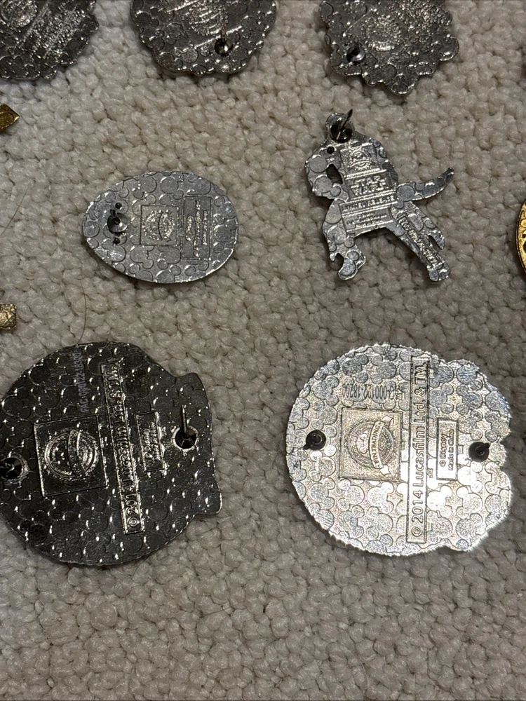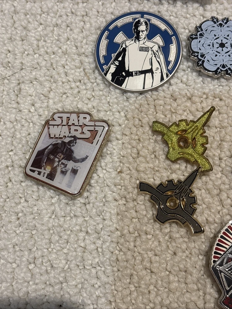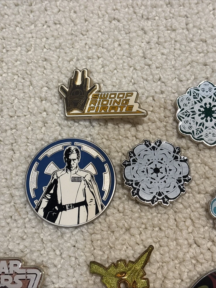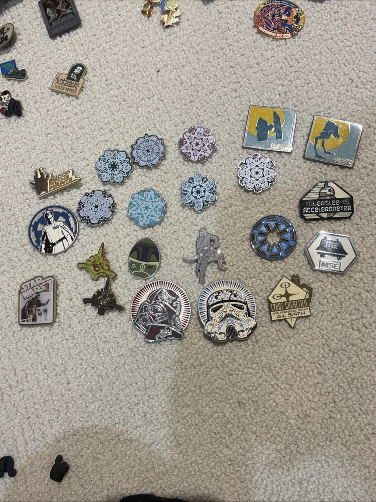 These are used star wars pins. This includes the 6 piece star wars snowflake set. Note that two pins have bent (but not wobbly) posts, as shown in photos.