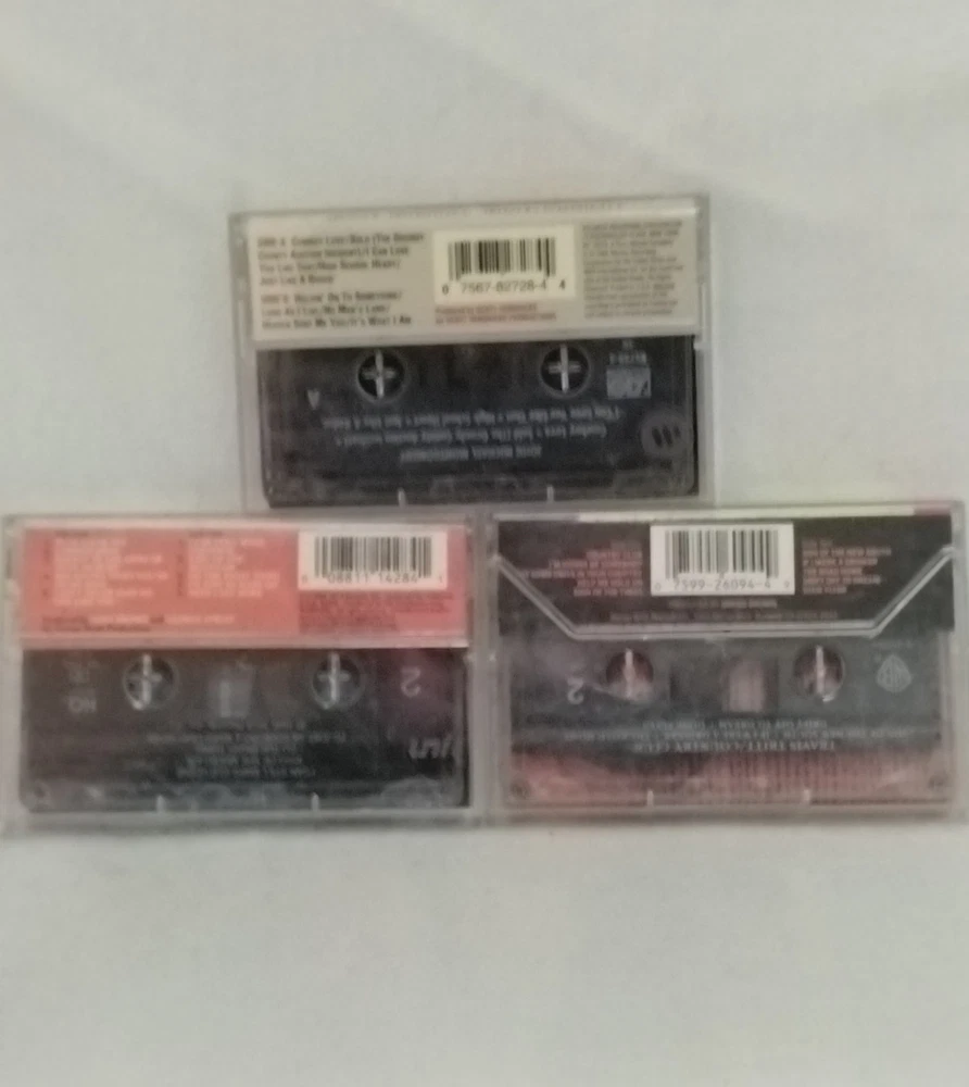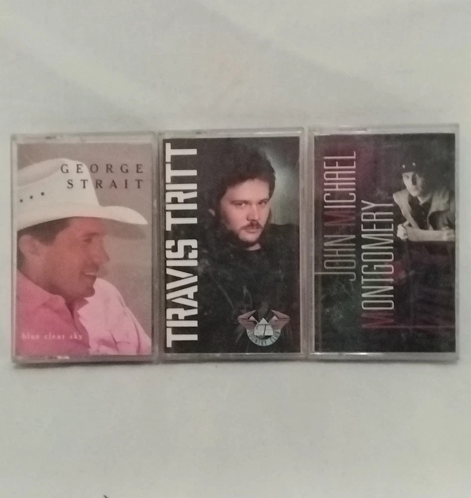 A lot of 3 vintage country music cassette tapes featuring artists like Travis Tritt, George Strait, and John Michael Montgomery. The release title is "Greatest Hits" and the format is cassette. The music style is contemporary country, and the tapes were released in the 80s and 90s in the United States. The language is English. These cassettes are are all in pretty good shape