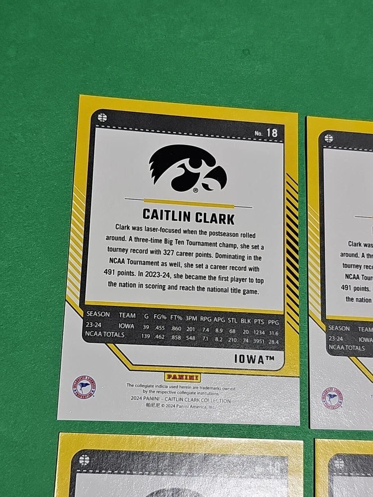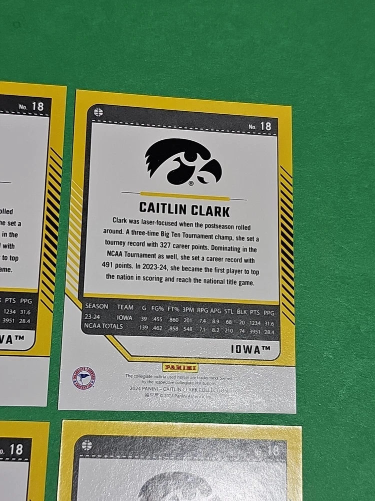 You will receive the exact cards pictured. This Lot of 4 Caitlin Clark Rookie 2024 Panini Donruss Iowa Hawkeyes Card No. 18. Pay only $1.50 for shipping on your first cards won & 50 cents per lot of cards won in auctions up to $5.00. $5.00 is the maximum shipping you will pay, no matter how many cards you win! Please wait until you are done with all your purchases and I will send a combined shipping invoice within 24 hours. Please check out all of my other great auctions going on now! I have several Caitlin Clark Auctions going on now! Thanks for looking & good luck!!