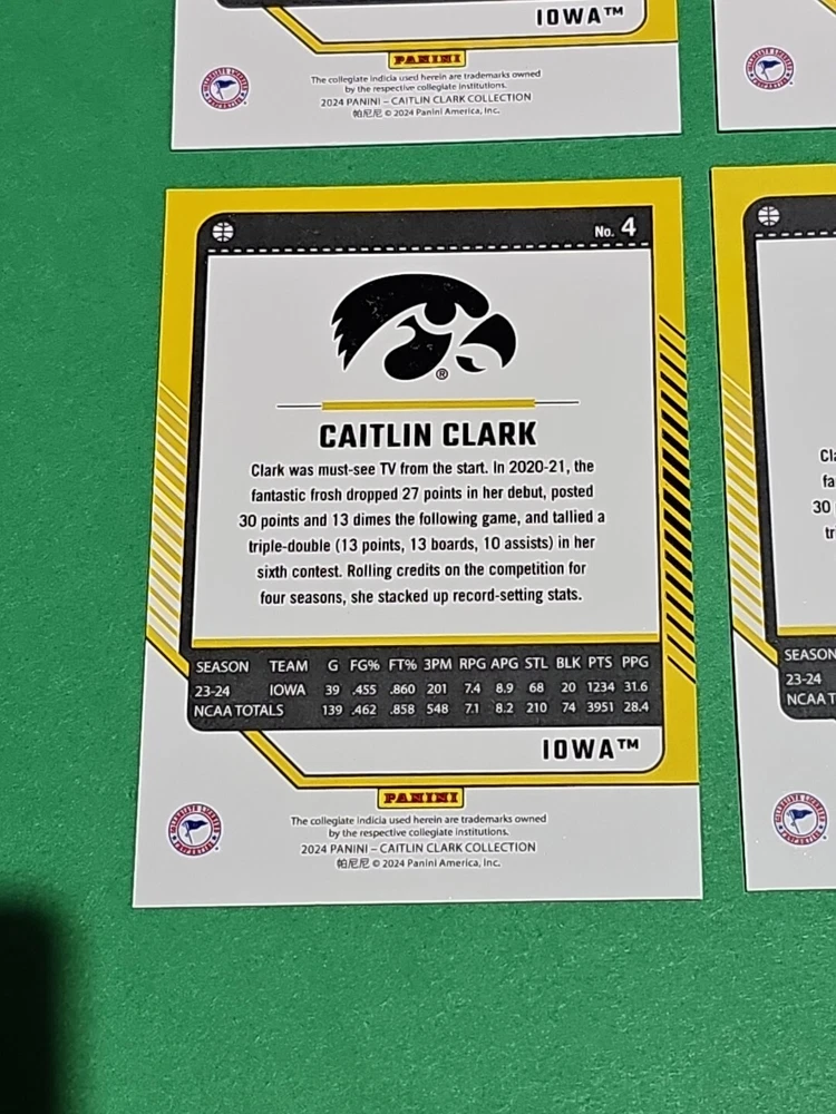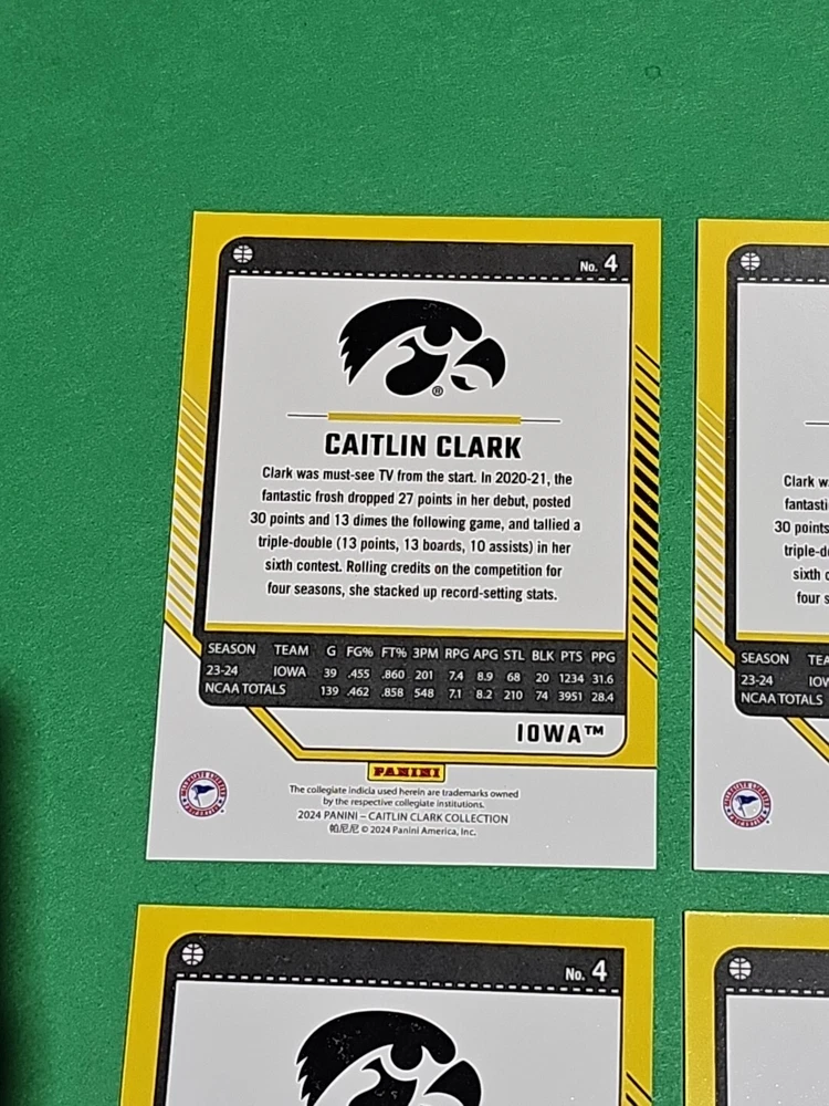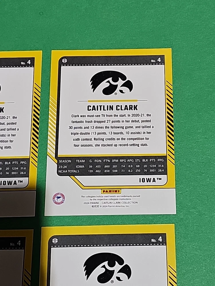 You will receive the exact cards pictured. This Lot of 4 Caitlin Clark Rookie 2024 Panini Donruss Iowa Hawkeyes Card No. 4. Pay only $1.50 for shipping on your first cards won & 50 cents per lot of cards won in auctions up to $5.00. $5.00 is the maximum shipping you will pay, no matter how many cards you win! Please wait until you are done with all your purchases and I will send a combined shipping invoice within 24 hours. Please check out all of my other great auctions going on now! I have several Caitlin Clark Auctions going on now! Thanks for looking & good luck!!