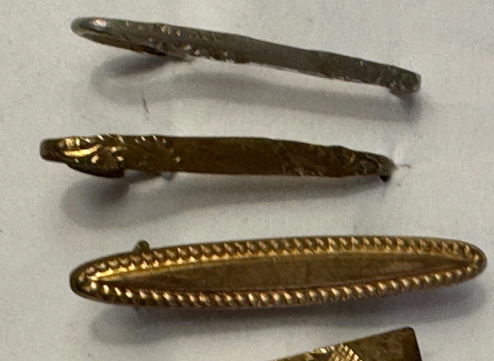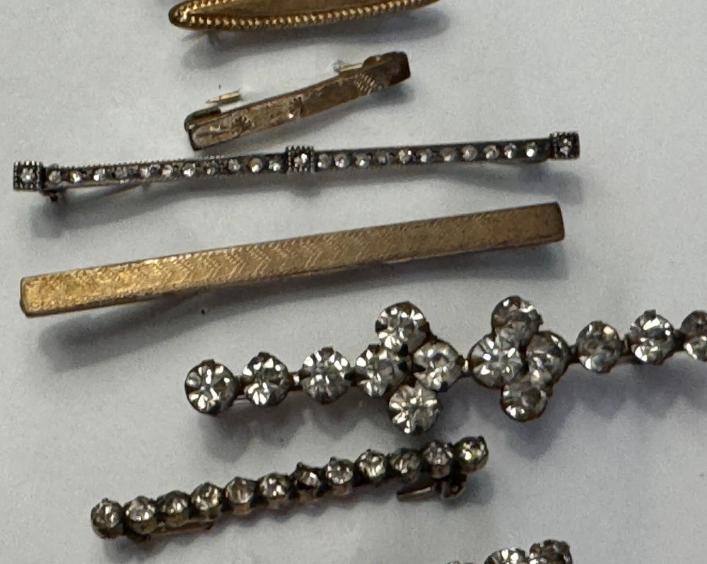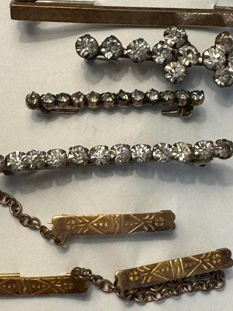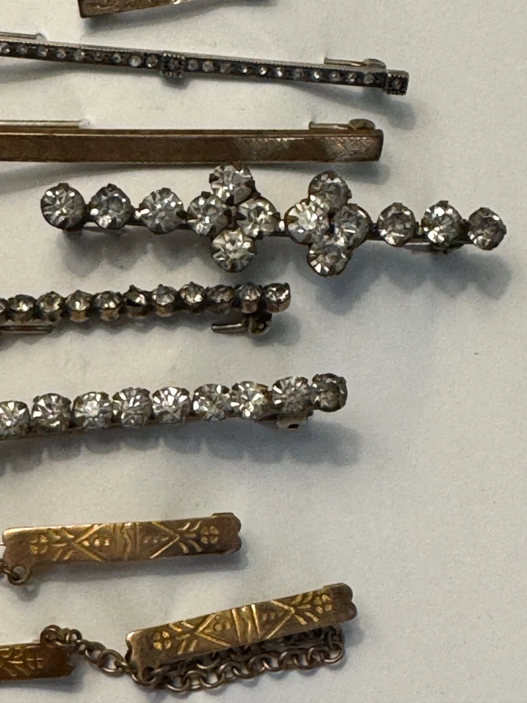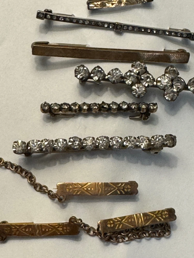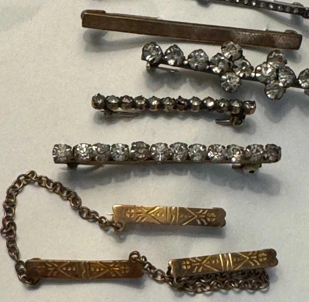 Lot of ten ladies lingerie or bar pins from the Edwardian & Art Deco eras. Eight have open or safety pin style clasps with the exception of the sterling silver bar pin which has a roll over clasp. There are three pins with clear rhinestones, and the rest have scrolled designs-flowers, lines or similar designs. The clasp on the sterling & rhinestone bar pin needs repaired. There is a three pin set, attached by gold filled chain. This is a nice collection for someone collecting jewelry of this age. Email with questions.