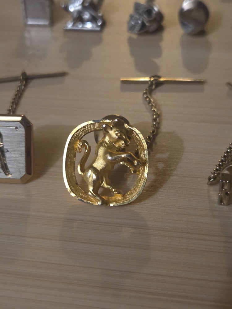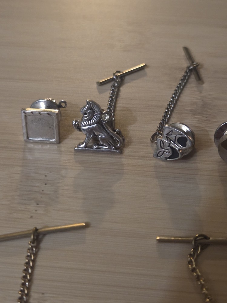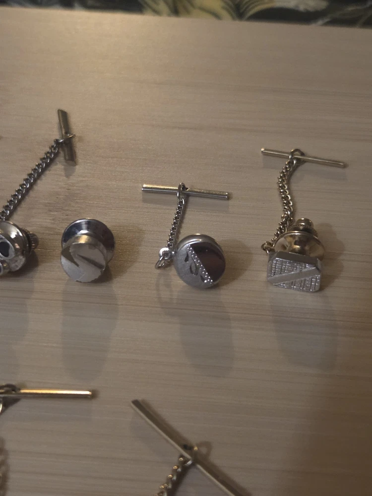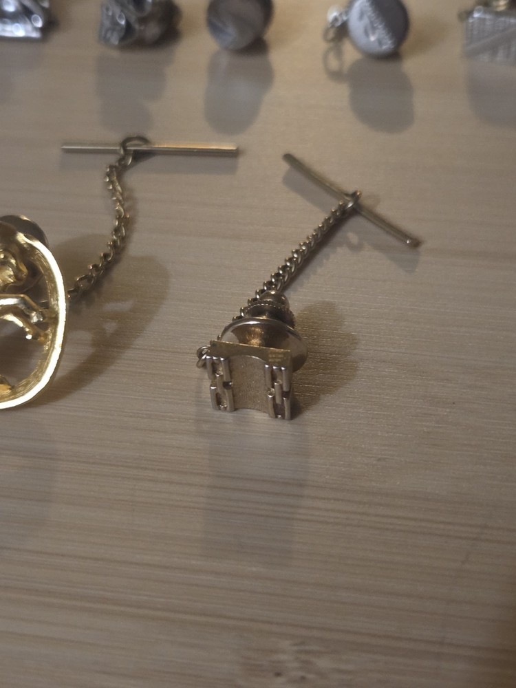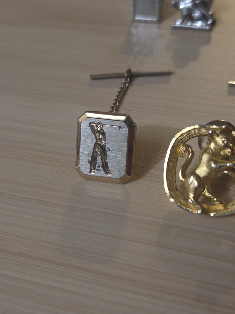 The product is a lot of vintage Swank tie pin tacks, featuring a gold and silver tone design. These tie pins are signed by Swank and are suitable for men. They are not personalized and are not handmade. The tie pins are perfect for occasions such as weddings or Father's Day, adding a touch of sophistication to any outfit. Made with gold base metal, these stylish accessories are a unique and timeless addition to any collection.