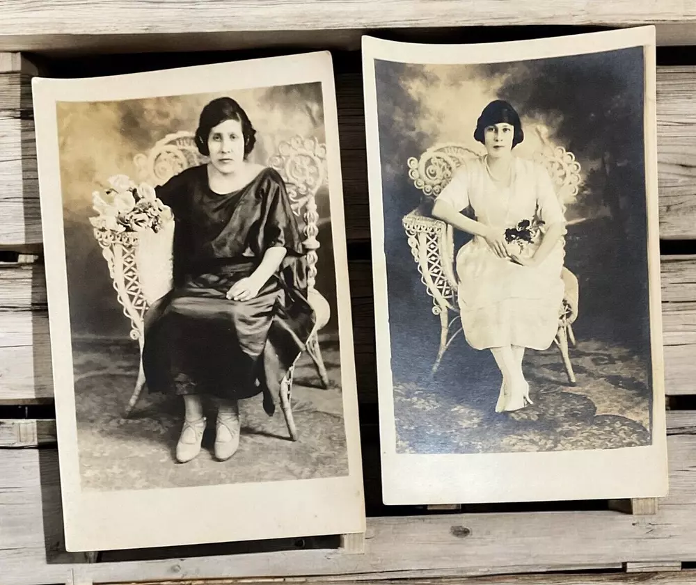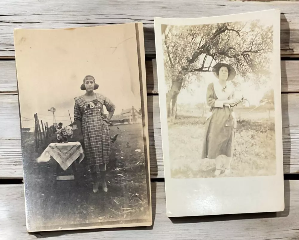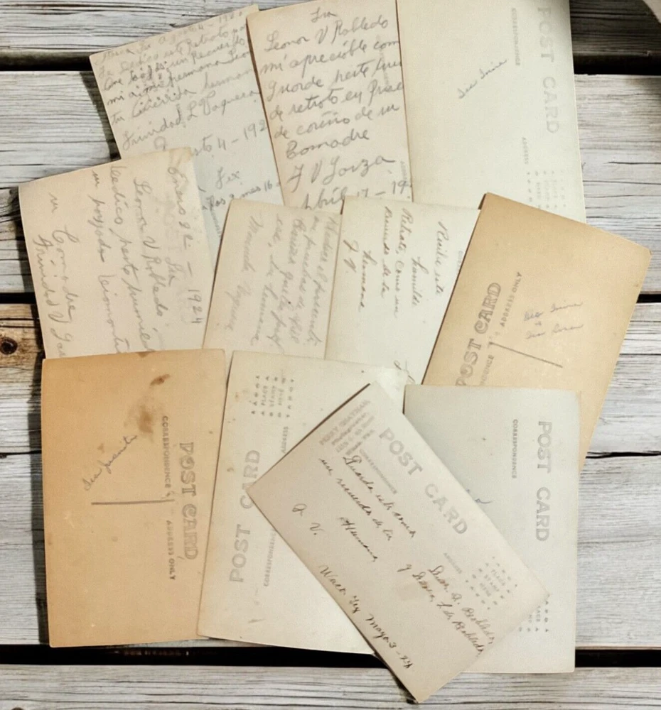 Lot of 11 RPPC's Real Photograph Post Cards of Hispanic Women & Girls dated 1920 - 1924 in Texas. Most photographs are black and white with a couple being sepia and are approximately 3-3/8" x 5-3/8". All cards have some degree of yellowing due age, slight bends/creasing, and stains/spanish writing on back. Photographs feature young and middle age Hispanic women posing with chairs/indoor and a couple are outdoor photo's.