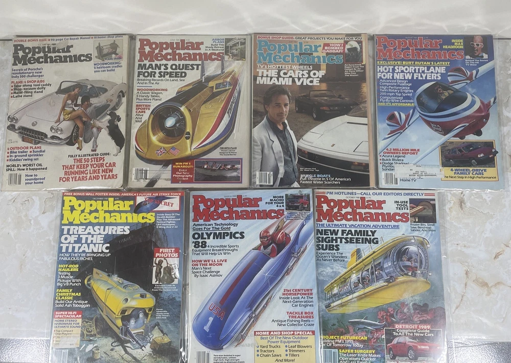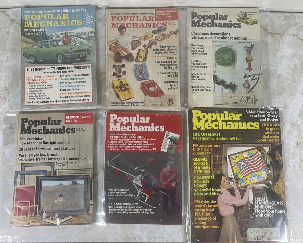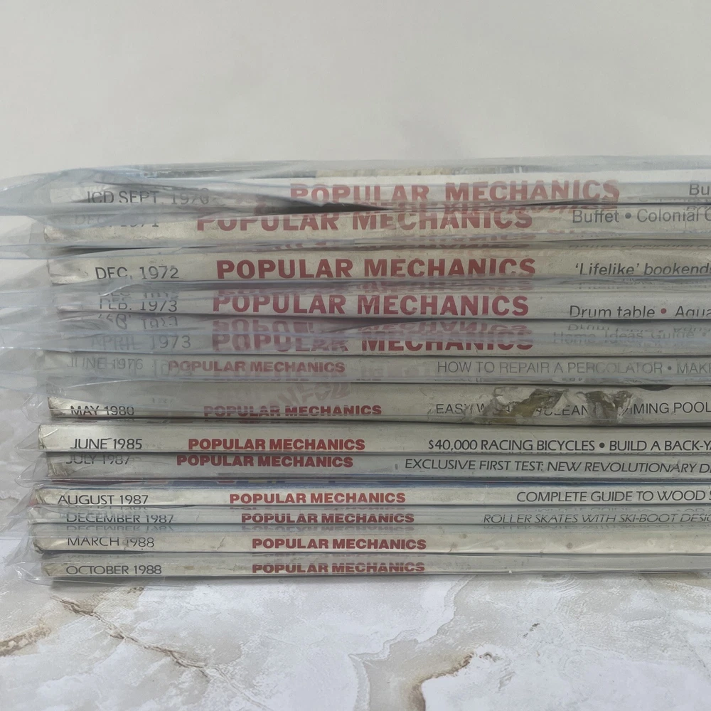 OLDER & FRAGILE, PLACED IN MAGAZINE POLY BAGS TO HELP PROTECT This lot consists of 13 vintage Popular Mechanics magazines from the 1970s and 1980s. The magazines cover a variety of topics including cars, aviation, hobbies & crafts, nautical, science, history, design, technology, mechanics, hardware, and transport. Each magazine is in English and is illustrated. The publication frequency is monthly. The magazines are not signed and are in good condition.