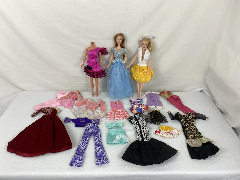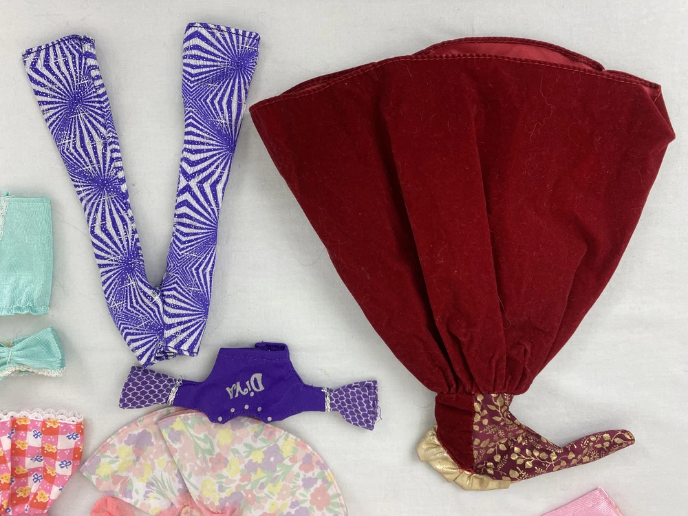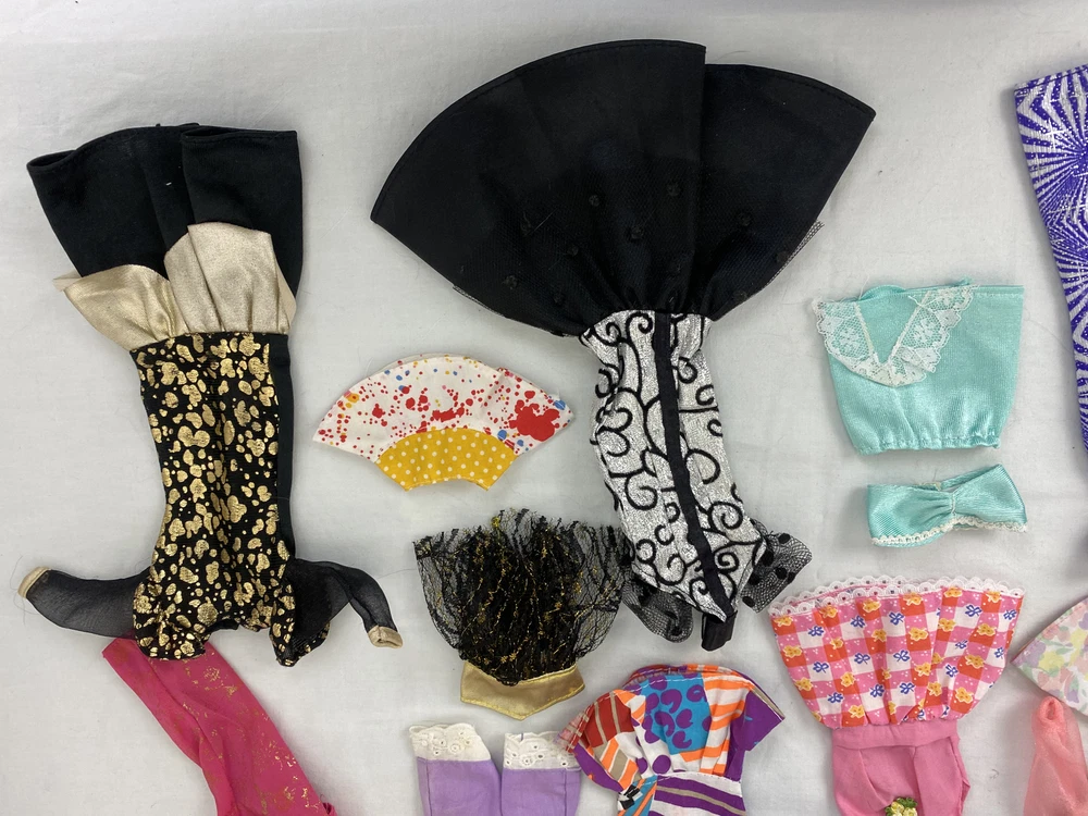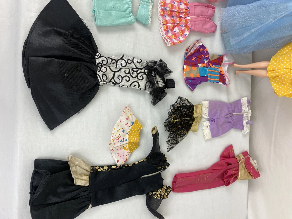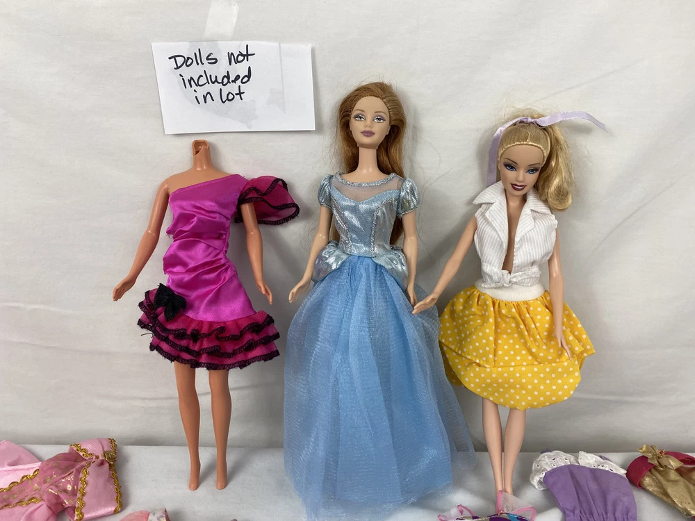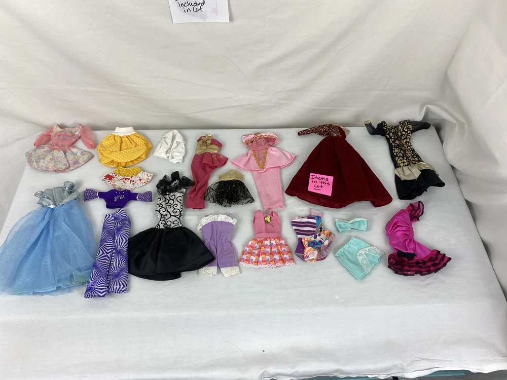 This lot includes 14 Lucky Brand Barbie clone outfits, featuring a mix and match collection of formal dresses, gowns,skirt, pants, and casual wear. The clothing styles are perfect for all occasions, whether for holidays, everyday wear, or special occasions. The outfits are compatible with 11 1/2 inch dolls, and the set weighs 0.4 lbs. The Lucky Brand Barbie clone outfits were manufactured in 1990-1999 and are original, vintage pieces. The clothing is made of lightweight cloth and does not require batteries. Examples of dolls that can wear this lot: Jazzie, Barbie, Midge, Teresa, and Stacie doll types, and the set comes with 14 Barbie clone looks that can be used for fashion and beauty themes. Please pay close attention to the pictures as they are considered part of the description. Sold as is, no returns.