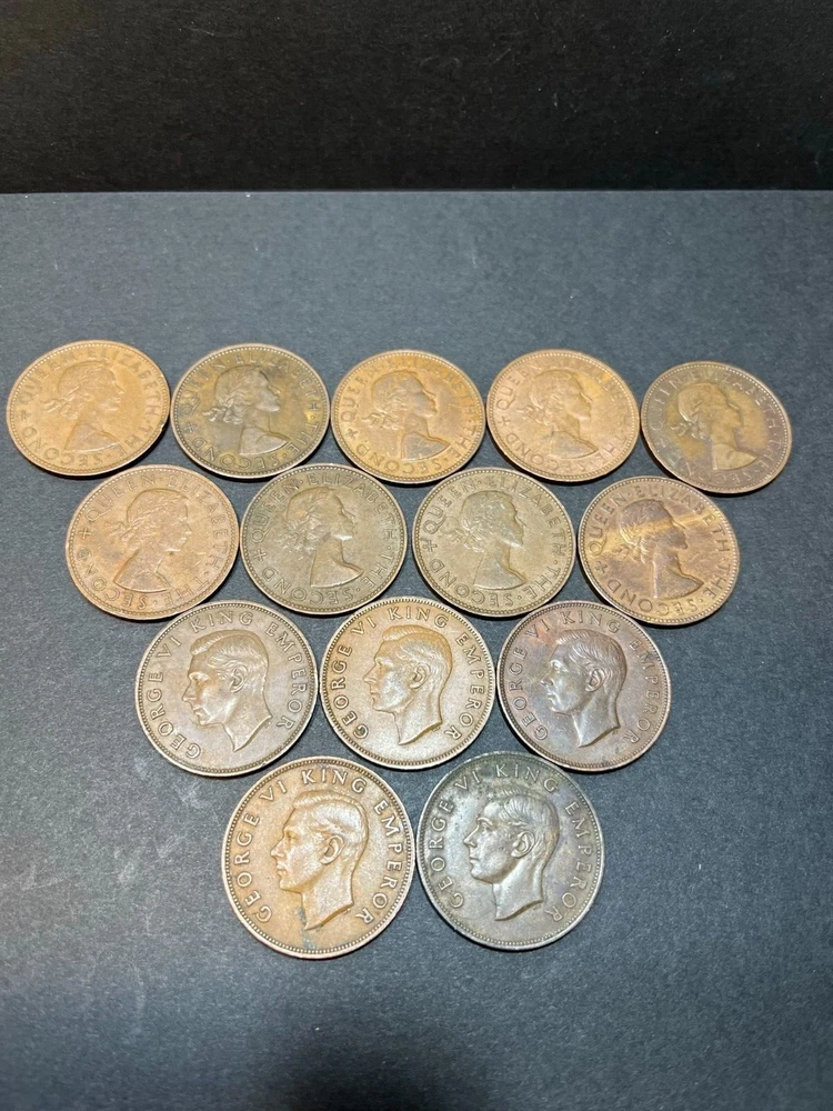 Lot of 14 New Zealand 1 Penny coins (all different dates from 1940-1964) 1940, 1941, 1942, 1943, 1946, 1953, 1954, 1955, 1957, 1958, 1960, 1961, 1962, 1964 Coins pictured are the exact coins you will receive. Condition Notes: For coins that are not graded, I do not offer an opinion on the grade or condition of the coin. Please examine the images carefully and make your own assessment. Shipping Details: US shipping only. Mailing times will vary and are out of my control. I will ship within 3 business days, most of the time faster upon receipt of cleared payment. Sales tax collection is handled by eBay if applicable in your state. Email with any questions.