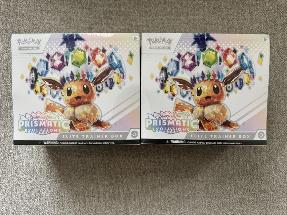 The product is a lot of two items: a Pokémon Prismatic Evolutions Elite Trainer Box and four tins, all featuring Eevee from the Pokémon TCG. The Elite Trainer Box is sealed and includes a standard-sized set from the Scarlet & Violet series. The English-language box is designed for ages 8 and up and is made of cardboard. This lot is ideal for collectors or players looking to expand their collection with new cards and accessories in a single purchase. All items are factory sealed