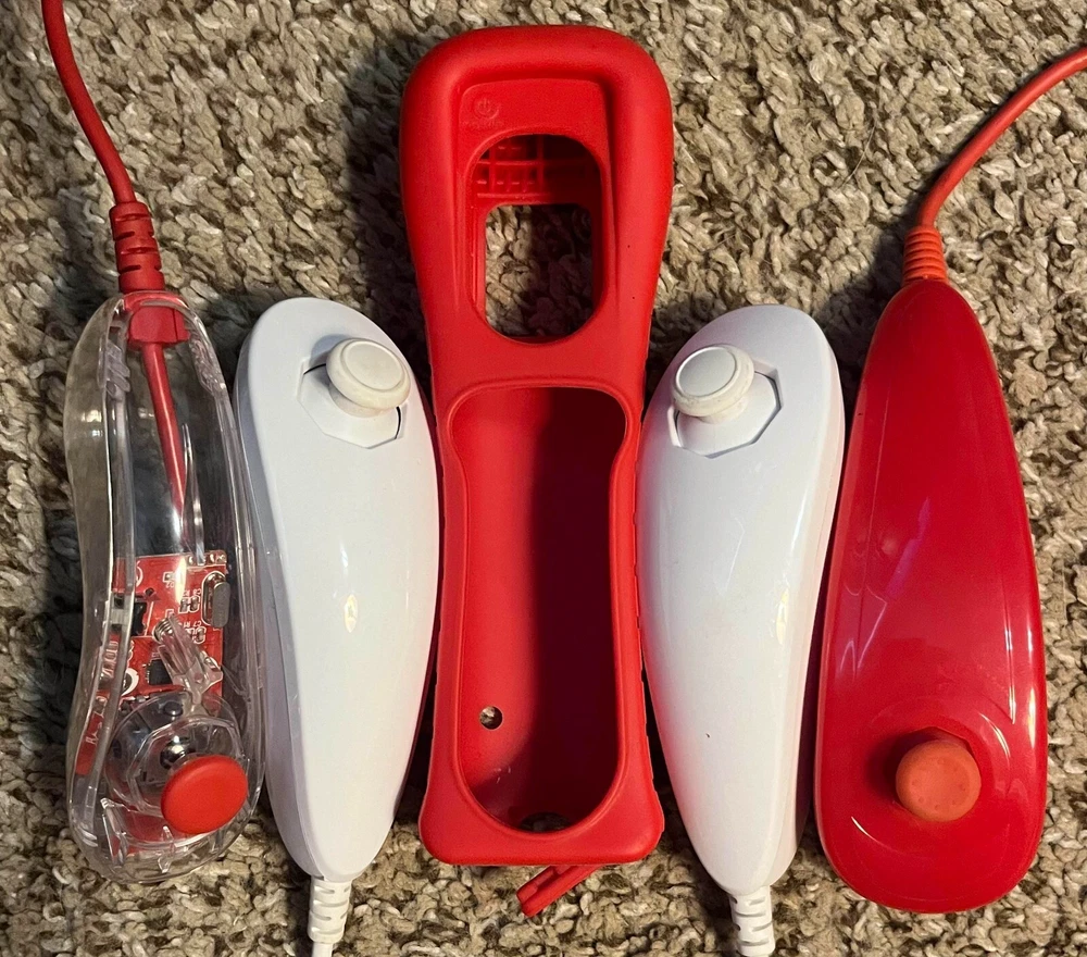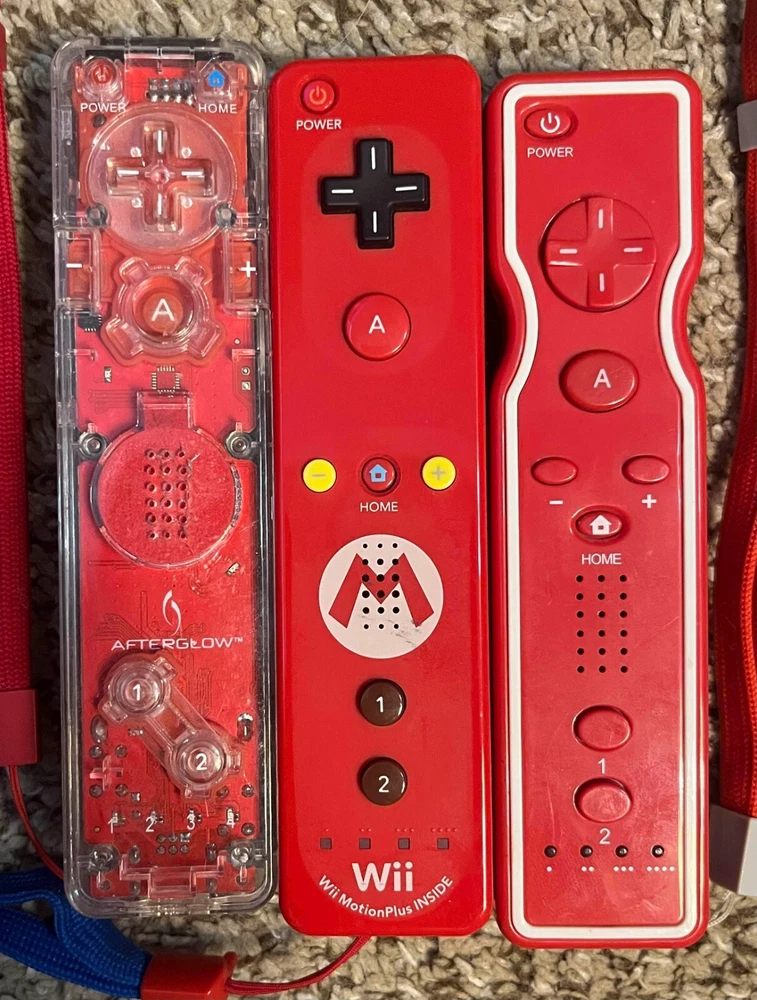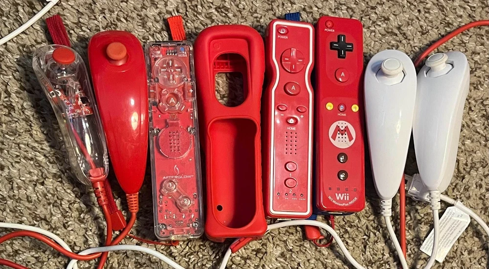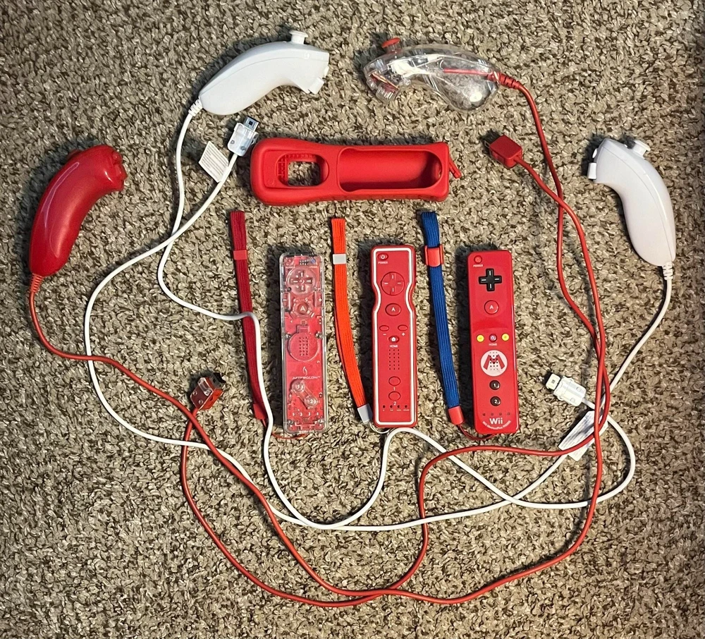 3 Wii controllers, 4 nunchucks, 1 controller skin. Including the rare limited edition mario controller. They are all in used condition. The clear controller seems to be in the worst shape out of all of them, it is a little cracked on the underside, but in tact. Again these are UNTESTED and for this instance being sold as parts. red and white controller has no battery cover for the back. Any questions feel free to ask