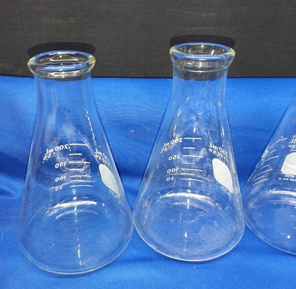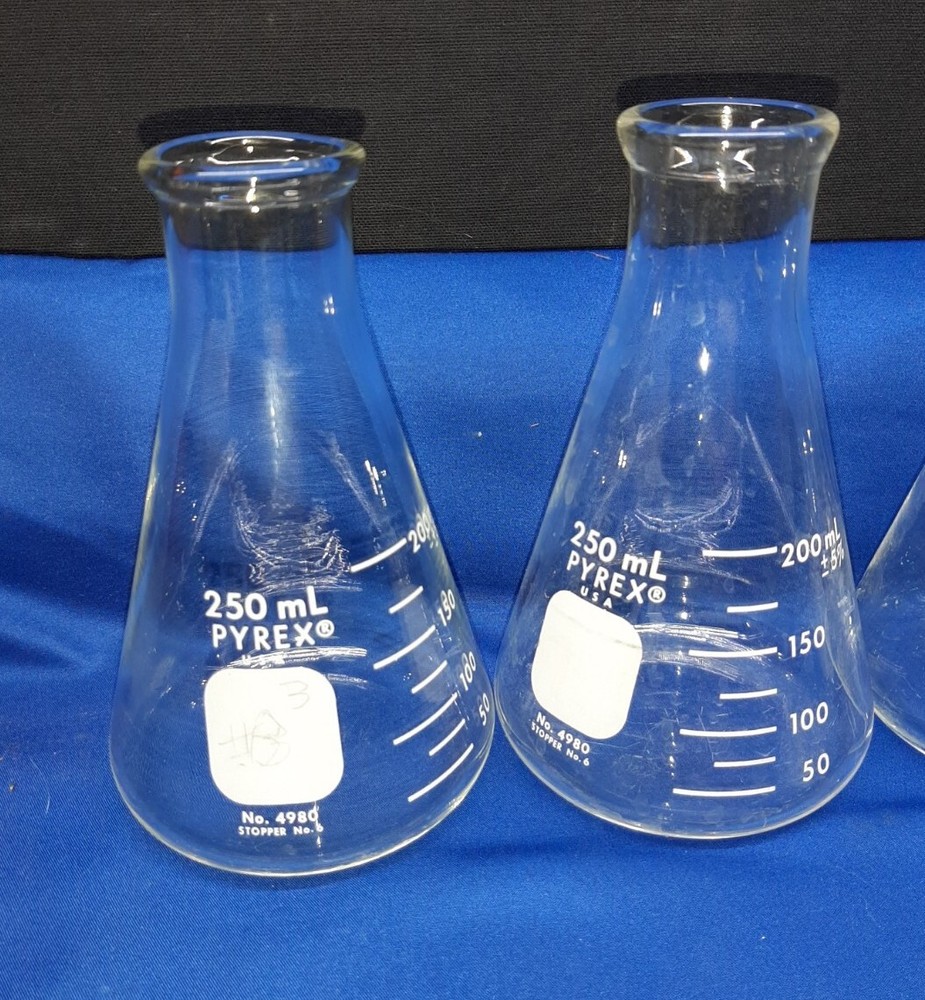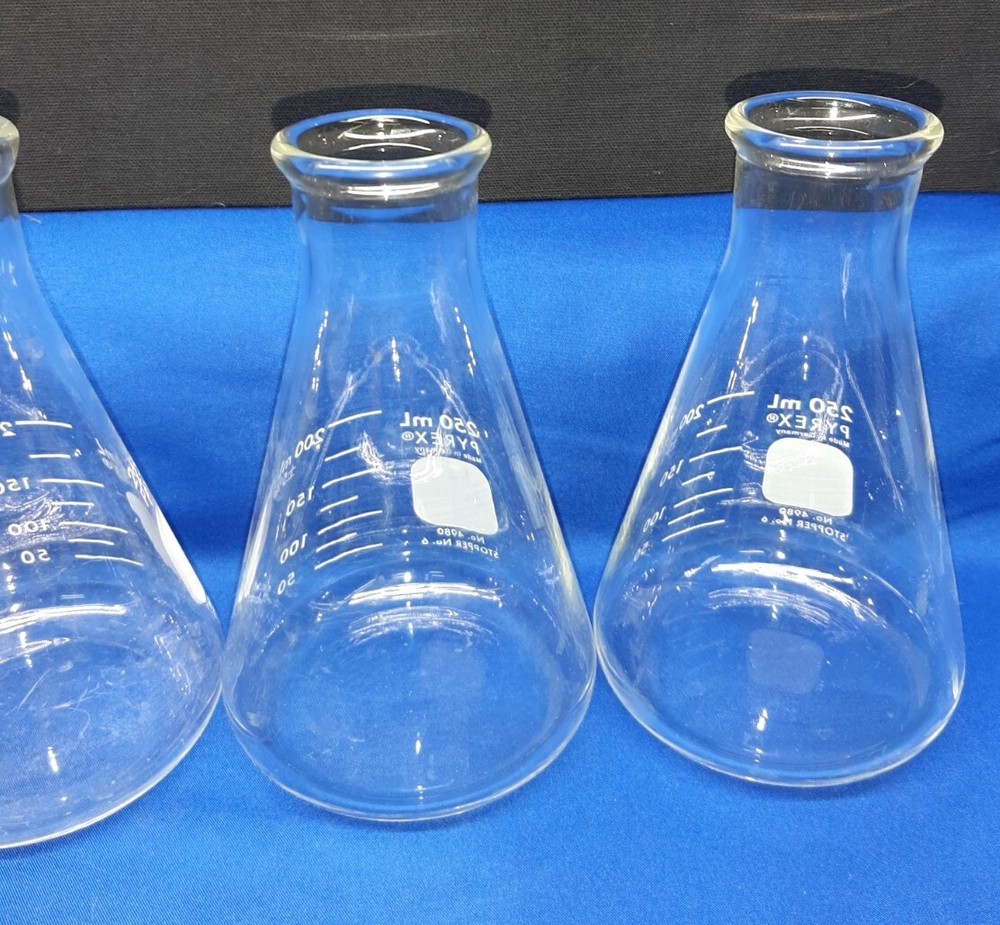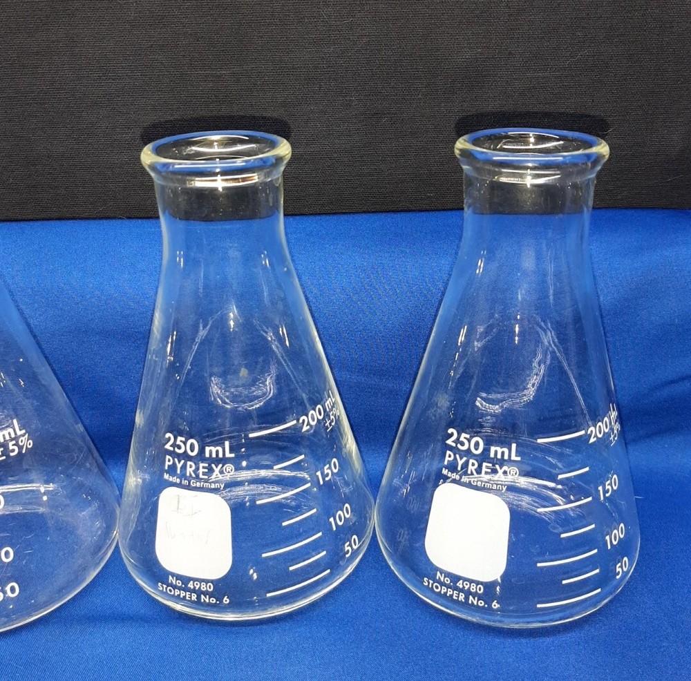 Up for sale i have a Lot Of 4) Pyrex 250ml Flask No. 4980. These are all in good used and undamaged condition. They have minor scuffs and wear, there are no chips or cracks. There is some writing on the white area. They could use a little cleaning. You will be getting the exact 4 flasks pictured in this listing. 2 are made in Germany and 2 are USA made.