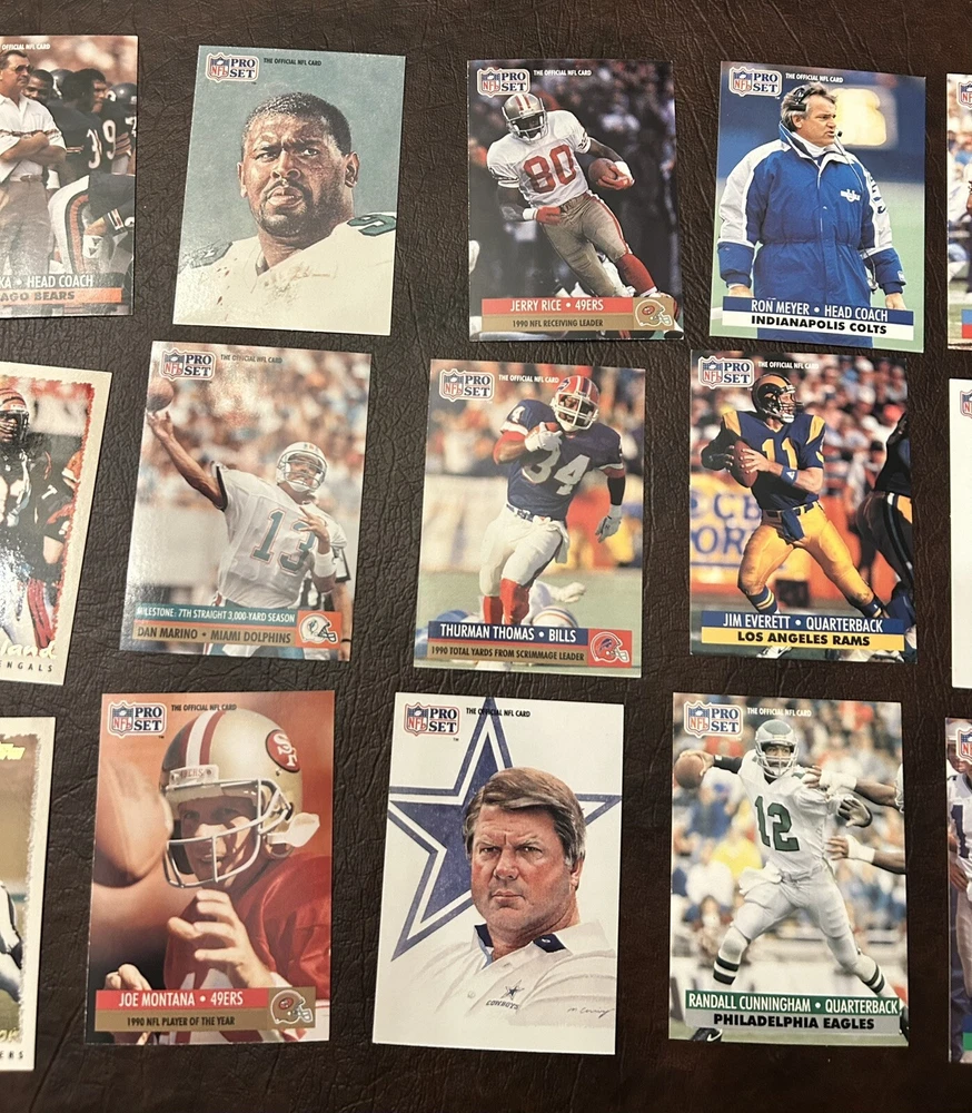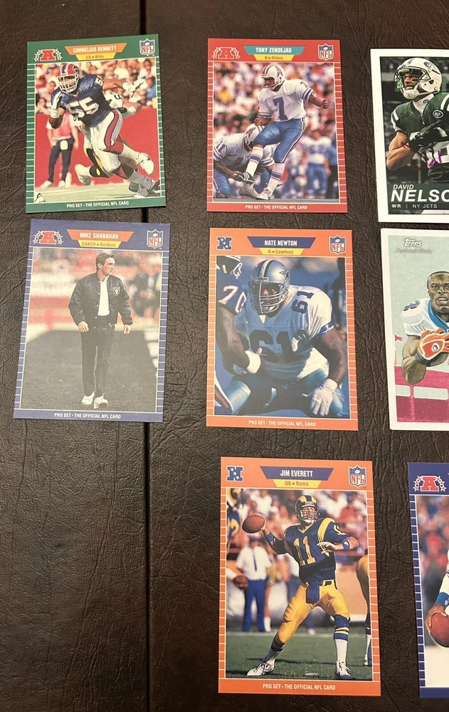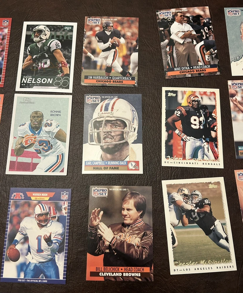 This lot of sports trading cards features 45 original cards from the NFL Pro Set, as well as NBA and MLB cards. The cards are made of card stock material and come with a signed David Nelson card. The set includes cards of famous players such as Ozzie Smith, Randall Cunningham, and Reggie White, as well as coaches like Bill Belichick and Mike Ditka. The cards are in standard size and are perfect for collectors of vintage football memorabilia. The set is a great addition to any sports trading card collection and is a must-have for fans of the Cincinnati Bengals, Houston Oilers, and San Francisco 49ers.