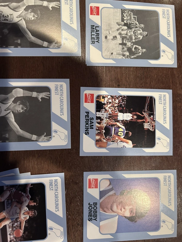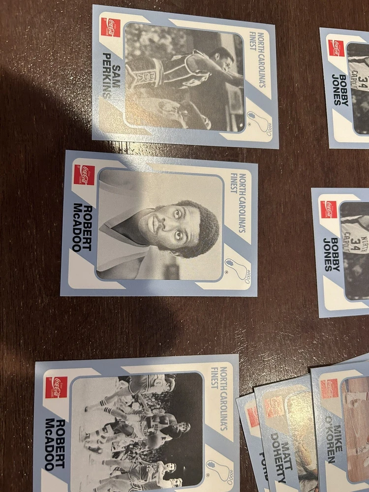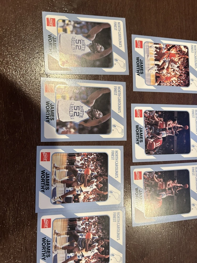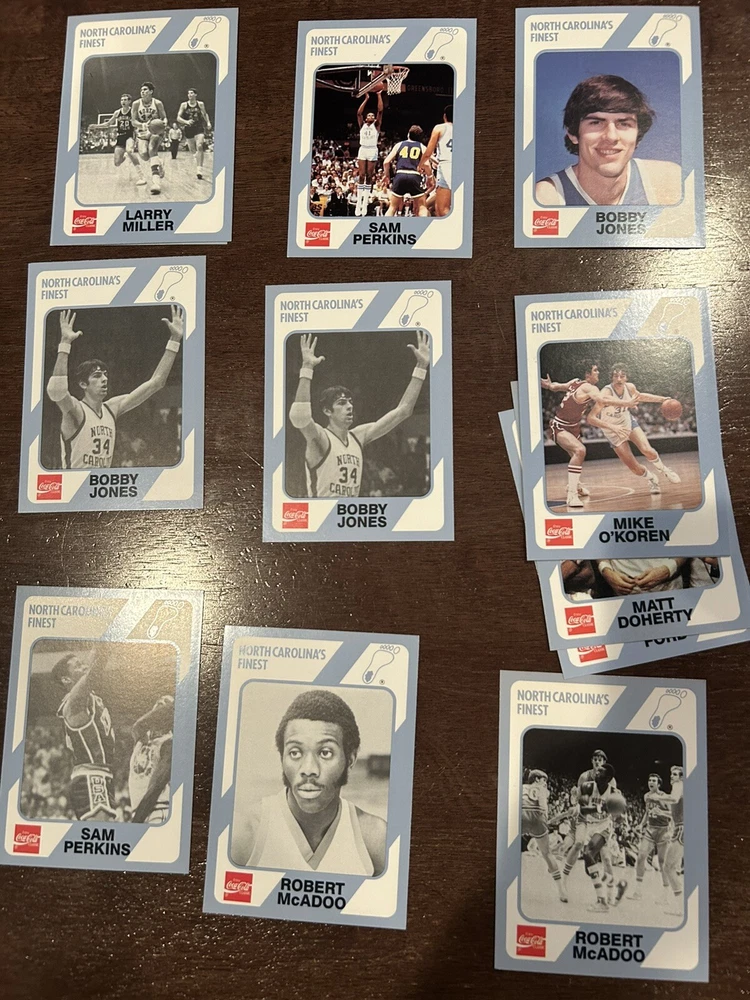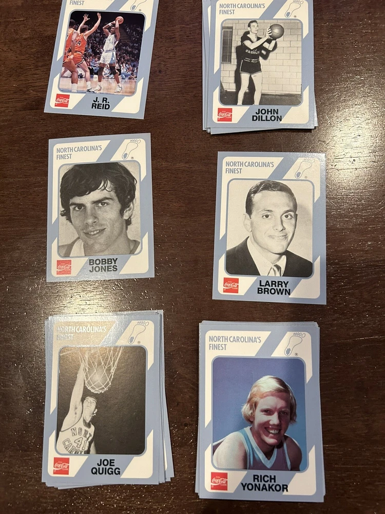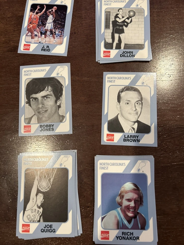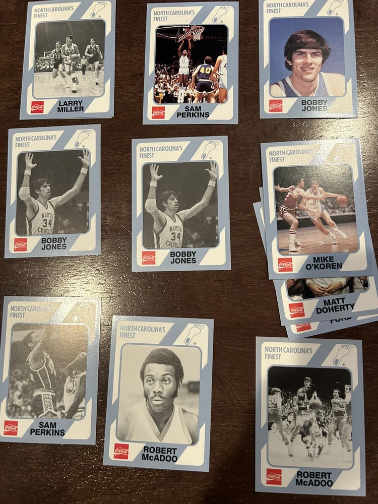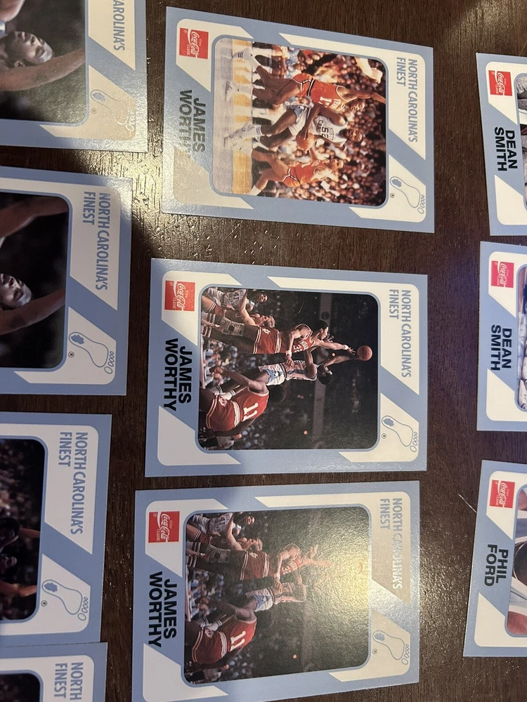 1989 Collegiate Collection Coca Cola North Carolina’s Finest basketball cards - 56 cards Cards are in near mint condition Includes Dean Smith - 2 cards Phil Ford - 2 cards James Worthy - 7 cards Sam Perkins - 2 cards Bobby Jones - 3 cards Billy Cunningham Robert McAdoo - 2 cards J.R. Reid And many more