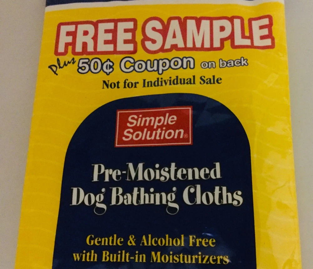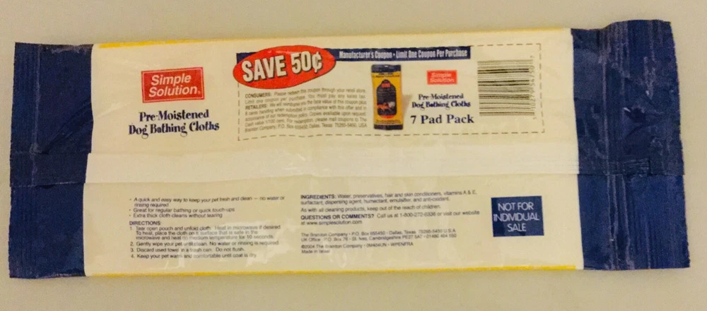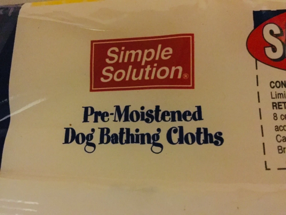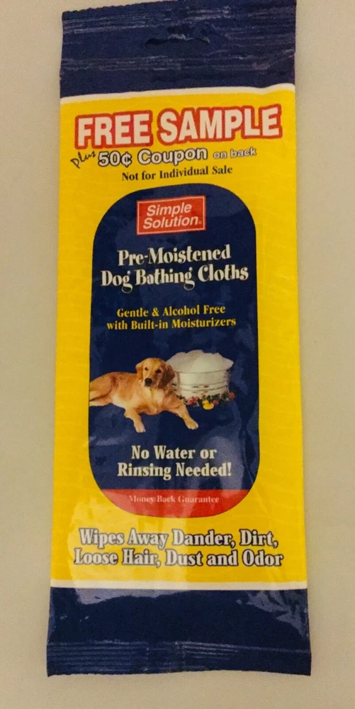 Lot of 6 Pre-Moistened Dog Bathing Cloths By Simple Solutions. No Water Or Rinsing Needed. Gentle And Alcohol Free With Built-in Moisturizers. Wipes Away Dander, Dirt, Loose Hair, Dust, And Odor. Each cloth is individually wrapped in a sealed package. This exact product is no longer made by the this manufacturer. I ship free within the USA on the same day as receiving payment, using recycled packaging materials whenever possible.