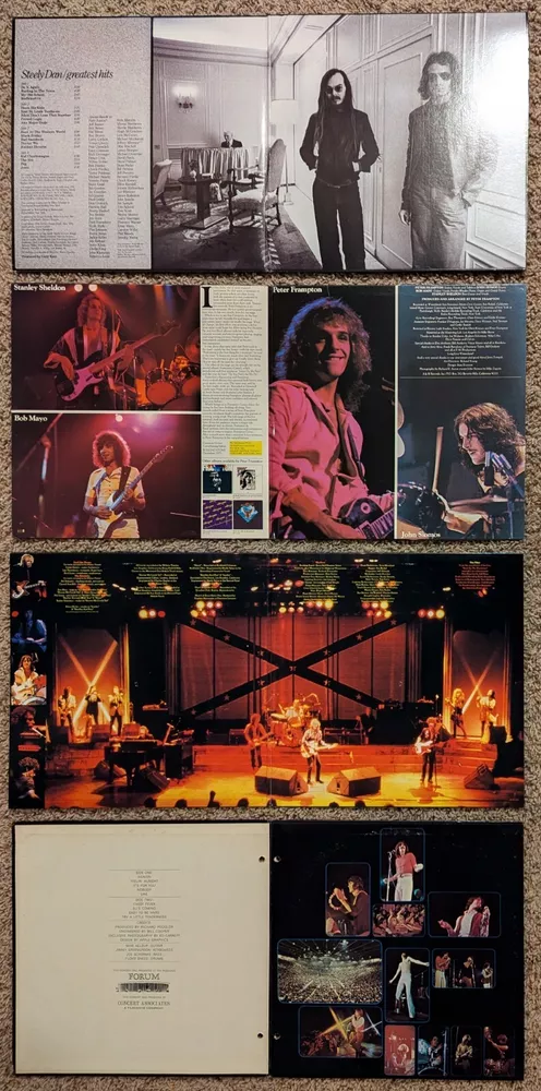 This listing is for the following 6 vinyl LP albums (9 total records, 12" 33 RPM): Steely Dan - Greatest Hits (1978, AK-1107/2) *2 records* Peter Frampton - Frampton Comes Alive! (1976, SP-3703) *2 records* Tom Petty and the Heart Breakers - Pack Up the Plantation-Live! (1985, MCA2-8021) *2 records* Bob Seger and The Silver Bullet Band - Night Moves (1976, ST-11557) Three Dog Night - Captured Live at the Forum (1969, DS 50068) Chicago - Chicago's Greatest Hits (1975, PC 33900) Records are in nice condition with no warping and include jackets and inner sleeves. Jacket for Three Dog Night has holes punched in the left side.