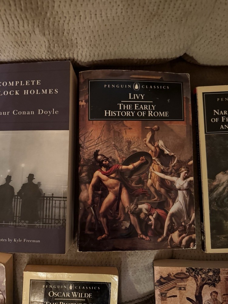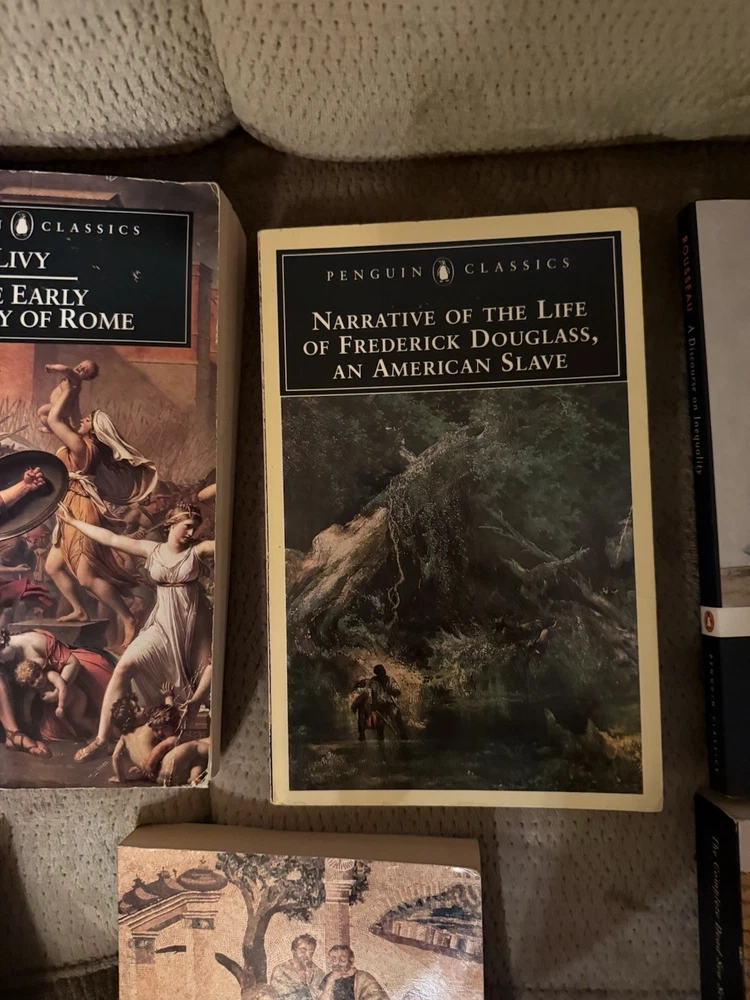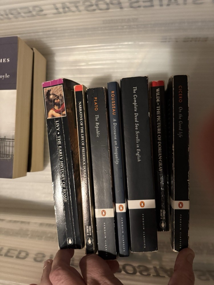 This lot of 9 Penguin Classics Barnes & Noble Classics Books consists of historical fiction novels by various multiple authors. Published by Modern Library, these English-language books are intended for an adult audience and fall under the genre of world literature & classics. Each book in the collection is in paperback format and belongs to the literary movement of modernism. With no inscription or personalization, these classics cover a range of topics within the realm of literature. The complete Sherlock Holmes volume one and two Sir Arthur Conan Doyle, Barnes & Noble Classics The complete Dead Sea Scrolls in English, the Republic, picture of Dorian Gray, Cice ro - please see photo of tear on cover narrative of the life of Frederick, Douglas Liv y