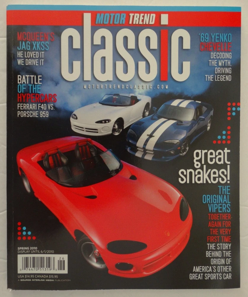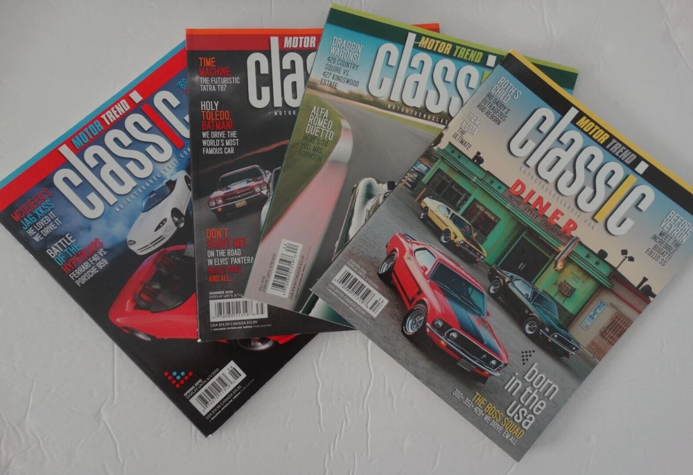 Lot of All Four (4) Issues of Motor Trend Classic Magazine for 2010 – MINT A lot of all four quarterly issues of Motor Trend Classic magazine for 2010. Spring through Winter Issue 2010 (No. 9 through 12). Large format (9” x 11”) in size; average of 110+ pages per issue; full-color photography; good quality paper stock. Published by PRIMEDIA, publisher of Motor Trend. “Welcome to the bold new meaning of classic. The post-war classics: the metal, the people and the stories that have never been told … until now.” From my personal collection. Newsstand purchases; no mailing labels. excellent to MINT condition : no missing pages, torn covers, bent corners, etc. 100% complete. Stored flat in a closed box, out of sunlight, in my non-smoking house since new. See accompanying photos of front covers. Sold as a set only ; do not ask me to break it up! I will gladly combine shipping of other like purchases whenever possible. If necessary, I can issue a refund for combined shipping through eBay. All materials shipped in a sturdy box USPS Media Mail, so this will take about seven days depending on location. Thanks for looking.