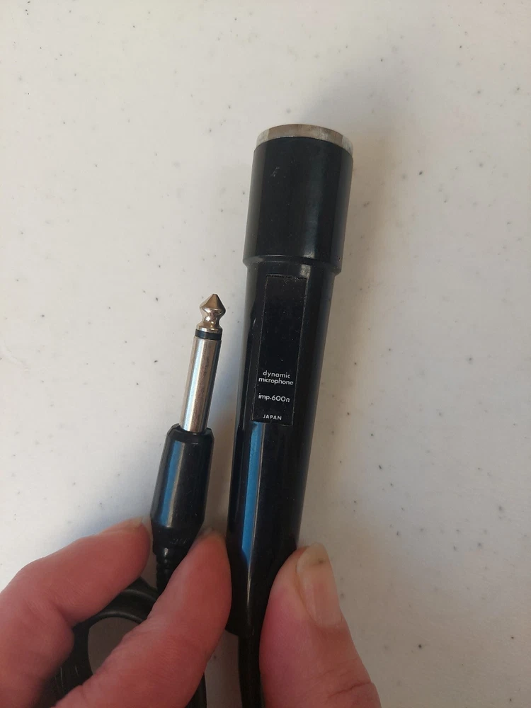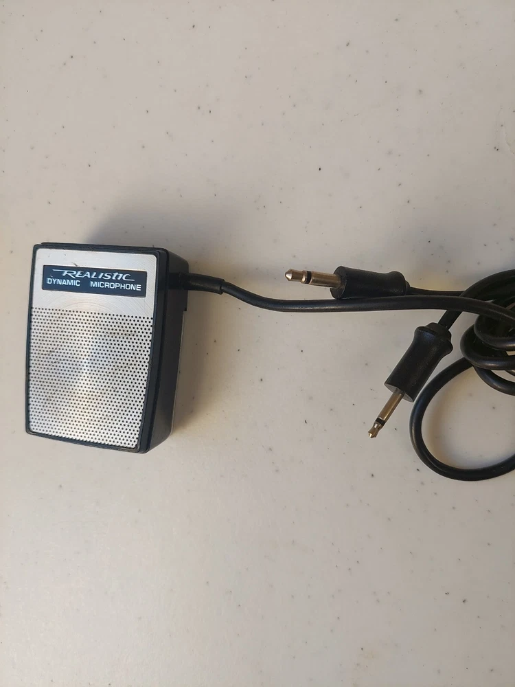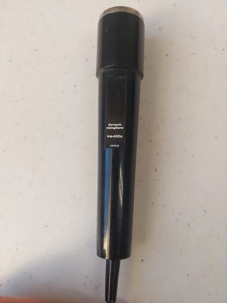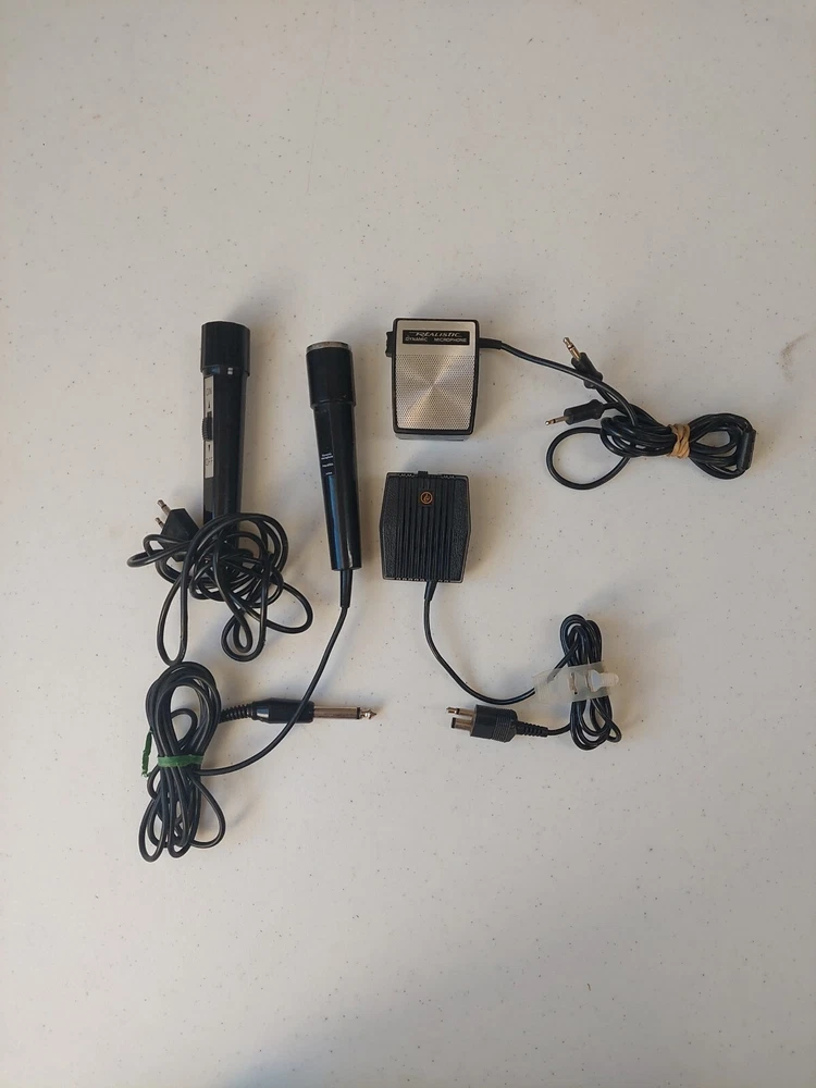 Lot of Four Vintage Microphones, all untested, please see photos, FREE shipping! Hello microphone collectors, technology historians, and anyone who likes Tom Waits and/or wanted to be in the Junkyard Band from Fat Albert. Today for your shopping pleasure I have an assortment of four weirdo microphones. I'm afraid these guys are for sale AS-IS with no returns, because I have no way to test them. They do all seem to be in good physical and cosmetic condition. Please see photos for condition of actual items. Two of these are short, black plastic microphones. One reads, "dynamic microphone imp-600Ω" and ends in the big "old headphones or current guitar cable"-sized plug. The other just has an "ON/OFF" switch and has some kind of weirdo connection on the end that looks like a modern headphone-jack sized male piece next to a much smaller one. Not at all sure what this is for. The other two mics are more interesting. One is a small black and silver Realistic Dynamic Microphone with a neat little folding kickstand deal on the back; this one ends with two of the modern headphone-jack size male pieces which are not connected to each other for the last couple inches of cord. The other just says "Dynamic Microphone WM-2056" and "Made in Japan" on the back, with what looks like a stylized treble clef on the front. This one looks kind of like a tiny CB mic and has a small plastic clip on the back, with another bizarre plug; it would be easier just to check out the photos than try to describe this one. Now, I don't know if these work, I don't know where they came from. But I do know this - I'd like to get them out of here. Fast, FREE shipping will be via USPS, Fed Ex, or UPS - whichever proves most cost effective. Thank you for looking!