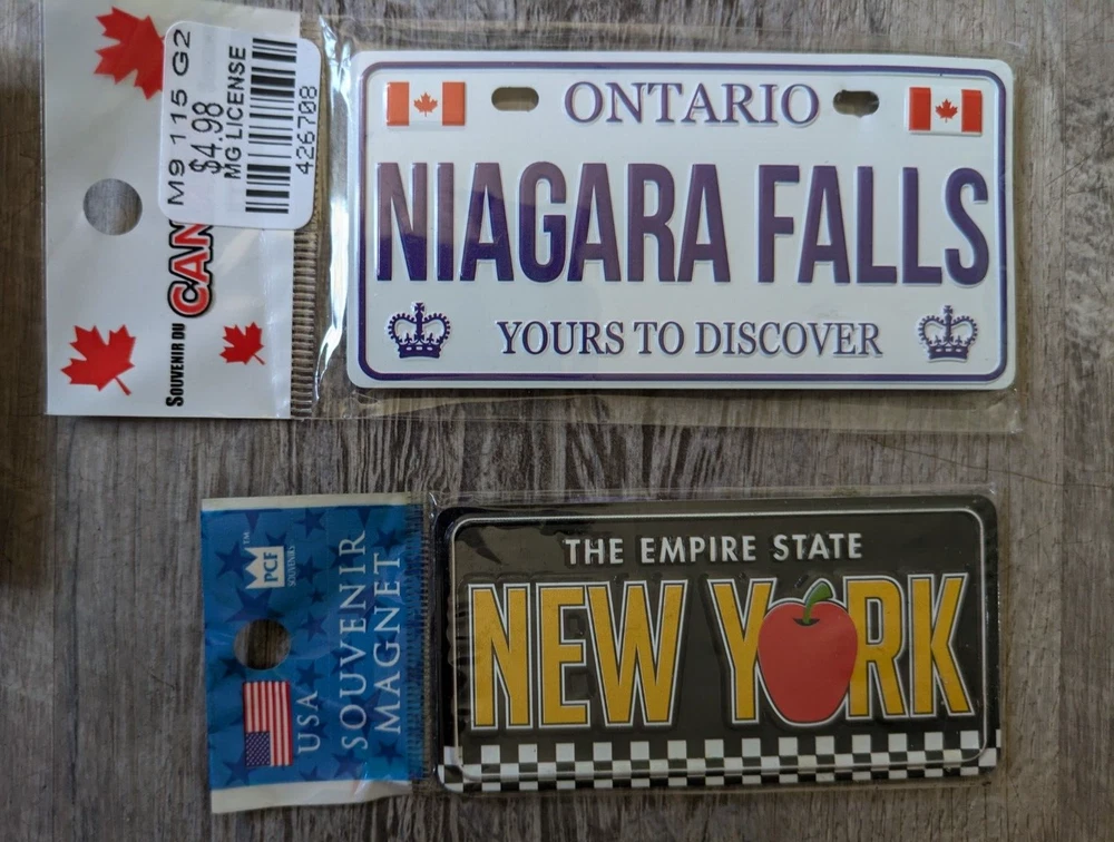 This is a lot of souvenirs from Niagara Falls Canada and New York. There is a Niagara Falls Souvenir Lapel Pin, a 4"x2" License Plate Style Ontario Niagara Falls Refrigerator Magnet, a 3 3/8" x 1 3/4" The Empire State New York Refrigerator Magnet, and 2 Niagara Falls Postcards. These are all new. We ship out as soon as possible after payment has been received! Thank you for checking out our eBay store. God bless you. BRSB