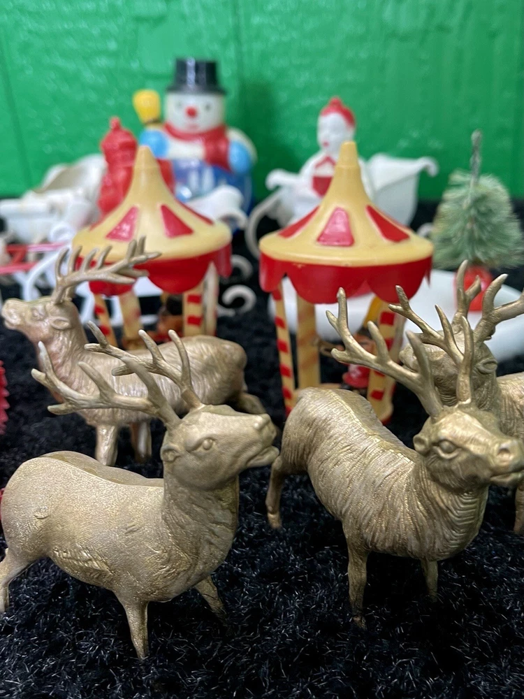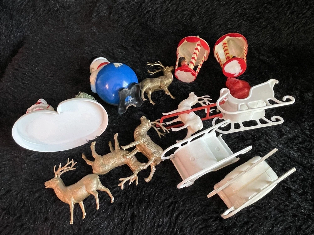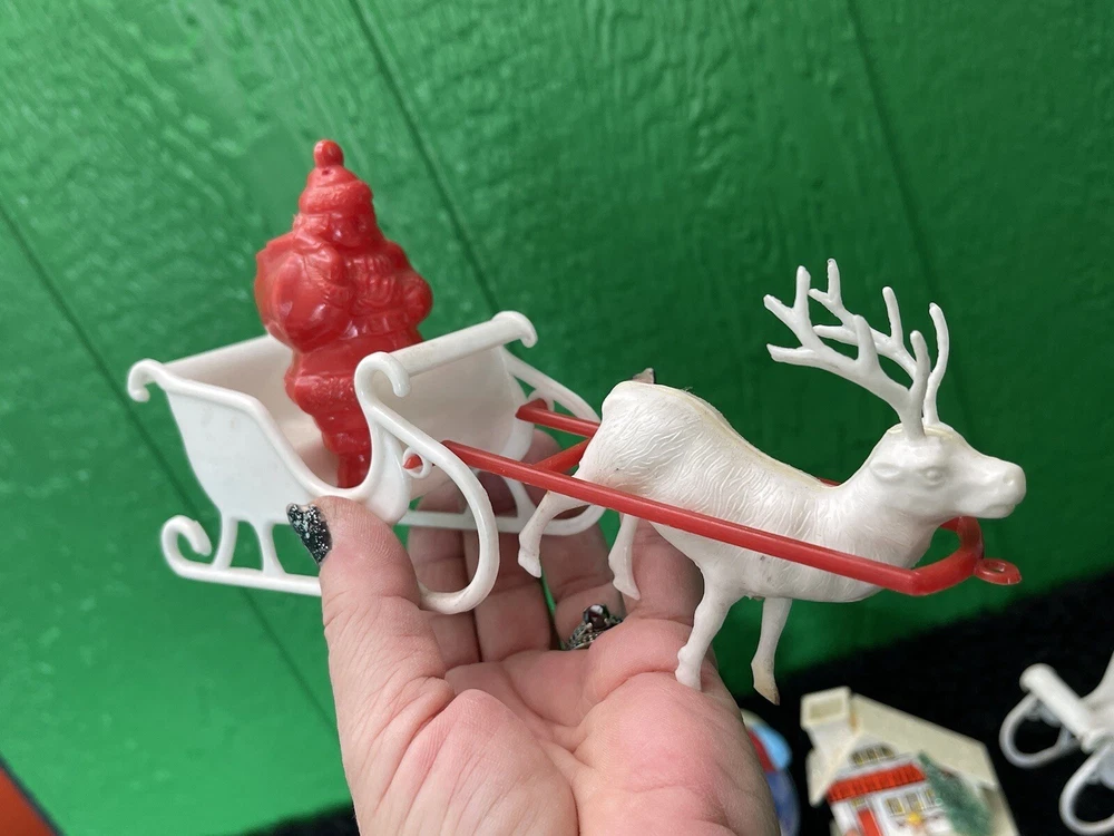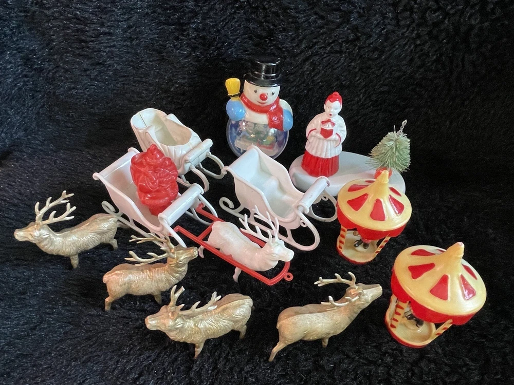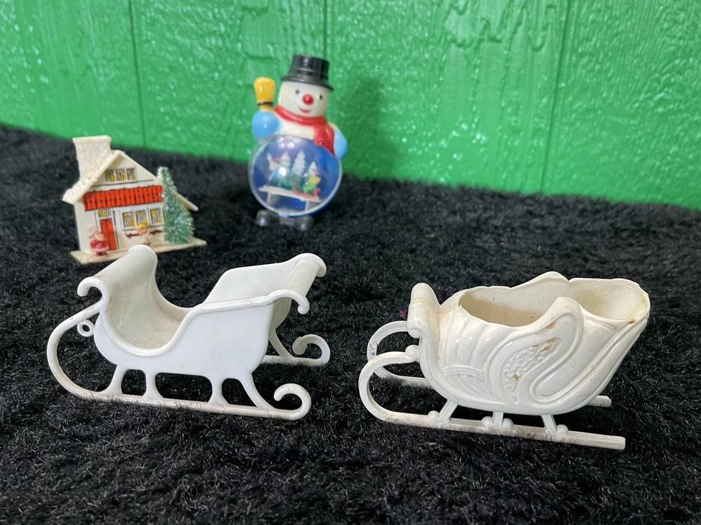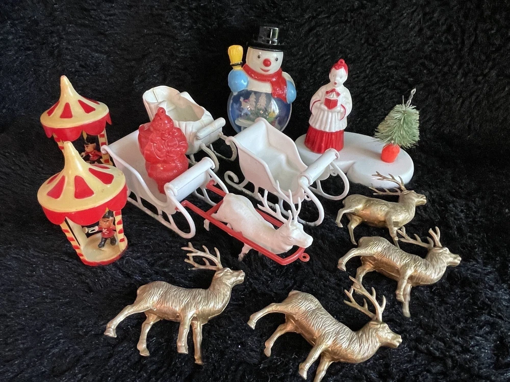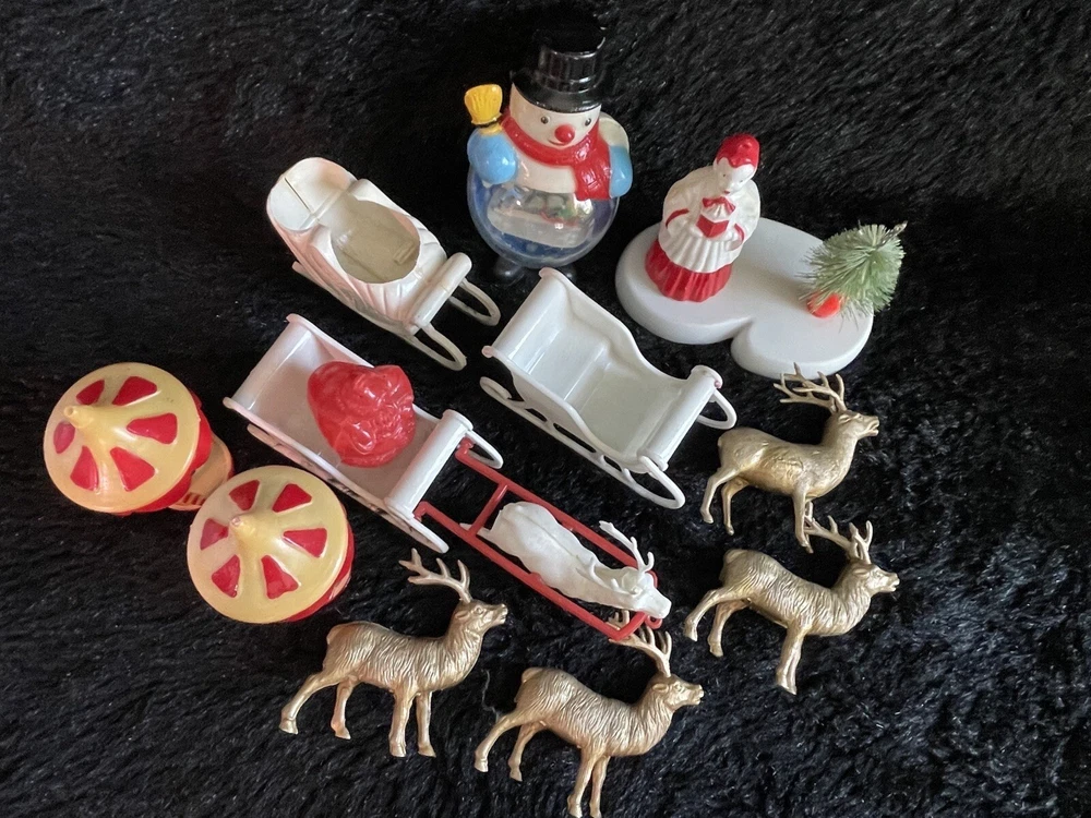 Assorted Lot of Vintage Christmas Hard Plastic Decorations Kitsch Deer Santa Sled Snowman ~Hard plastic Santa open toy pack on his back on sled with one reindeer-all pieces hard plastic. Measures 7 1/2" x 2" x 4". Yellowing of the glue can be seen on the deer. ~There are 2 hard plastic sleds-wear/dirt/slight separation on the back of one. One measures 2 1/4" tall x 4 1/4" x 2" and the other is 2 1/2" tall x 4" x1 3/4". ~4 hard plastic reindeer~ measure 3 1/4" tall x 3" x 1/2". One has a broken side on his antlers/rack. ~White platform with caroler with book and bottle (partial) brush tree measures 5 1/2" x 4" tall x 3". Appox 1" of the top of the bottle brush tree is missing as shown. ~I believe the snowman water globe can be filled with water from the bottom-I did not try to open the clear plug to fill it. Snow is still on the bottom. I can not guarantee it will hold water but I do not see any cracks in the plastic. ~2 4" tall carousel hard plastic ornaments?? with soldiers playing the horn. There are no hooks/clips on the tops of the pieces. Bottoms are marked Hong Kong. ~Weighs 8 oz before a box and packaging. ~I have other lots of vintage ornaments listed for auction this week. Shipping will be combined for multiple purchase. -PLEASE KEEP IN MIND THAT WHEN YOU PURCHASE VINTAGE ITEMS, THEY MAY NOT BE PERFECT AND DEMONSTRATE CHARACTERISTICS OF AGE AND/OR USE. -ITEMS FOUND AT LOCAL ESTATE SALES HERE IN NORTHEASTERN PENNSYLVANIA. -ITEMS ARE SOLD AS FOUND. SOME ITEMS MAY NEED TO BE CLEANED! PLEASE BE SURE TO SEE ALL PHOTOS, AS THEY ARE A VITAL PART OF THE DESCRIPTION!