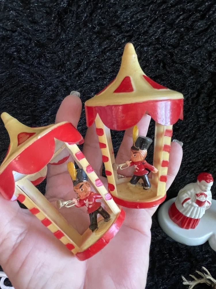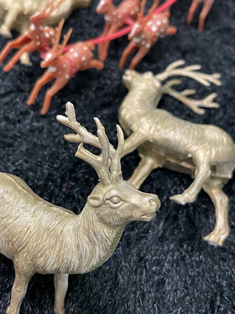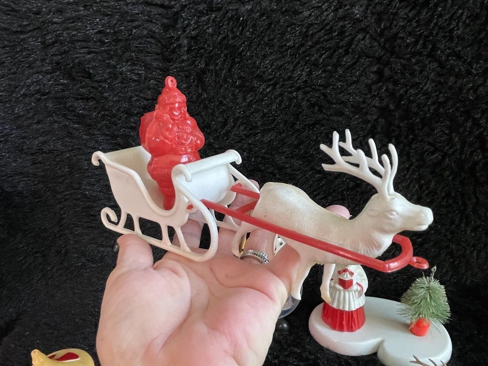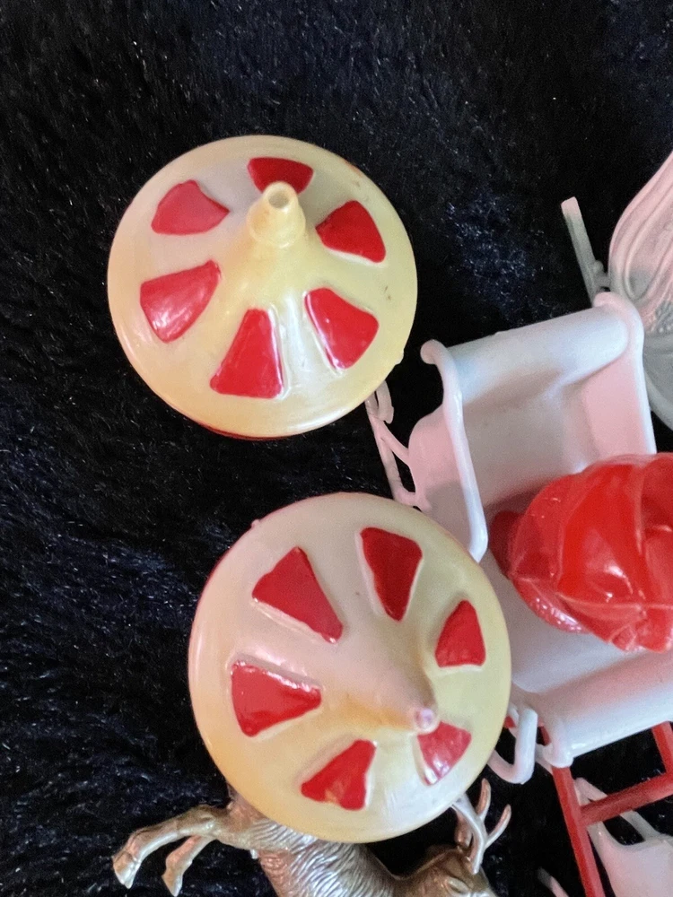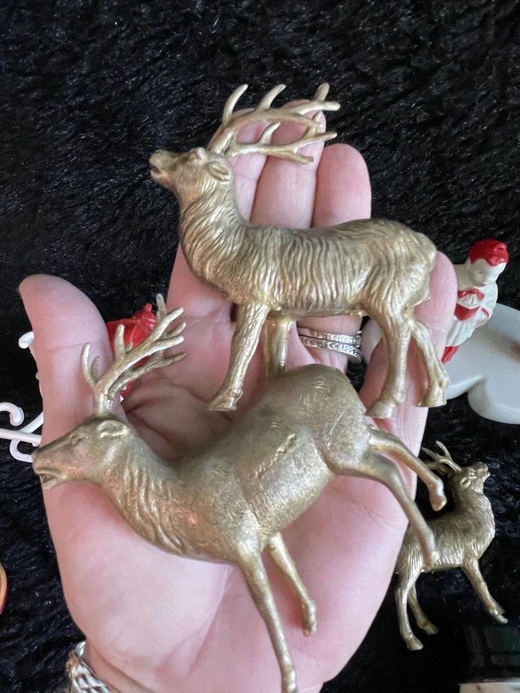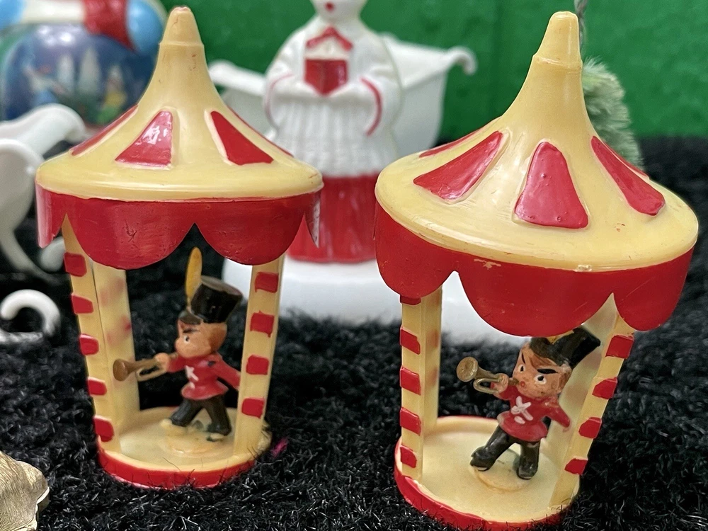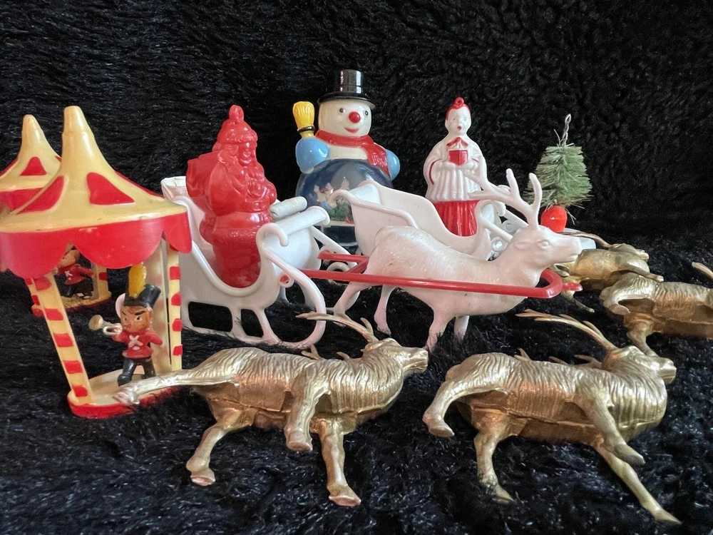 Assorted Lot of Vintage Christmas Hard Plastic Decorations Kitsch Deer Santa Sled Snowman ~Hard plastic Santa open toy pack on his back on sled with one reindeer-all pieces hard plastic. Measures 7 1/2" x 2" x 4". Yellowing of the glue can be seen on the deer. ~There are 2 hard plastic sleds-wear/dirt/slight separation on the back of one. One measures 2 1/4" tall x 4 1/4" x 2" and the other is 2 1/2" tall x 4" x1 3/4". ~4 hard plastic reindeer~ measure 3 1/4" tall x 3" x 1/2". One has a broken side on his antlers/rack. ~White platform with caroler with book and bottle (partial) brush tree measures 5 1/2" x 4" tall x 3". Appox 1" of the top of the bottle brush tree is missing as shown. ~I believe the snowman water globe can be filled with water from the bottom-I did not try to open the clear plug to fill it. Snow is still on the bottom. I can not guarantee it will hold water but I do not see any cracks in the plastic. ~2 4" tall carousel hard plastic ornaments?? with soldiers playing the horn. There are no hooks/clips on the tops of the pieces. Bottoms are marked Hong Kong. ~Weighs 8 oz before a box and packaging. ~I have other lots of vintage ornaments listed for auction this week. Shipping will be combined for multiple purchase. -PLEASE KEEP IN MIND THAT WHEN YOU PURCHASE VINTAGE ITEMS, THEY MAY NOT BE PERFECT AND DEMONSTRATE CHARACTERISTICS OF AGE AND/OR USE. -ITEMS FOUND AT LOCAL ESTATE SALES HERE IN NORTHEASTERN PENNSYLVANIA. -ITEMS ARE SOLD AS FOUND. SOME ITEMS MAY NEED TO BE CLEANED! PLEASE BE SURE TO SEE ALL PHOTOS, AS THEY ARE A VITAL PART OF THE DESCRIPTION!