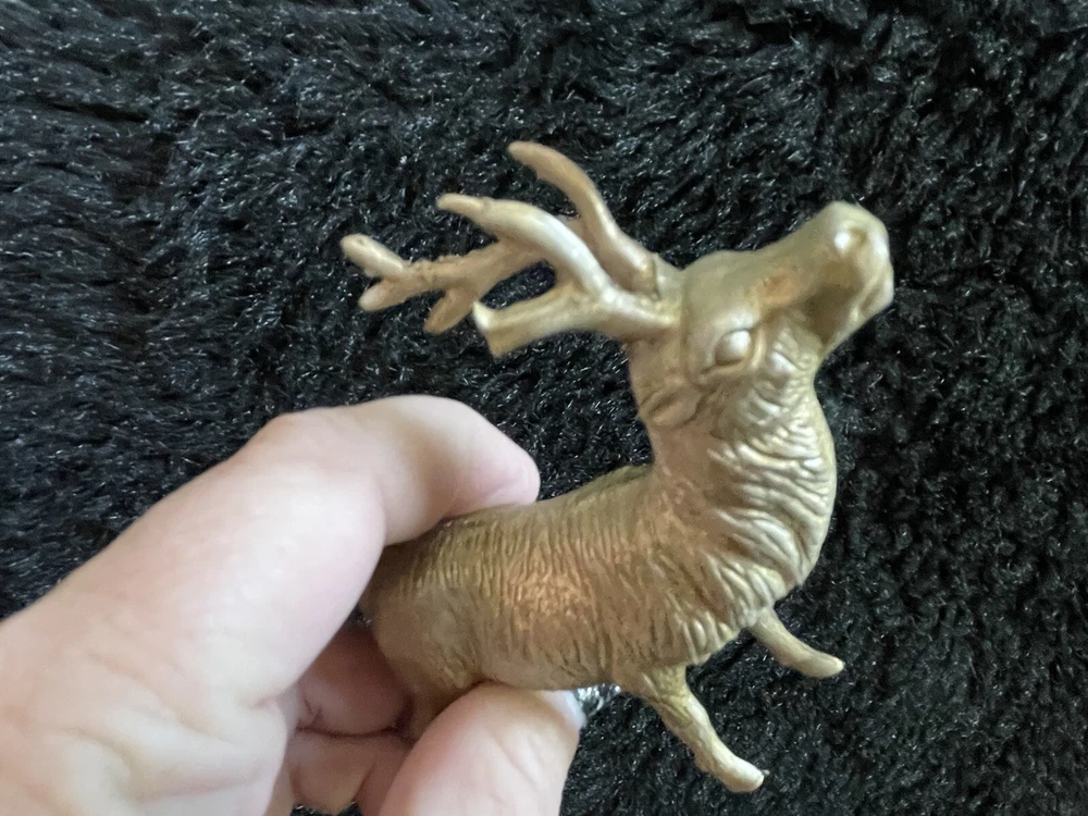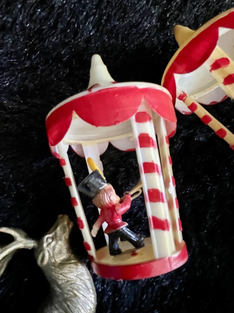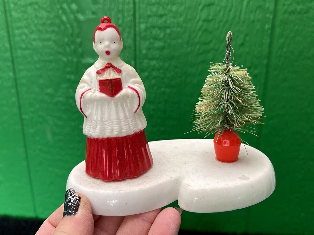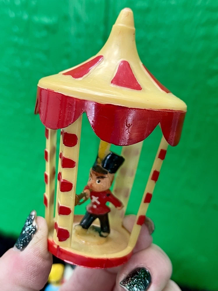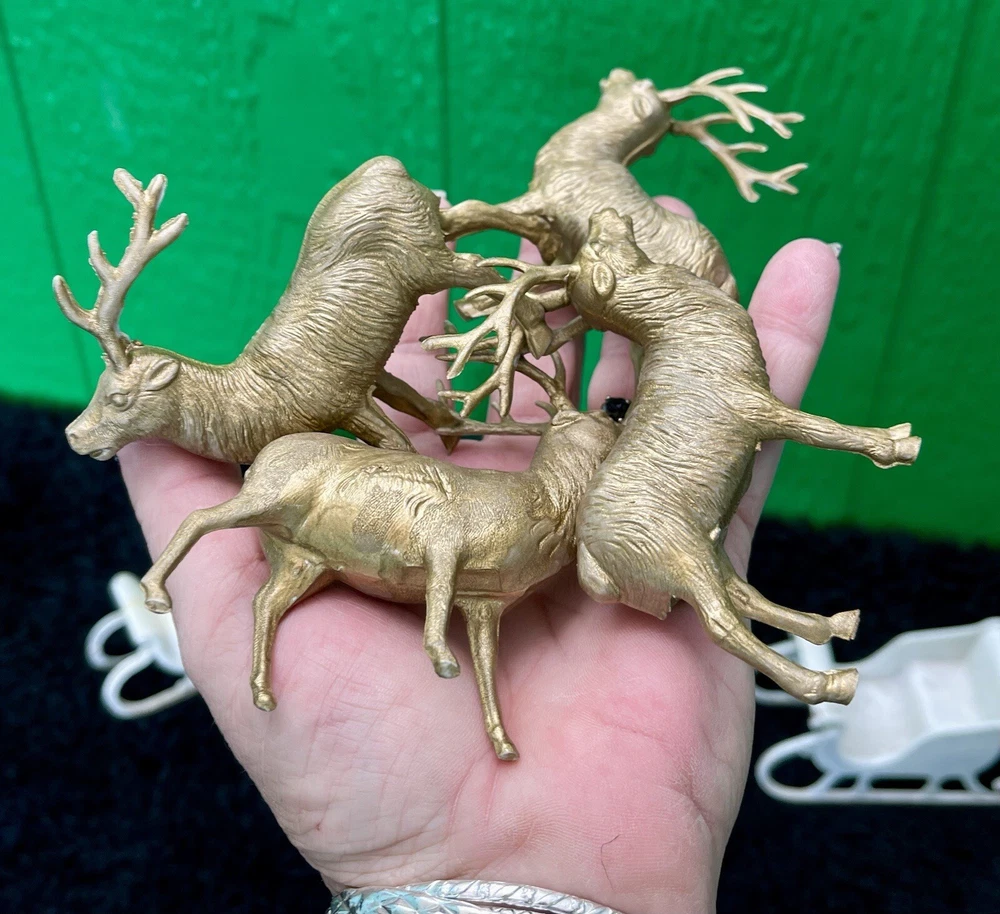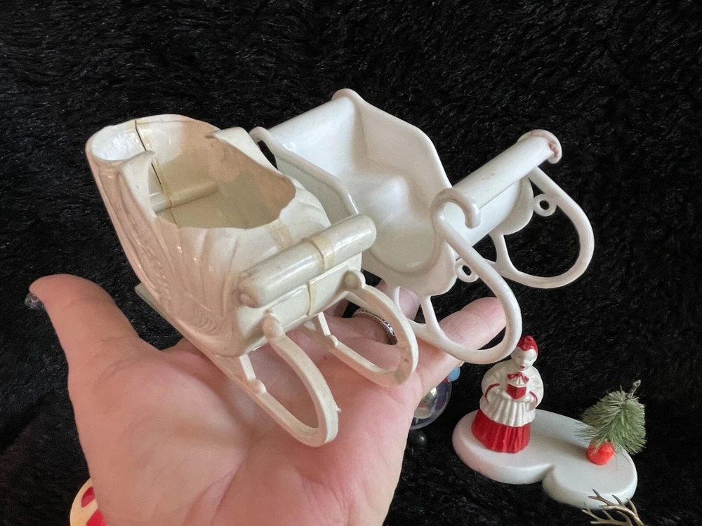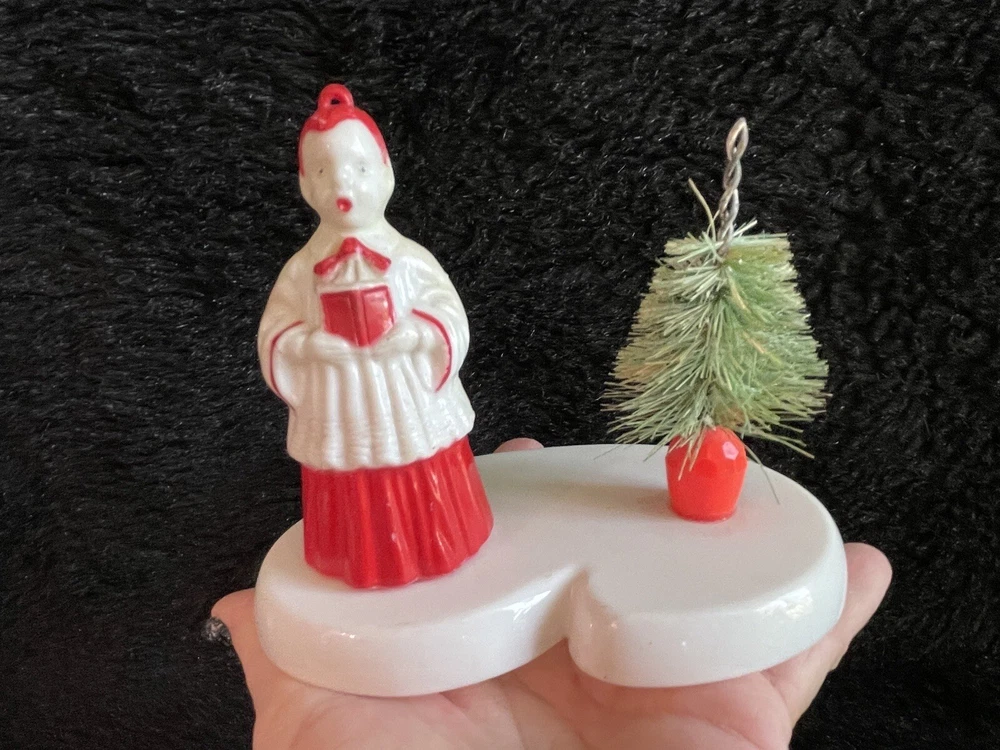 Assorted Lot of Vintage Christmas Hard Plastic Decorations Kitsch Deer Santa Sled Snowman ~Hard plastic Santa open toy pack on his back on sled with one reindeer-all pieces hard plastic. Measures 7 1/2" x 2" x 4". Yellowing of the glue can be seen on the deer. ~There are 2 hard plastic sleds-wear/dirt/slight separation on the back of one. One measures 2 1/4" tall x 4 1/4" x 2" and the other is 2 1/2" tall x 4" x1 3/4". ~4 hard plastic reindeer~ measure 3 1/4" tall x 3" x 1/2". One has a broken side on his antlers/rack. ~White platform with caroler with book and bottle (partial) brush tree measures 5 1/2" x 4" tall x 3". Appox 1" of the top of the bottle brush tree is missing as shown. ~I believe the snowman water globe can be filled with water from the bottom-I did not try to open the clear plug to fill it. Snow is still on the bottom. I can not guarantee it will hold water but I do not see any cracks in the plastic. ~2 4" tall carousel hard plastic ornaments?? with soldiers playing the horn. There are no hooks/clips on the tops of the pieces. Bottoms are marked Hong Kong. ~Weighs 8 oz before a box and packaging. ~I have other lots of vintage ornaments listed for auction this week. Shipping will be combined for multiple purchase. -PLEASE KEEP IN MIND THAT WHEN YOU PURCHASE VINTAGE ITEMS, THEY MAY NOT BE PERFECT AND DEMONSTRATE CHARACTERISTICS OF AGE AND/OR USE. -ITEMS FOUND AT LOCAL ESTATE SALES HERE IN NORTHEASTERN PENNSYLVANIA. -ITEMS ARE SOLD AS FOUND. SOME ITEMS MAY NEED TO BE CLEANED! PLEASE BE SURE TO SEE ALL PHOTOS, AS THEY ARE A VITAL PART OF THE DESCRIPTION!