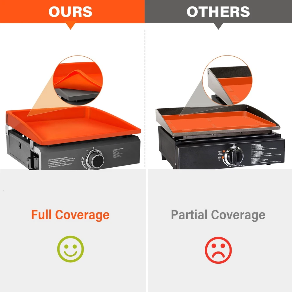 Full Coverage Silicone Griddle Cover for Blackstone Griddles. No one wants their Blackstone grill rusting or getting dirty. Use a silicone protective mat cover to protect the surface and be ready to grill and barbecue anytime. Protection for All Seasons Our silicone bbq grill cover for blackstone covers the cooking surface and wide walls. Effectively keeps out moisture, dirt, bugs and rodents. Thick & Durable Silicone Surface Protector Our outdoor silicone sheet is made of food-grade silicone, waterproof, heat resistant up to 400℉; food safe, foldable. Perfect Fit: Our 17 inch griddle mat measures 17.75 x 16 x 2.5 inches / 45.4x40.5x6cm, Fits 17” Blackstone griddles; All season protection; Note: Measure your griddle before purchasing – especially if it’s a non-Blackstone brand Full Coverage: Our protective silicone mat fully covers the griddle surface and side walls, protects the griddle surface from rust, dust, dirt, debris, critters, bugs and more Heavy Duty & Food-Grade Silicone Mat: Our griddle protector is made of 100% food-grade silicone, thick, durable; heat resistant up to 400℉, DO NOT try to cook food on the griddle cover mat Must Have Griddle Accessory: Silicone toppers for griddle keeps the surface ready to cook and extend your griddle’s service life; no cleaning and prepping the surface after a long storage period Easy to Clean: Our griddle top mat has a smooth surface and is easy to wash by hand or in the dishwasher; super easy to wipe clean; dries quickly