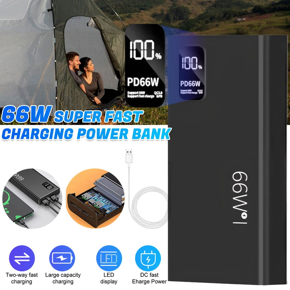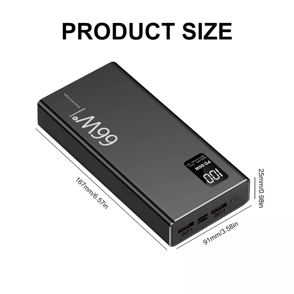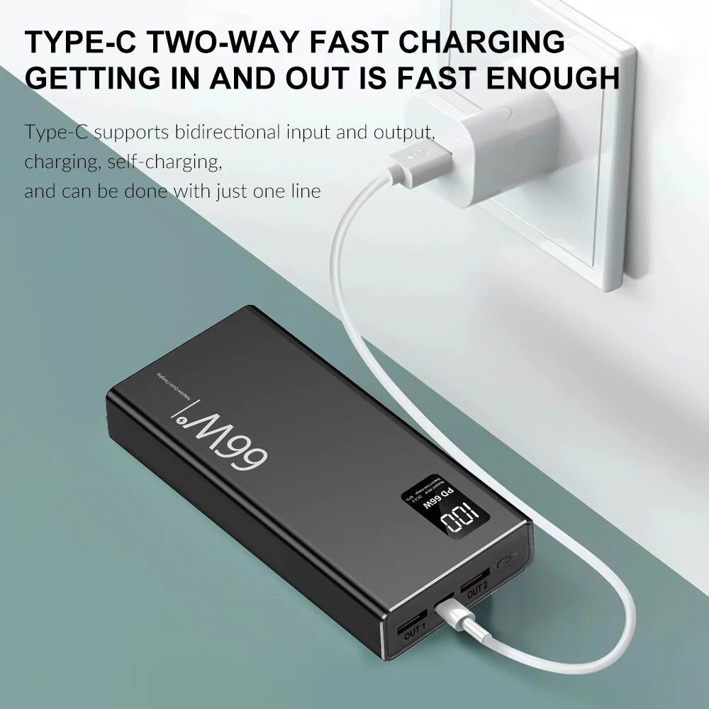 Specification: Item: 66W Super Fast Charge Power Bank Capacity: 30000mAh Input: Micro USB input: 5V/2A Type C Input: PD20W Output: USB Output: 22.5W Type C Output: PD20W Total power: 66W power bank Material:ABS Plastic Color: Black Feature: Support Fast Charge Support PD 20W Two-Way Fast Charging Support PD 3.0 Fast Charging Support Type C Input and Output With LED Digital Display Package Included: 1x Power Bank 1x USB Cable 1x User Manual