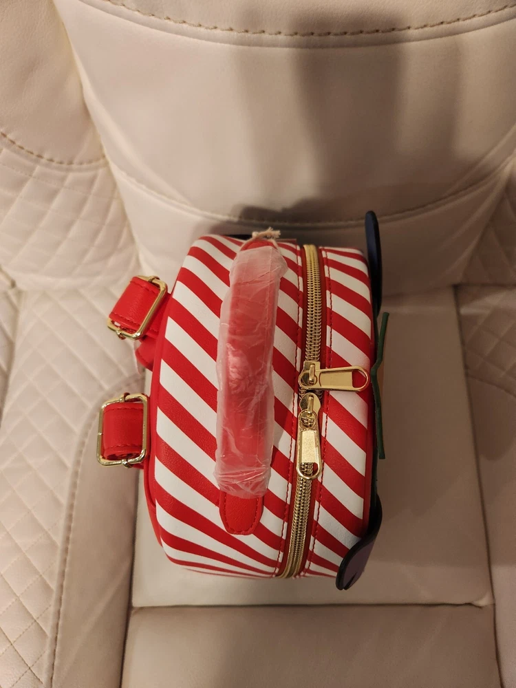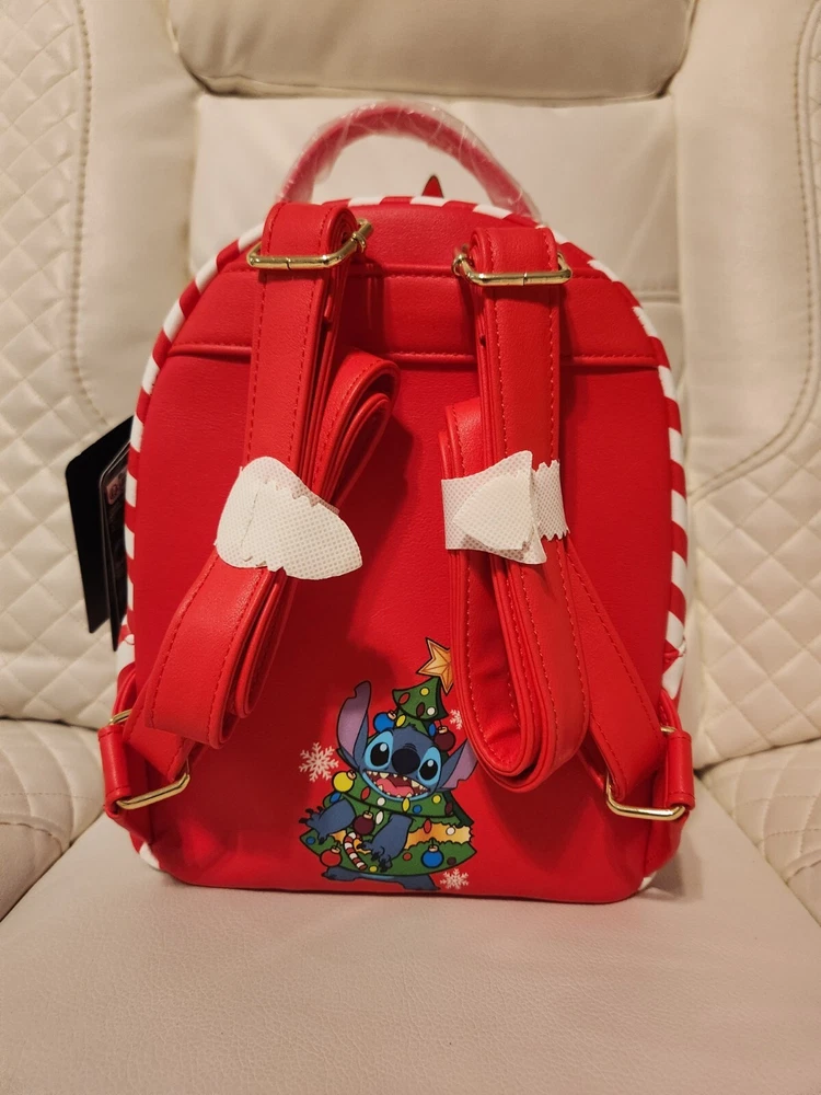 Show off your festive spirit with this Stitch figural mini backpack. It has an appliqued Stitch dressed as a Christmas tree holding a hibiscus ornament and candy cane. The sides have candy cane striping. Adjustable straps and interior pocket. 9" x 4" x 10 1/2" Polyurethane