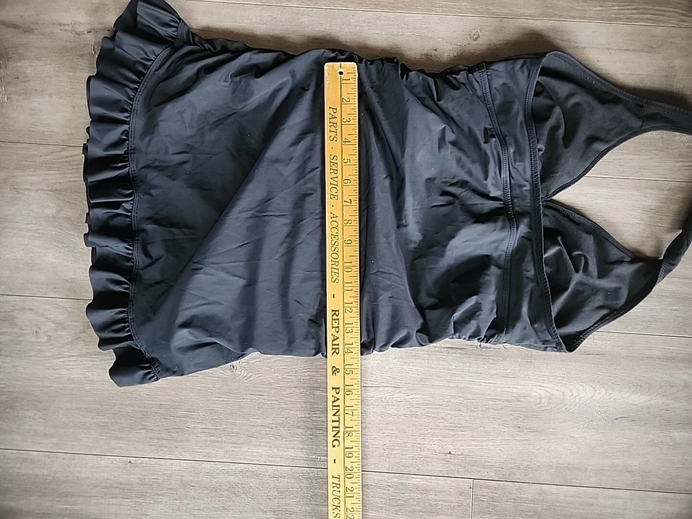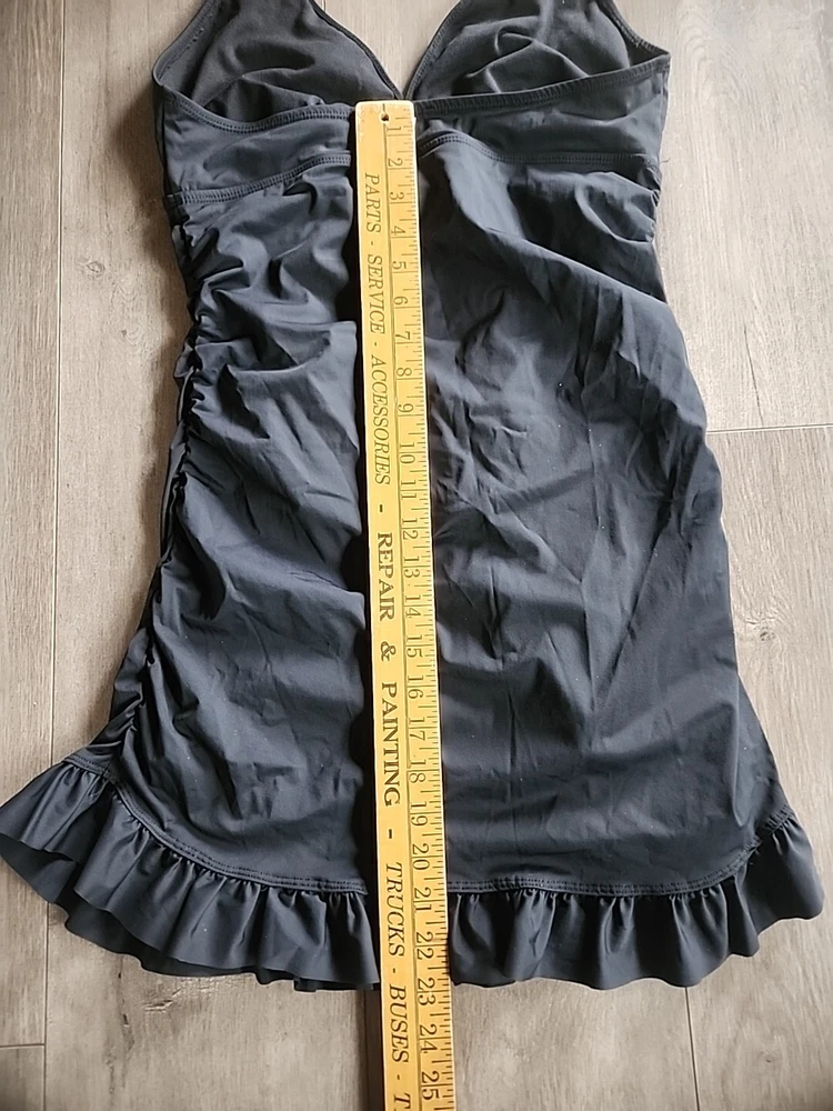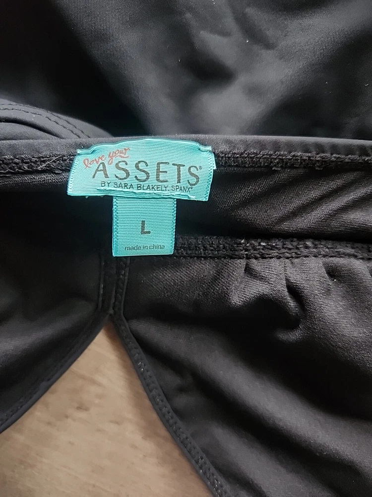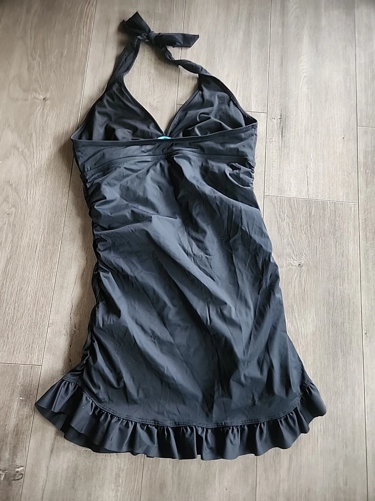 Love Your Assets Sara Blakely Spanx Halter Swim Dress Size L Black Ruffle Skirt - Lightly padded bra area with no inserts. This one piece swimsuit is in great condition Swimsuit is a one piece with a ruffle skirt overlay that makes it look like a mini dress. Perfect for those who want a bit more modesty and slimming look or a retro feel. Size large being spanx runs a little tight due to compression getting on. Great fit once on!! Very nice heavy well made quality. See all the pictures super cute.