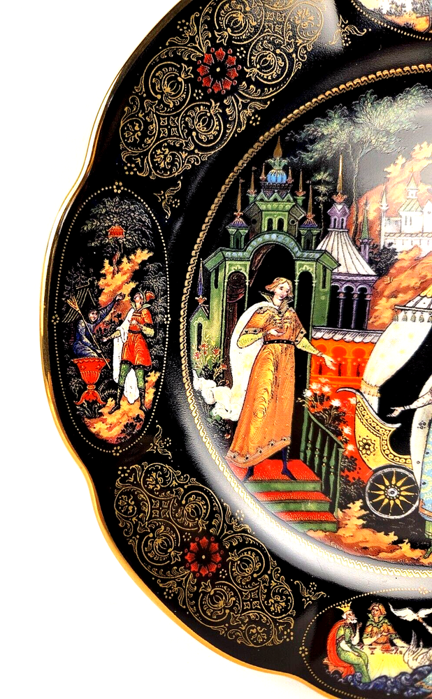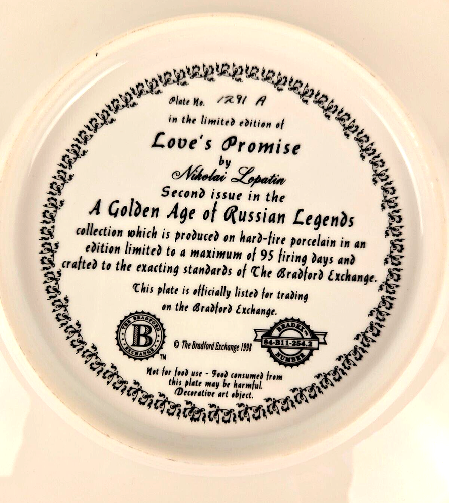 Love's Promise Russian Collectors Plate Bradford Exchange 1998 Ltd Edition This is a beautiful vintage collector plate from the late 20th century (1998) by Bradford Exchange. The round porcelain plate features a multicolor design with gold edging, depicting a theme of love and enchanting beauty from Russian culture. It is part of the "Golden Age of Russian Legends" product line and is a limited edition item. The plate measures 8 inches in diameter and weighs 7 ounces. This remarkable art piece will be a delight to any home decor. Be sure to check out my website for the other pictures in this collection. We carefully pack each item to prevent breakage. We only charge what the shipper charges and cannot control the shipping costs. We do not accept returns/refunds unless item is not as described per eBay policy or the item arrives damaged or broken beyond anything noted in the condition field or pictures. If you have any questions about any of our listed items, feel free to email us.