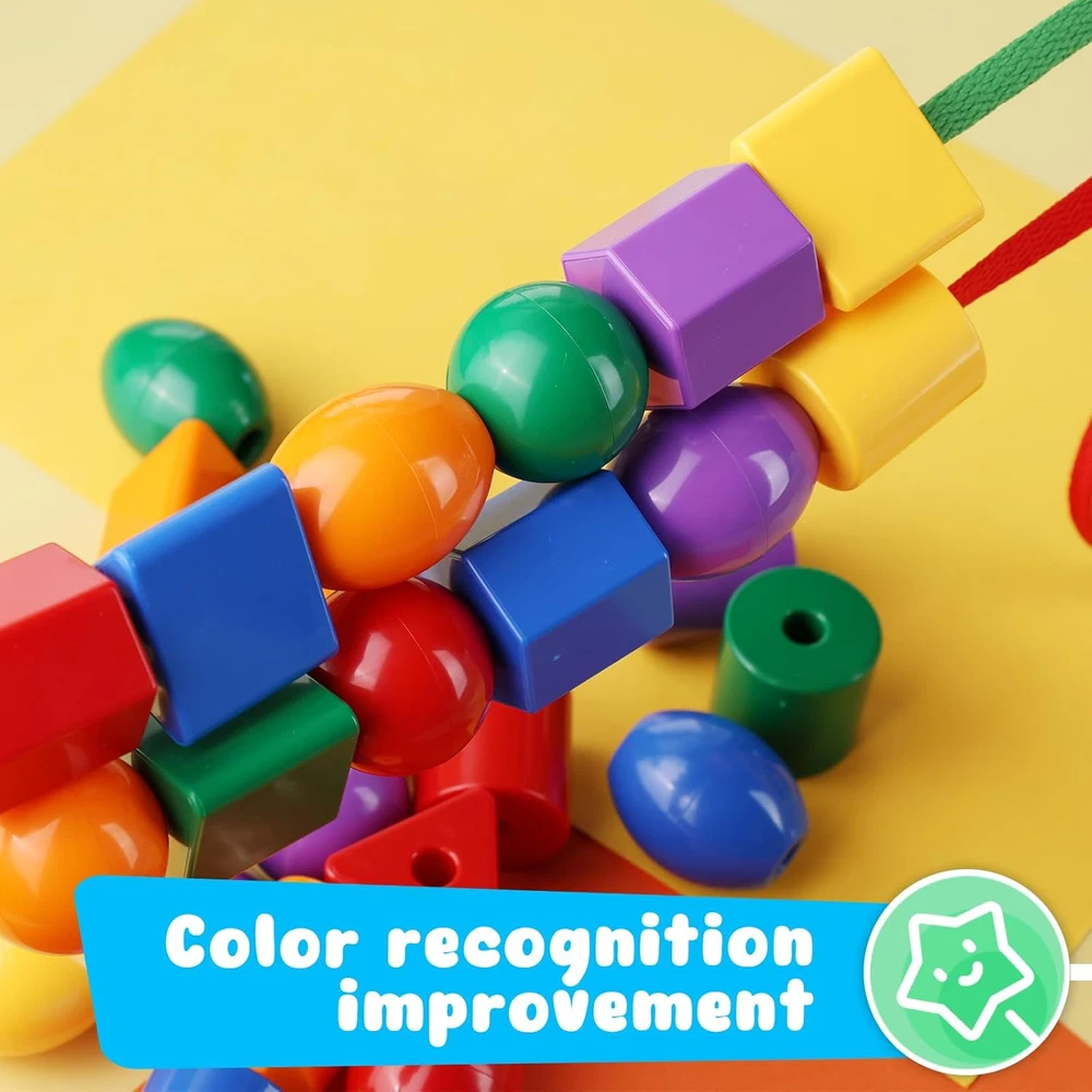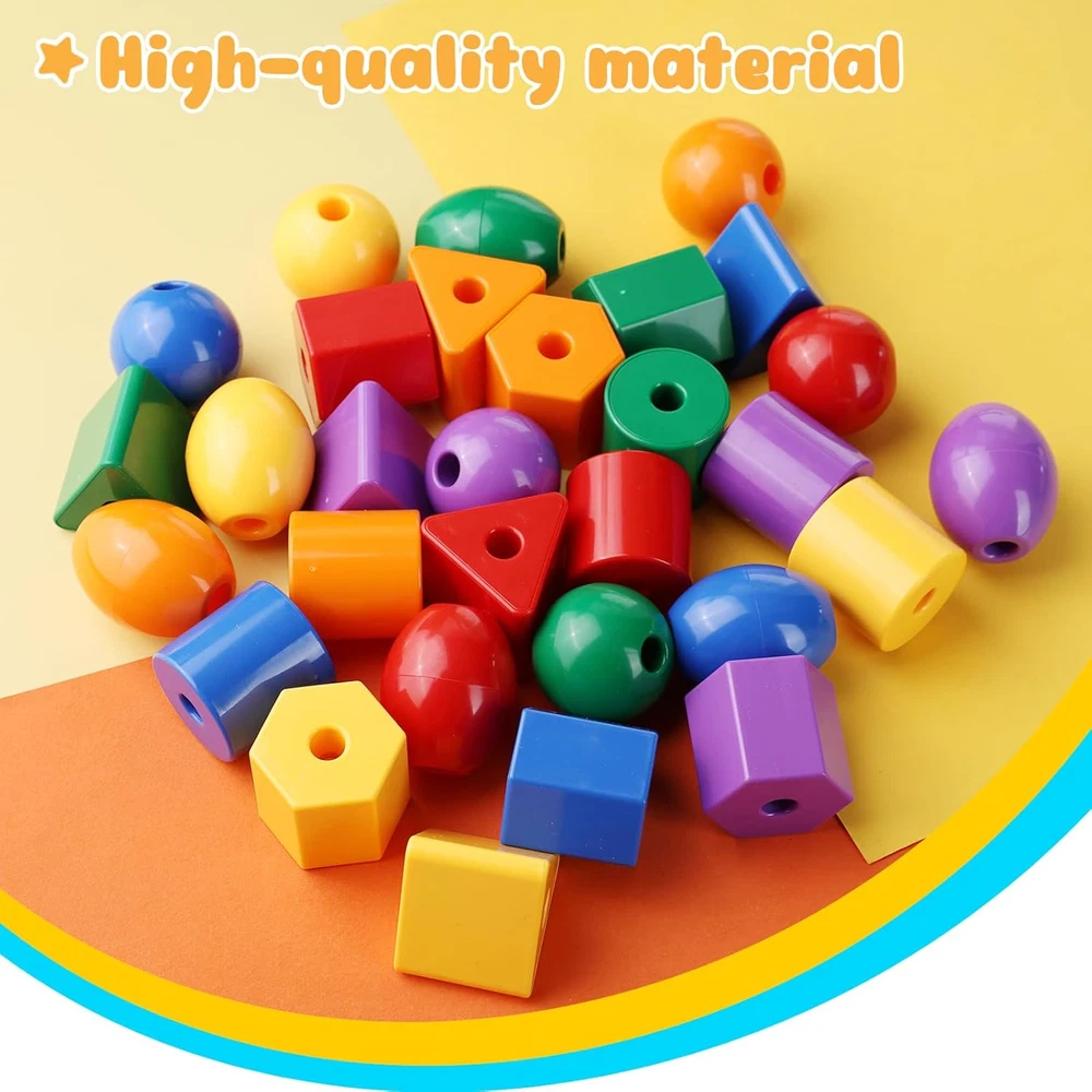 Package Includes - The set includes 30 colored beads and 2 strings. The size of the colored beads ranges between 1 to 1.6 inches, larger beads are easier to string and it comes with a non-woven bag for convenient storage. Premium Quality - The toddler string toy is crafted from high-quality plastic, these materials are safe, environmentally friendly, non-toxic, and odorless. Children can play with them with peace of mind. Rich Colors - The stringing beads come in a total of five different shapes and six vibrant colors, aiding children in identifying shapes and colors as they play. Easy to Clean - The smooth surface of the toddler's stringing beads ensures effortless cleaning, even when stringing beads become soiled. Widely Used - This stringing bead aids in the development of children's fine motor, cognitive, and visual perception skills, fostering hand-eye coordination. Primarily designed for children's toys, it also enhances shape and color recognition, serves as a valuable tool in preschool education, and is ideal for gifting and various other purposes. Product Description The video showcases the product in use. The video guides you through product setup. The video compares multiple products. The video shows the product being unpacked. LOVESTOWN Add to Cart Add to Cart Customer Reviews 4.6 out of 5 stars 27 4.5 out of 5 stars 1,634 4.5 out of 5 stars 331 4.7 out of 5 stars 4 Price $11.99 $ 11 . 99 — $13.99 $ 13 . 99 — Qty 30 36 67 32 Size 1-1.6 inch 1-1.6 inch 1.5 -2 inch multi Material ABS ABS ABS wood Occasions Birthday Birthday Birthday Birthday New Types in Progress ✔ ✔ ✔ ✔