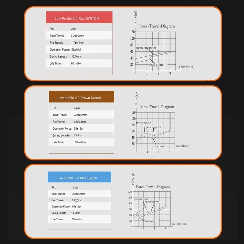 Features: brand-new and high Low Switches for GATERON 2.0 This is a Low only suitable for afew mechanical keyboards, please confirm whether your keyboard can be used normally. Quick-rebound force for actuation,high sensitivity. Specs: 3pin gold-plated 3pins switches With a smooth linear feel and solid reliability for long service life Specifications: Types:Low Blue Switch2.0/Low Brown Switch2.0/Low Red Switch2.0 Quantity: 10Pcs/Set 1.Low Blue Switch2.0: Type: 3-pin Total Journey: about 3.2mm; Action Stroke: 1.7+0.4mm/1.7-0.3mm; Operating Force: about 65gf; Spring length: about 11.5mm; Lifrtime:about 60,000,000times. 2.Low Brown Switch2.0: Type: 3-pin Total Journey: about 3.2mm; Action Stroke: about 1.7mm; Operating Force: about 55gf; Spring length: about 13.5mm; Lifrtime:about 60,000,000times. 3.Low Red Switch2.0: Type: 3-pin Total Journey: about 3.2mm; Action Stroke: about 1.7mm; Operating Force: about 50gf; Spring length: about 13.5mm; Lifrtime:about 60,000,000times. Package Includes: 10PCSx Switches note: No retail package. Please allow 0-1cm error due to manual measurement. pls make sure you do not mind before you bid. Due to the difference between different monitors, the picture may not reflect the actual color of the item. Thank you.