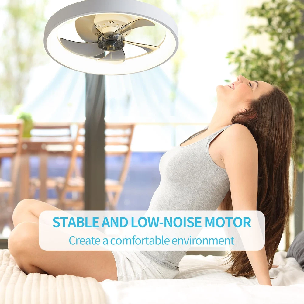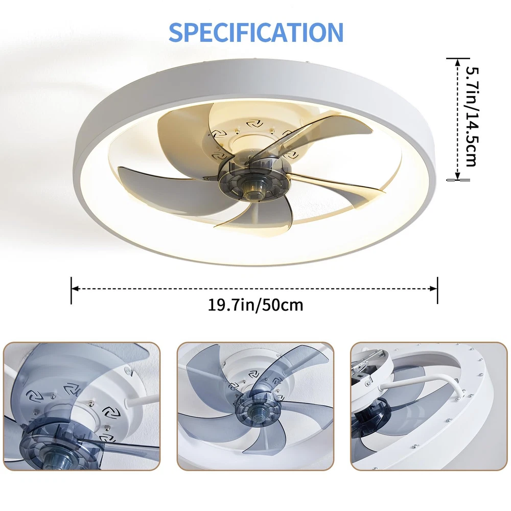 Smart & Dimmable Fan Light: This 19.7" bladeless ceiling fan with light offers smart and dimmable lighting. You can adjust brightness and color temperature via remote control and mobile app. flush mount ceiling fan suits various needs, providing both bright cool tones for workspace illumination and warm, cosy light for relaxation and ambiance 6 Wind Speeds & Night Light: ceiling fans with lights and remote provide 6 wind speeds, reversible airflow, and a timer (1/2 hours) for year-round use. The modern white ceiling fan light can cool your space in summer, circulate fresh air in winter, and even have a night light function for added convenience while sleeping Memory Function & High Brightness: This low profile ceiling fan with light has a memory function, allowing you to save and recall your preferred light settings. It always returns to your desired settings when turned on using the remote control. Our flush mount ceiling fans with lights are perfect for bedrooms, living rooms, kitchens, laundry rooms, dining rooms, offices, utility rooms, etc. They make great home decor items Quiet Motor & Easy Installation: This bedroom ceiling fan with light has a low-noise 110V motor for a peaceful atmosphere. The flush mount design minimizes noise disturbance at any air speed setting. Installation is simple with pre-assembled components. Just connect the wires and mount the fan to the ceiling. A detailed user manual is included in the package Satisfaction Guarantee: 's ceiling fan with light is recommended for 15-25㎡ rooms, providing optimal airflow and lighting for a comfortable environment. Please feel free to contact us if you have any questions with the 19.7'' ceiling fan