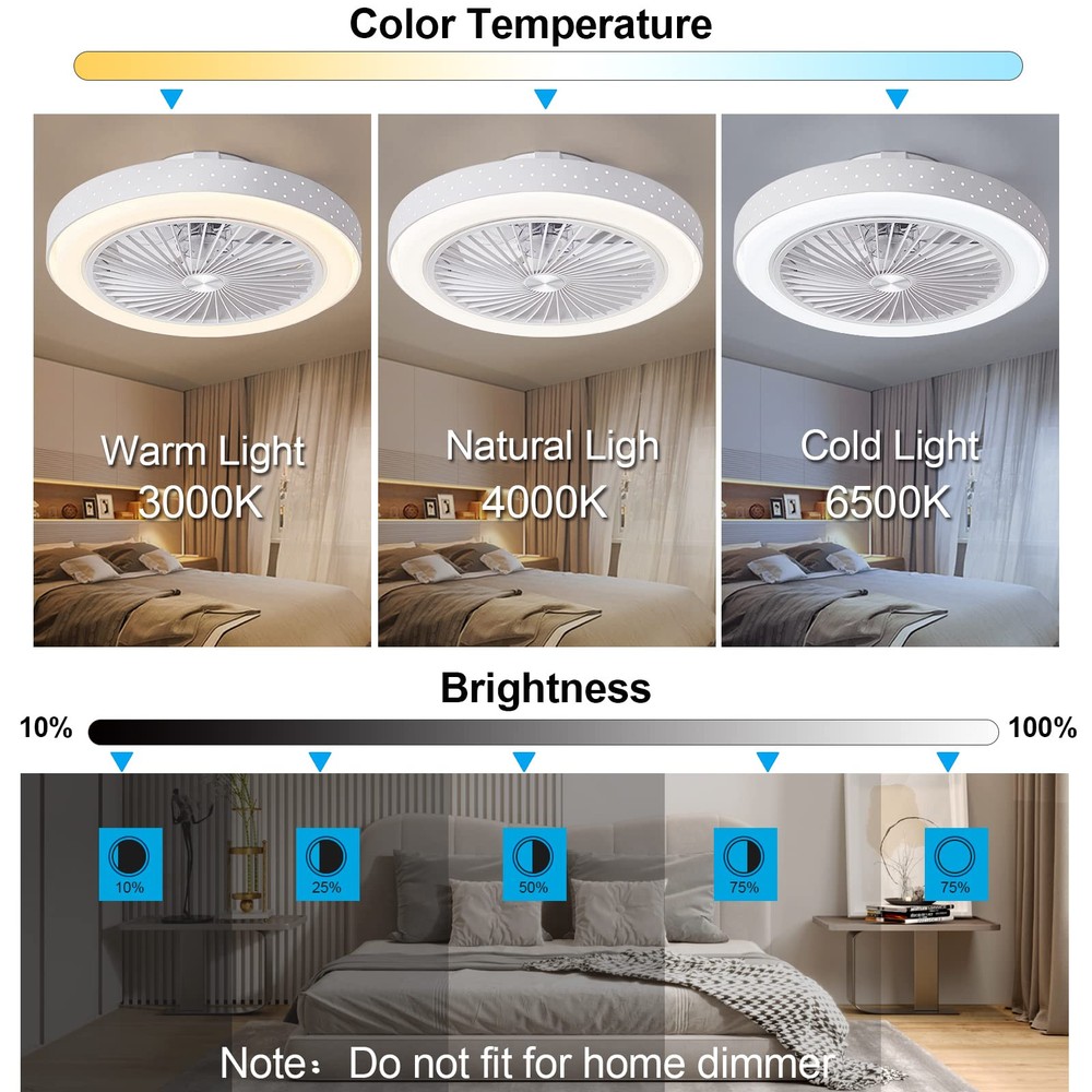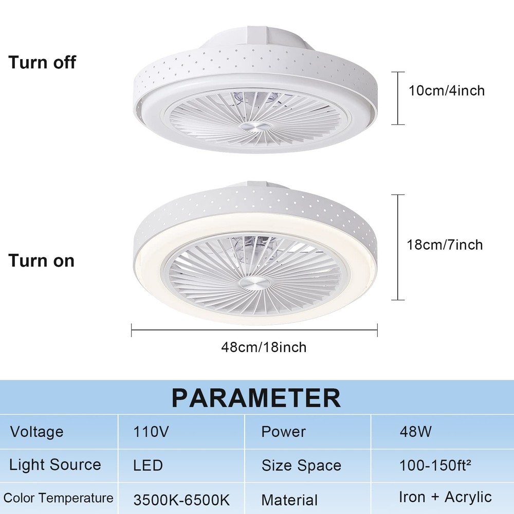 ① Iron Lampshade: Modern ceiling fans with lights are made in metal, with high-grade and durable appearance, which enhances your home decoration style. 19×7 inch ultra-thin design indoor ceiling fan with led light is suitable for low ceiling living room, bedroom, kitchen, attic, dining room, outdoor patio. ②Intelligent Ceiling Fan: Remote control ceiling fans can control the timing mode, and the timing time can be set to 1h or 2h. The light is able to be changed by remote control and the color temperature remains the same status as it was turned off, making it more convenient for you to use. ③ Strong Wind Speed: Bladeless ceiling fan can be adjusted to 3 speeds for good airflow. Hidden 8-blade design, quiet, creating a quiet and comfortable sleeping environment for you. The ceiling fan with light fixture makes it easy for you and your family to enjoy the coolness of the natural wind. The deflector can be removed for easy cleaning. ④High-Quality LED Lamp Beads: The low profile ceiling fan features high-qualiyt LED lamp beads, the light is soft and flicker-free, and the longevity is up to 50,000 hours. 3 color temperatures (3500K-4500K-6500K) can be controlled by the remote control, and the brightness can also be adjusted (10%-100%) to meet various needs of home lighting. ⑤ Safe & Easy to Clean: Enclosed ceiling fan with lights uses a hidden fan blade design, and the dense grille prevents foreign objects from touching the fan blades, ensuring the safety of the ceiling fan. At the same time, the wind deflector can also be easily disassembled. Very convenient, suitable for installation in the kitchen, etc. ⑥ Easy Installation: Ceiling fan with lights flush mount installation design, easy installation (installation instructions and installation accessories are included in the package). brand ceiling fans come with a one-year warranty. If you have any questions, you can contact us anytime, we will reply you within 24 hours. Here you can get the service you want.