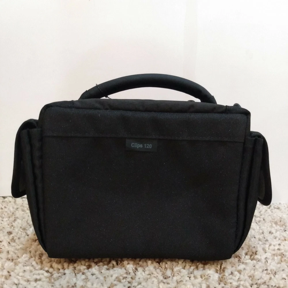 Lowepro Clips 120 Shoulder Bag for Digital Camcorder Black 9"x6"x6". New with tags. Fast, free shipping! * Hinged design provides quick, easy access * Soft, brushed tricot lining protects against dust & scratches * Adjustable divider creates a customized fit. * Media pocket holds 3.5 in DVD-RDL Disks or a mini DV tape. * Easily accessible side pockets hold tapes batteries or personal items * Adjustable shoulder strap and padded handle provide carrying options * Tough water resistant outer fabric protects against moisture