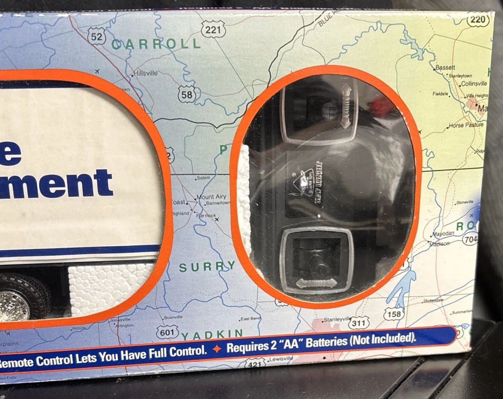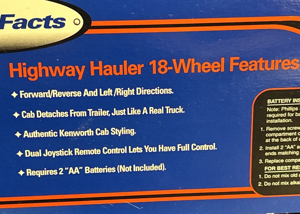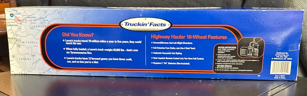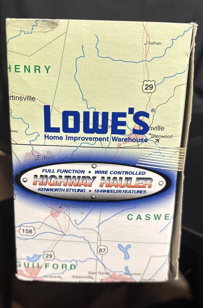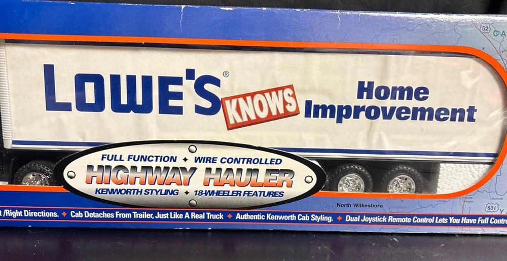 Lowe's KNOWS Stores Remote Control Toy Truck 18 WHEELER SEALED 23”x6”x4, box is still sealed ,BATTERIES NOT INCLUDED NEEDS 2 AA BATTERIES, box has some bending on corners plastic and semi truck and trailer in good shape, tape is still on sides sealing the item in. (SEE PICS) USPS GROUND ADVANTAGE, PAYPAL AND MONEY ORDER ACCEPTED, item will be shipped in a box, and bubble wrapped, also will send pics as I packed, tried to show instructions best I can as well in pics.