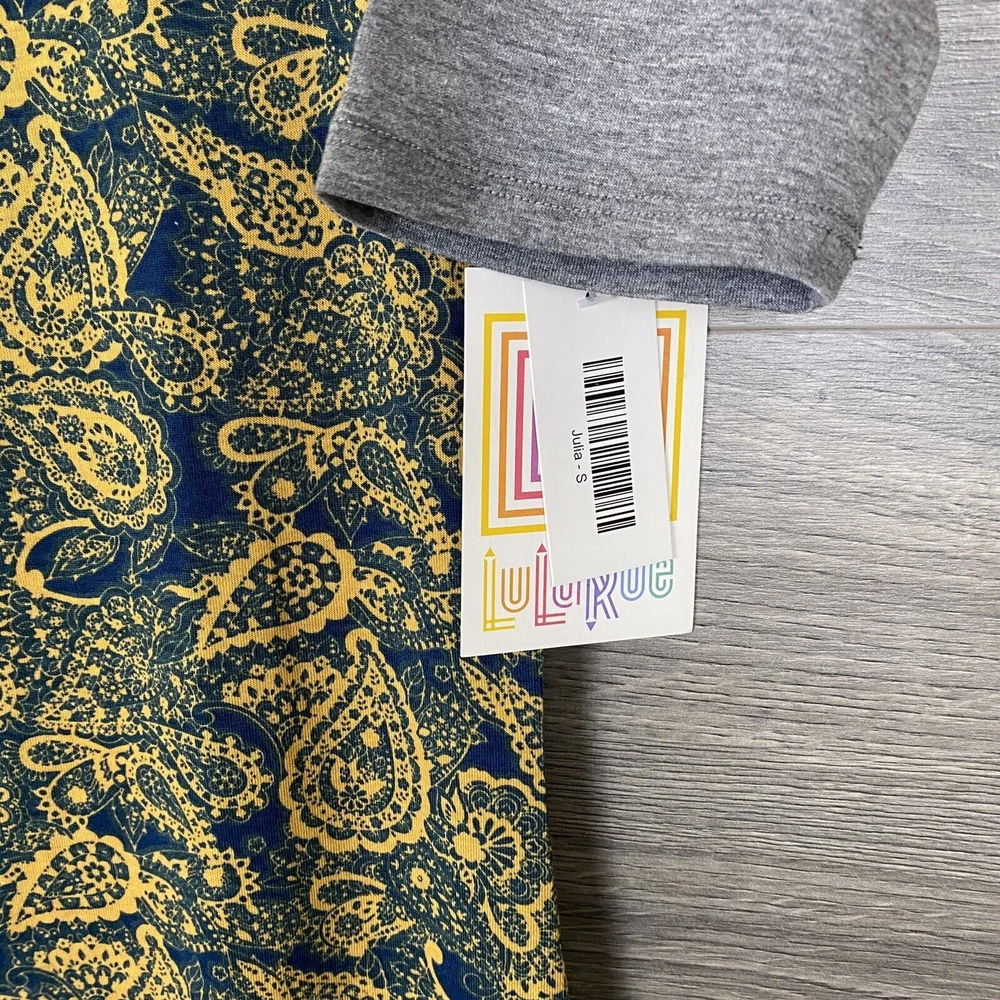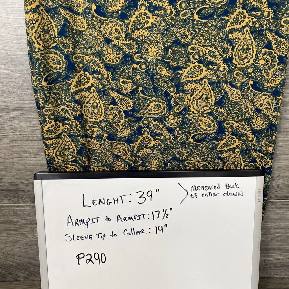 Item is brand new with tags. Actual Size measurements are in the photos, as well as lularoe sizing chart. See photos for exact item you will receive. Thank you Measurements are done as follows: Armpit to Armpit - Garment Laying flat is measured from Armpit seam to Armpit seam across the chest of the garment. Length- Garment Is hanging and measured from the Back Top Of the collar down to bottom seam. SLEEVE length- Garment is measure from end of sleeve across the top to sleeve to the collar.