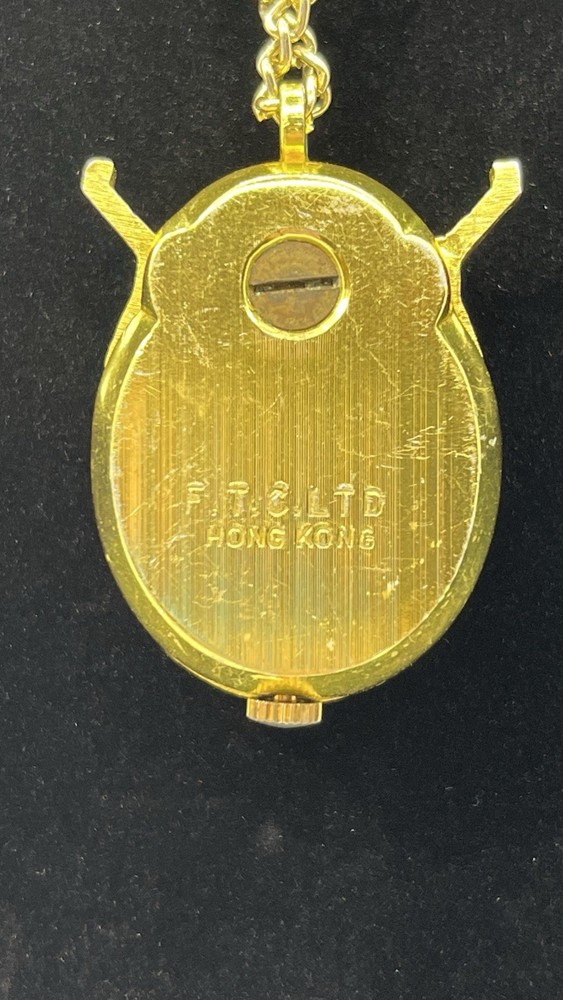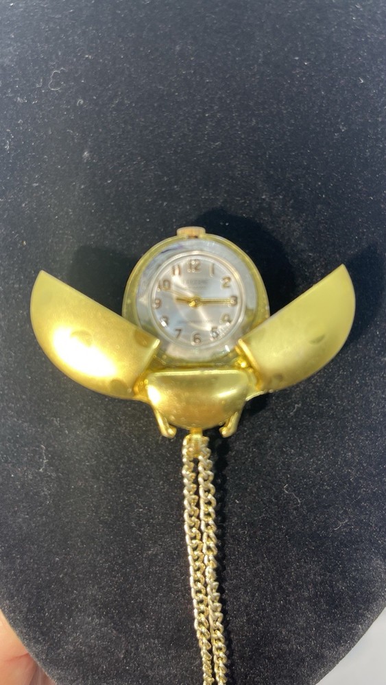 This Lucerne Lady Bug Necklace Watch features a charming design with a yellow gold case and a pearl dial. The unique feature of this vintage piece is that the wings of the ladybug open and close. It is made of gold-plated material and was manufactured in Hong Kong. Although it is not currently working and needs to be cleaned, this necklace watch would make a stylish accessory for women who appreciate vintage jewelry.