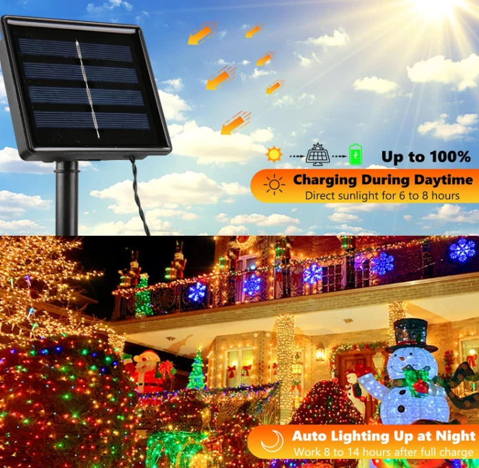Luces solares navideñas, paquete de 2, 144 pies, 400 LED, resistentes al agua... Energía solar y encendido/apagado automático: estas luces navideñas solares multicolor utilizan energía solar, lo que elimina los costos adicionales de electricidad y los reemplazos de batería. El sensor de luz carga las luces durante el día y las enciende automáticamente por la noche 8 modos y función de memoria: use los botones de encendido/apagado y modo para seleccionar entre 8 modos de iluminación. El chip de memoria incorporado guarda su última configuración de modo, por lo que no necesita restablecerlo diariamente Impermeable: con una clasificación IP65, estas luces navideñas solares están diseñadas para soportar todas las condiciones climáticas, incluidas las fuertes lluvias y la nieve, lo que las hace adecuadas para uso en interiores y exteriores Fácil de instalar: paquete de 2, cada cadena de 72 pies (incluido un cable de 6,5 pies) con un panel solar y una estaca de tierra es ideal para envolver árboles o decorar varios espacios al aire libre. Asegúrese de que el panel solar esté expuesto a la luz solar Cadena de luces solares de uso generalizado: estas cadenas de luces alimentadas por energía solar son perfectas para Halloween, Navidad, bodas, días festivos, jardines, patios, céspedes, cercas, porches, árboles, techos y terrazas Especificaciones: Color del LED: Multicolor Configuración: Exterior Cantidad de LED: 200 LED Panel solar: 2 V/300 mA Tipo de batería: Batería recargable NI-MH de 1200 mAH Fuente de luz: LED Interruptor: ON/OFF, MODE Modos de funcionamiento: 8 modos de iluminación Tiempo de carga: 6-8 horas Longitud total: 72 pies (22 m) Longitud entre 2 bombillas: 3,9 pulgadas (0,1 m) Longitud desde el panel solar hasta el primer LED: 6,5 pies (2 m) ¿Qué hay en la caja? 2 x 200 luces LED solares de cadena 2 x Panel solar con estaca de tierra 1 x Manual del usuario NOTAS 1. ¿Cómo comprobar que las luces de cadena funcionan durante el día? A. Cubra completamente el panel solar, las luces de cadena se encenderán. B. Si no es así, deje el panel solar al sol durante una hora y luego vuelva a cubrir completamente el panel solar y debería encenderse. 2. Asegúrate de que el panel solar NO esté protegido del sol, ya que necesita absorber suficiente energía del sol. 3. SOLO está diseñado para protegerse de la lluvia. NO lo sumerjas en el agua. 4. La cadena de luces solares tiene función de memoria. Volverá a su configuración anterior cuando la apagues y la enciendas de nuevo. 5. El panel solar tiene una función de sensor de luz, por lo que puede apagarse automáticamente al amanecer y encenderse al anochecer. Condiciones de venta y comentarios: Los comentarios son muy importantes para nosotros y para eBay. Si estás satisfecho con nuestra transacción, tómese un momento para dejar un comentario positivo. ¡SU satisfacción es nuestra prioridad número uno! Si hay algún problema, POR FAVOR contáctenos ANTES de dejar una calificación neutral o negativa para que podamos resolver cualquier inquietud. PROMETEMOS que podemos hacerlo feliz si nos da una oportunidad justa.