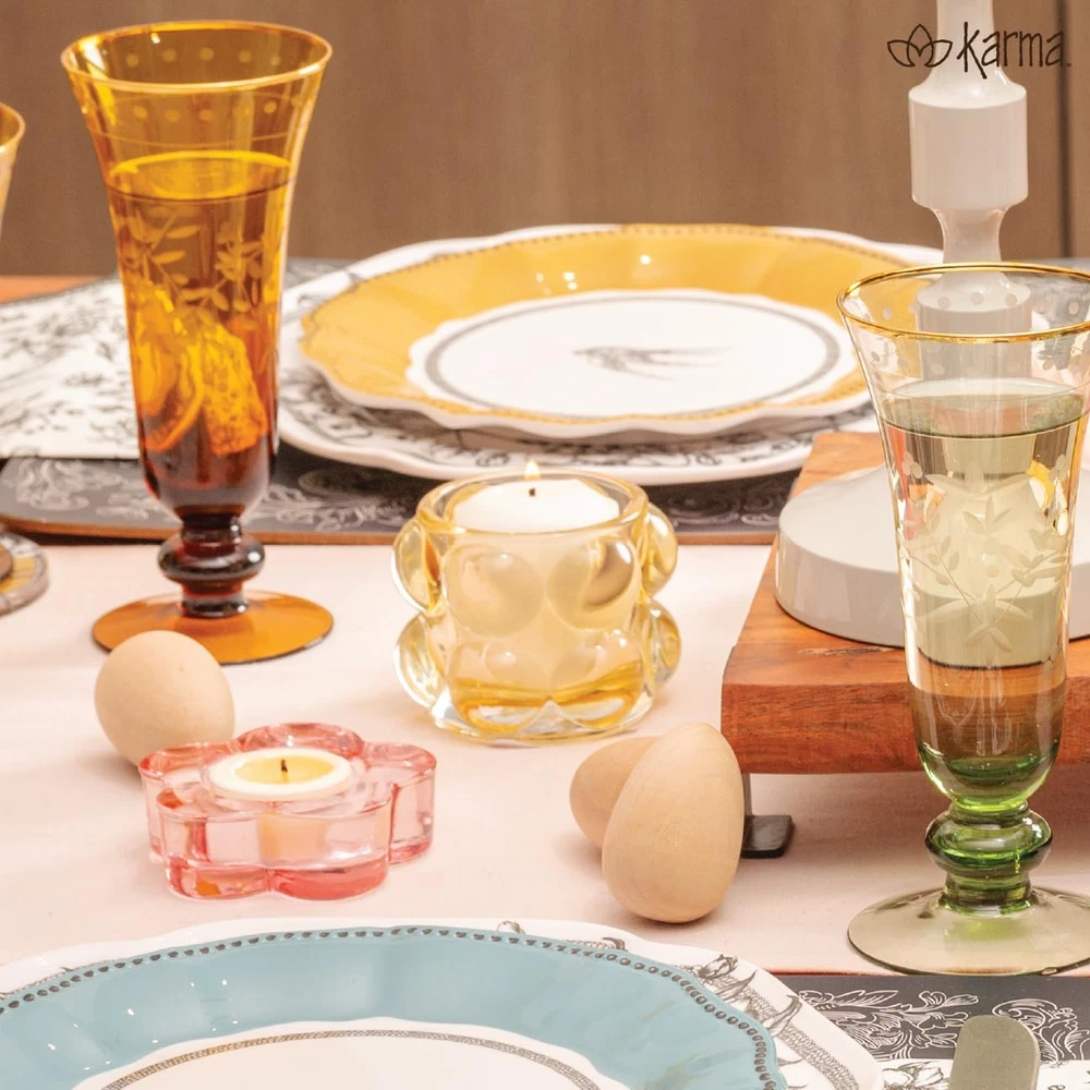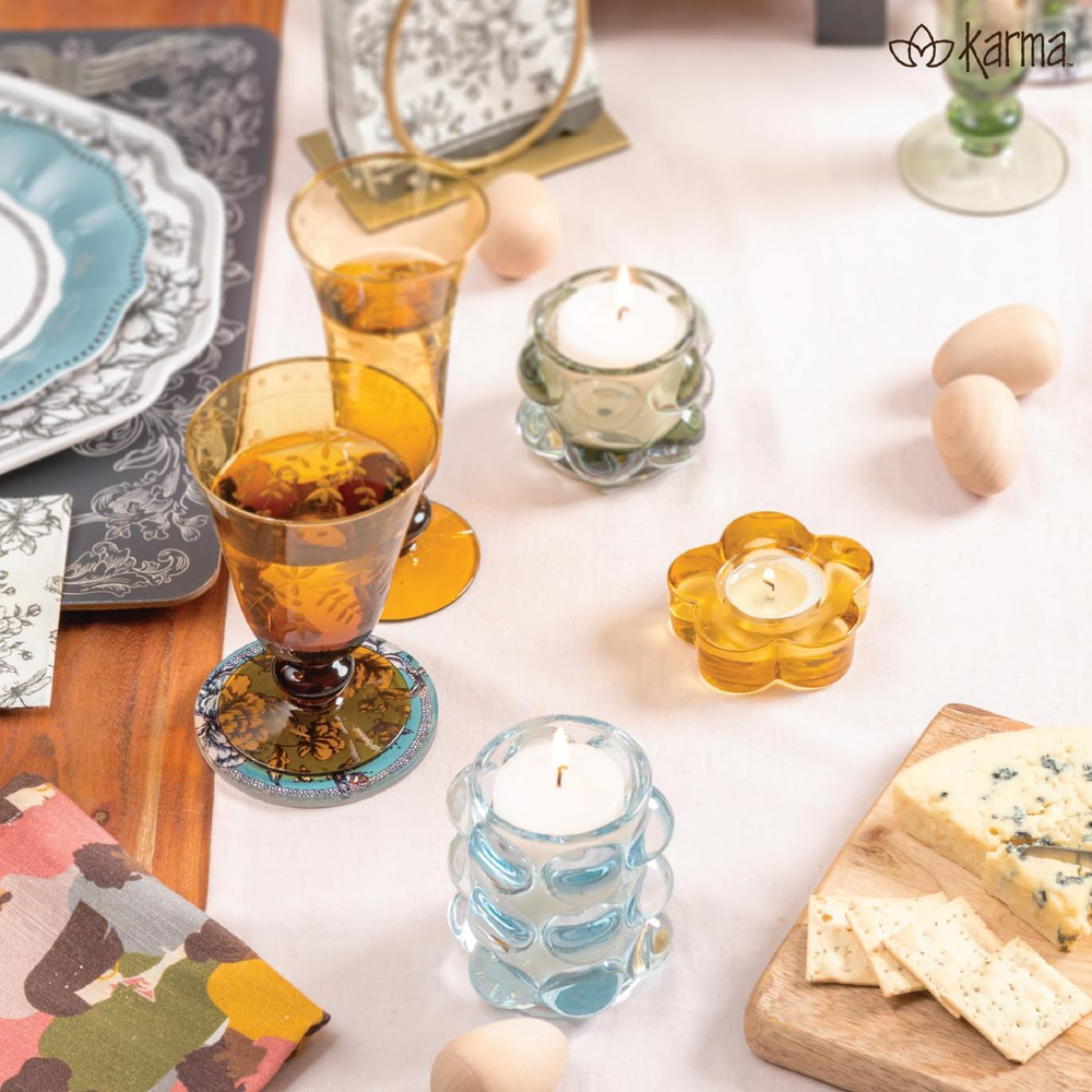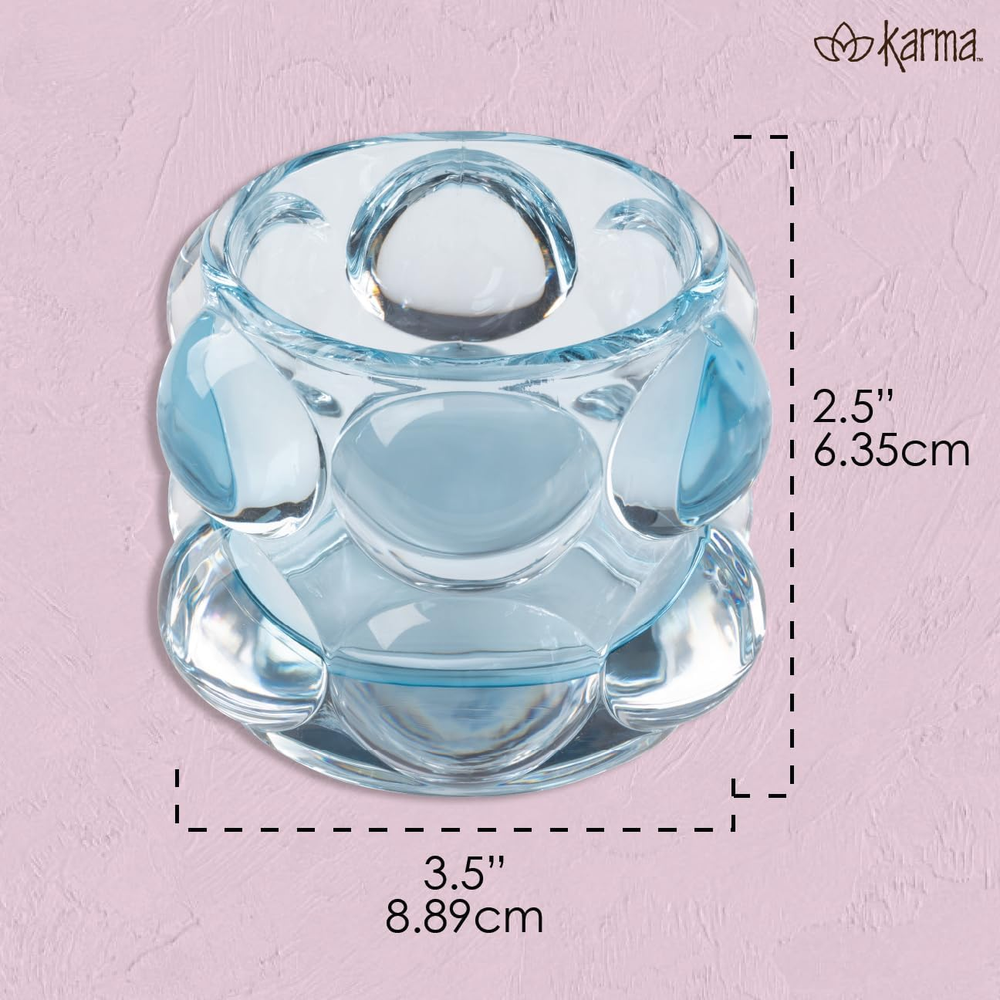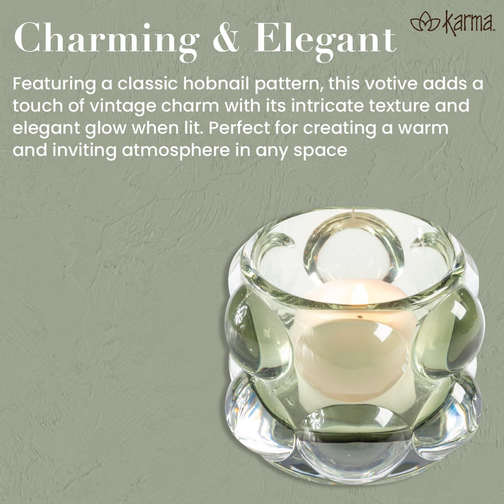 Charming & Elegant Design – A petite version of the bestselling Hobnail Votive, featuring a whimsical yet sophisticated look that’s perfect for holding tealights and enhancing your space. Versatile Home Accent – Available in a variety of colors, allowing you to mix and match to complement any décor style, from modern to vintage. Compact & Functional Size – Designed with a convenient size of approximately 3.25" in diameter and 2.50" in height, making it ideal for small spaces, shelves, or tabletops. Easy to Clean & Maintain – Hand wash recommended to preserve the clarity and beauty of the glass, making it a hassle-free addition to your décor collection. KARMA: We offer stunning and functional gifts and décor with unique, thoughtful designs and positive sentiments. Choose from our exclusive and expansive line of bags, stationery, travel accessories, apparel, and home goods for any occasion. Introducing the Lucia Tealight Votive, a smaller version of our bestselling Hobnail Votive. This charming votive is perfect for holding tealights and comes in a variety of colors to match your home décor. Don't miss out on this whimsical and functional addition to your space! Details Available in an array of colors Dimensions Approx. 3.15"D x 2.50"H Materials Glass Care Tips Hand wash