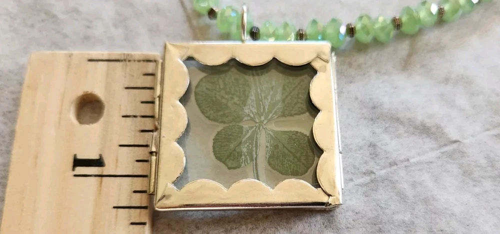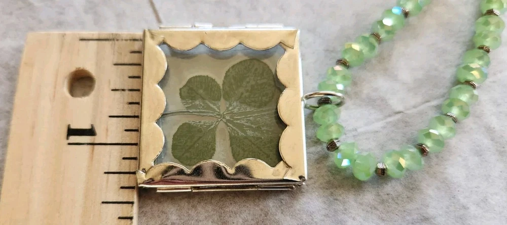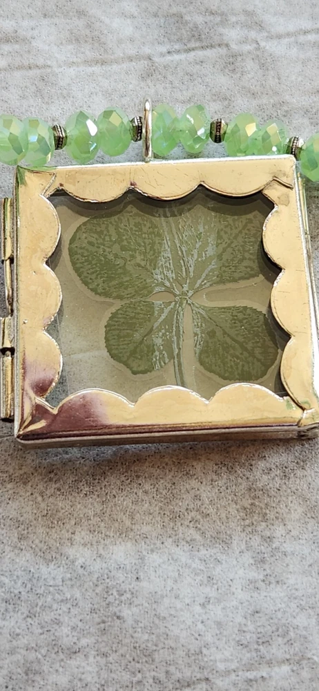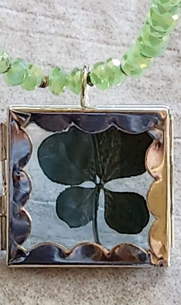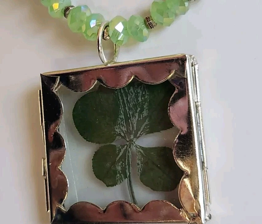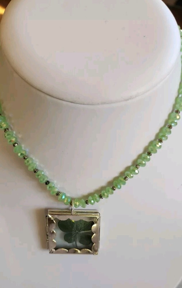 REAL 5 LEAF CLOVER /LUCKY/ST PATRICKS DAY Clovers are found in the Pacific North West grew naturally in the wild. Since the four leaf clover is naturally grown it is rare in shape Clover is laminated and painted green maintain color LIGHT green faceted beads 4 LEAF CLOVERS REPRESENT FAITH HOPE LOVE LUCK