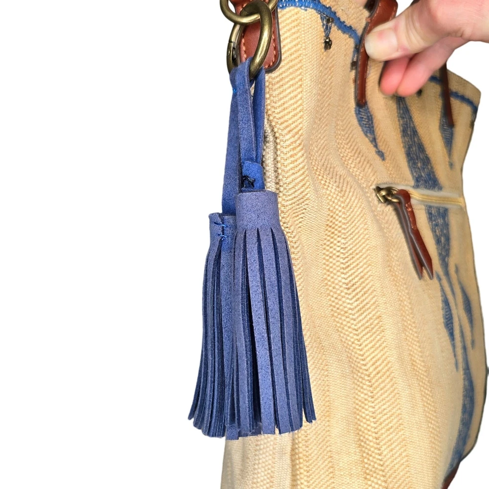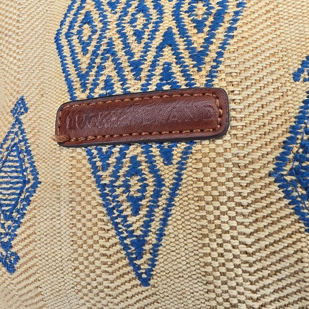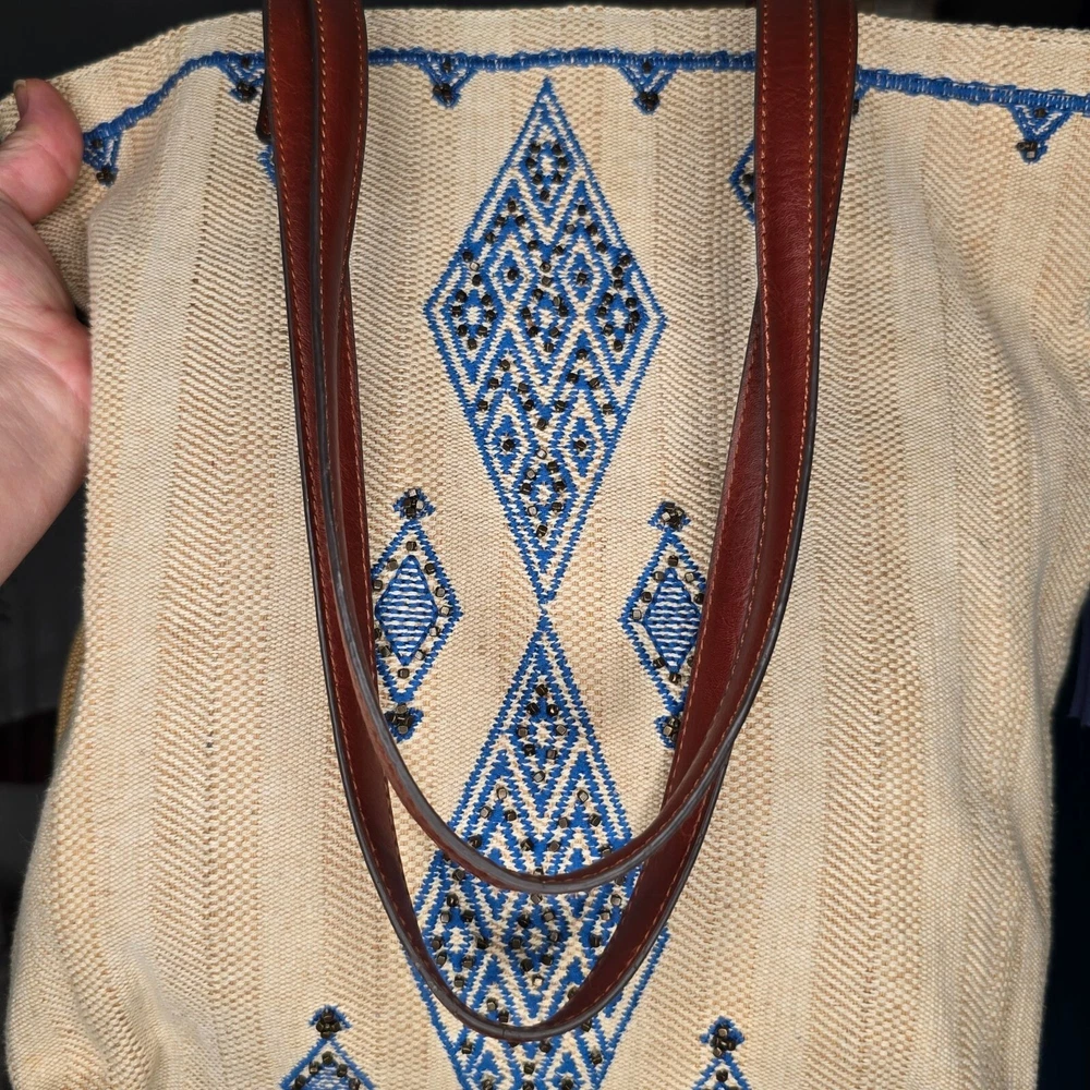 Spacious and stylish tote bag with intricate blue patterns, ideal for daily use. Durable leather straps and secure zipper closure. • Snap closure • Leather straps • Spacious interior • Intricate blue patterns • Durable materials Features: • Beaded Detail • Tassel Detail • Inside Pockets • Southwestern Style, Single Compartment Size: Womens Medium Size Bag Measurements: Length 14 in / 36 cm Width 4.5 in / 11 cm Height 13 in / 33 cm Chain Drop 13 in / 33 cm Condition: Pre-Owned Good Very Good condition Gently used No rips, stains, tares, or pilling No visible signs of wear Measurements are found in the description Please review all photos and descriptions closely before purchasing. Thank you! Smoke free workspace Please read the description for further details and measurements, Thank you!