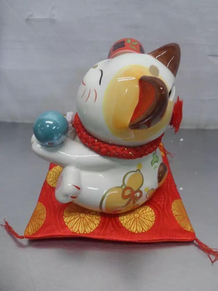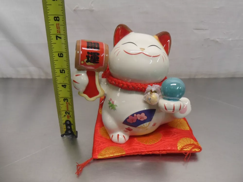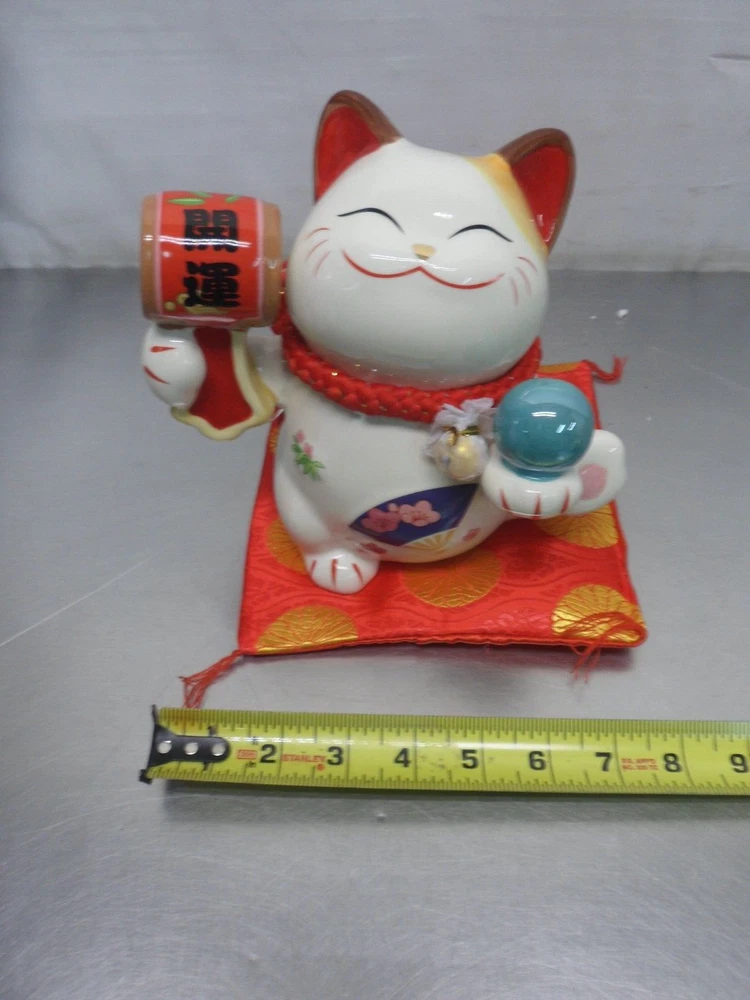 What this piggy bank can offer you is that can be a perfect decoration as it has the cute cat appearance and fine workmanship. As a wonderful gift for your family, friends, relatives and others, this piggy band is a symbol of good fortune, wealth and happiness. Made of ceramic, it is very durable and eco-friendly. Bring good luck with this kitty bank statuette. This ornate kitty bank statuette is made from high-quality ceramic. It's intricately detailed, featuring a red hammer with words "Lucky" written on it, a blue orb, and a real bell. Comes with a red cushion. Great for birthday gifts, or for a new house. Brand New Happy Bids Free Shipping