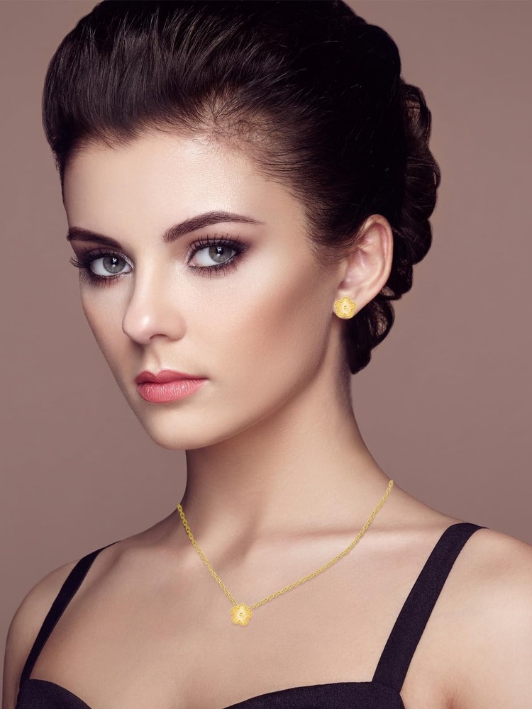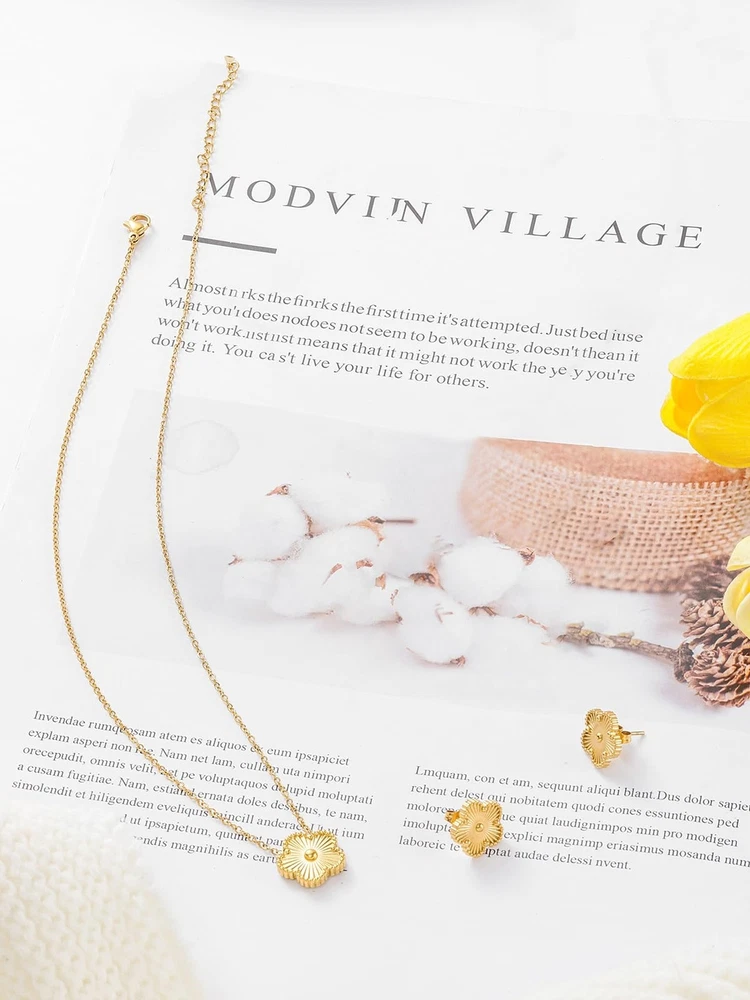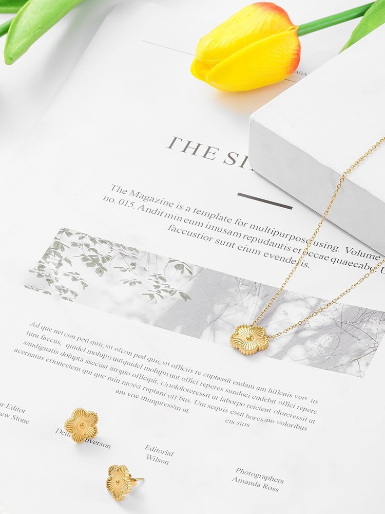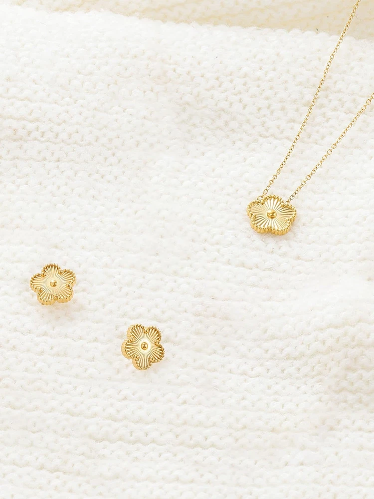 Lucky Four Leaf Clover 14K Gold Necklace and Stud Earrings Set for Women